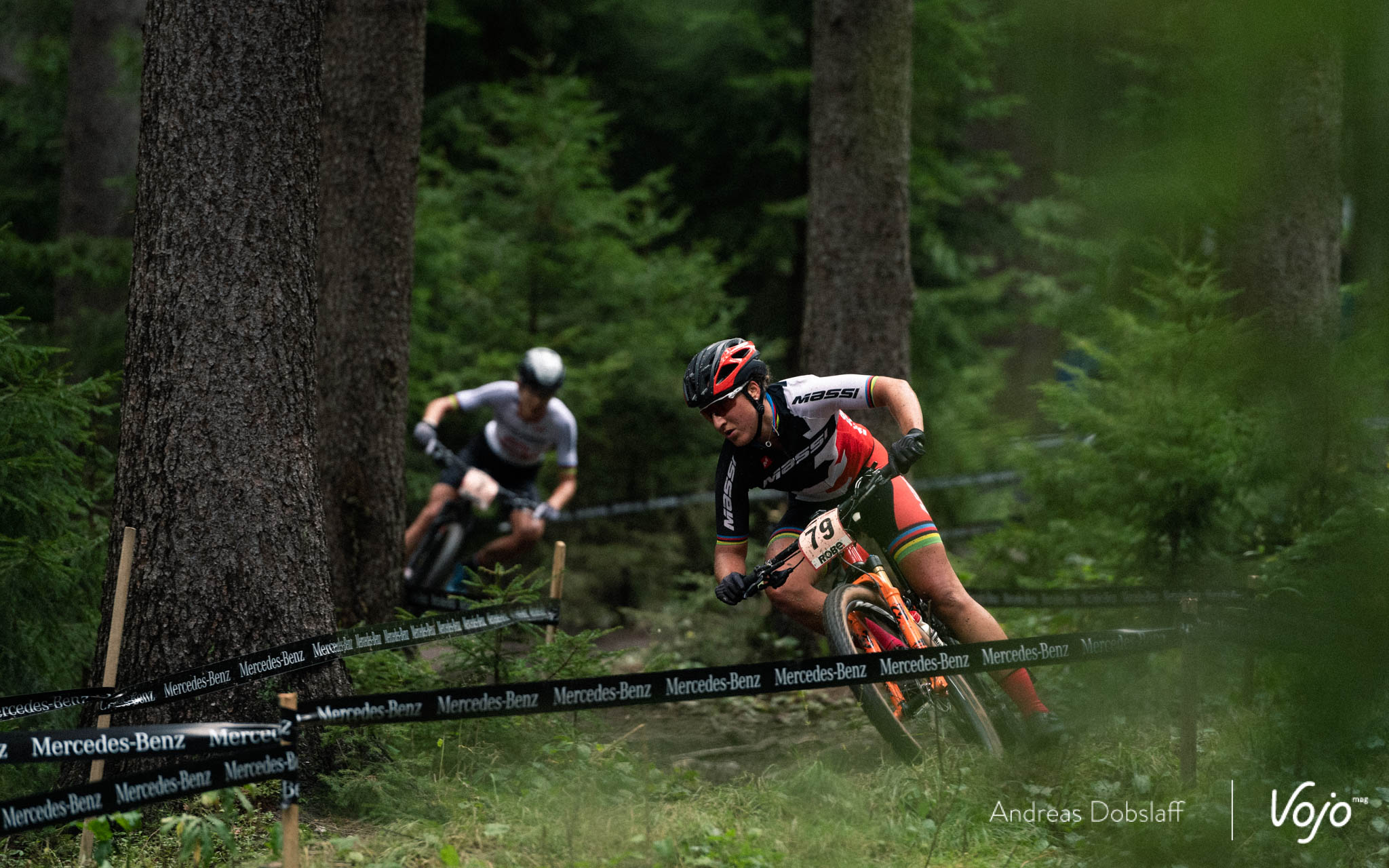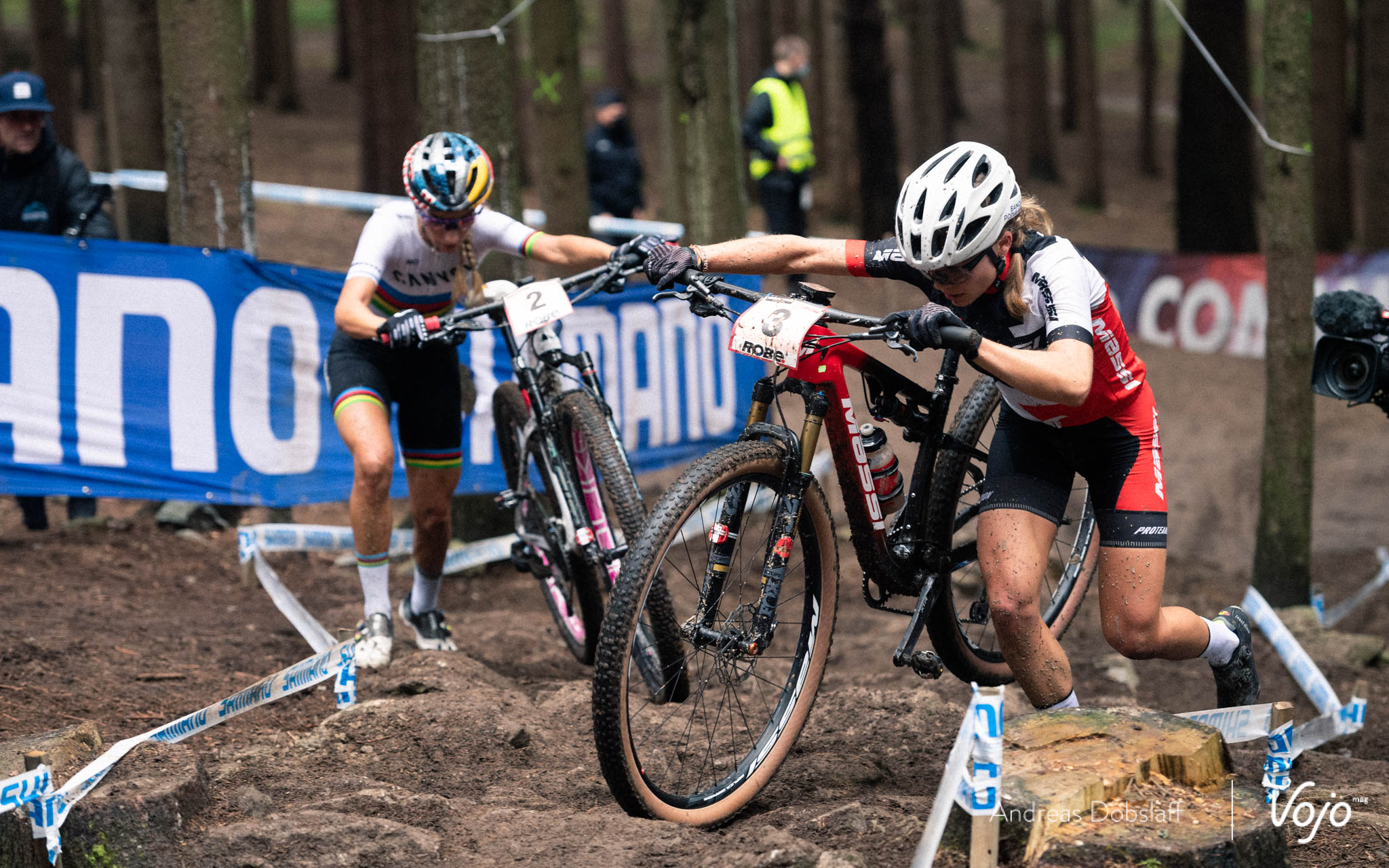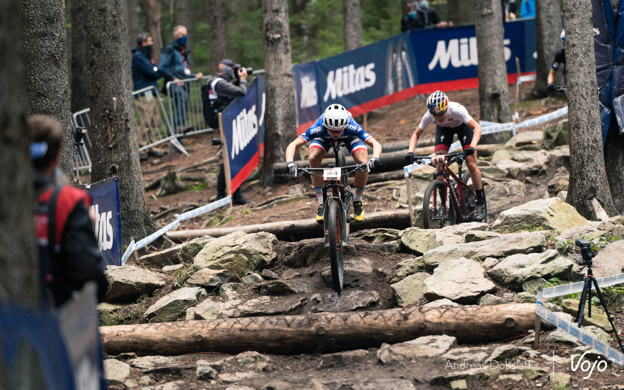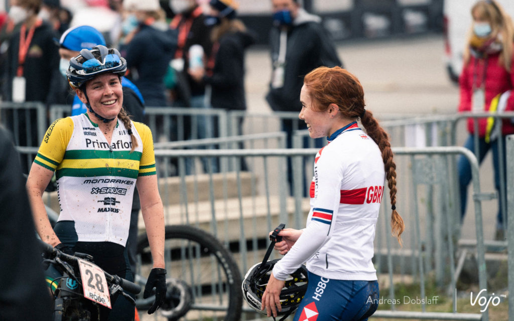 En tête de course, Pauline Ferrand-Prévot ne lève pas le pied et semble vouloir éviter à tout prix un retour de Loana Lecomte, la pilote du team Massi l’ayant battu à la régulière durant l’été sur les coupes de France et aux championnats de France. Cependant, une petite erreur en montée sur ce tracé très technique et glissant permet à sa concurrente de se rapprocher, puis de faire la jonction avant la dernière descente. Un duo Français mène cette coupe du Monde !