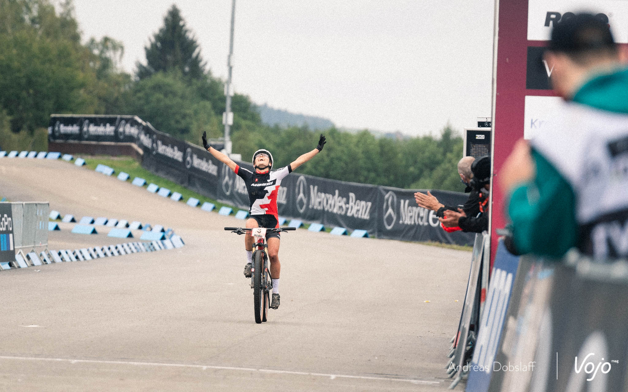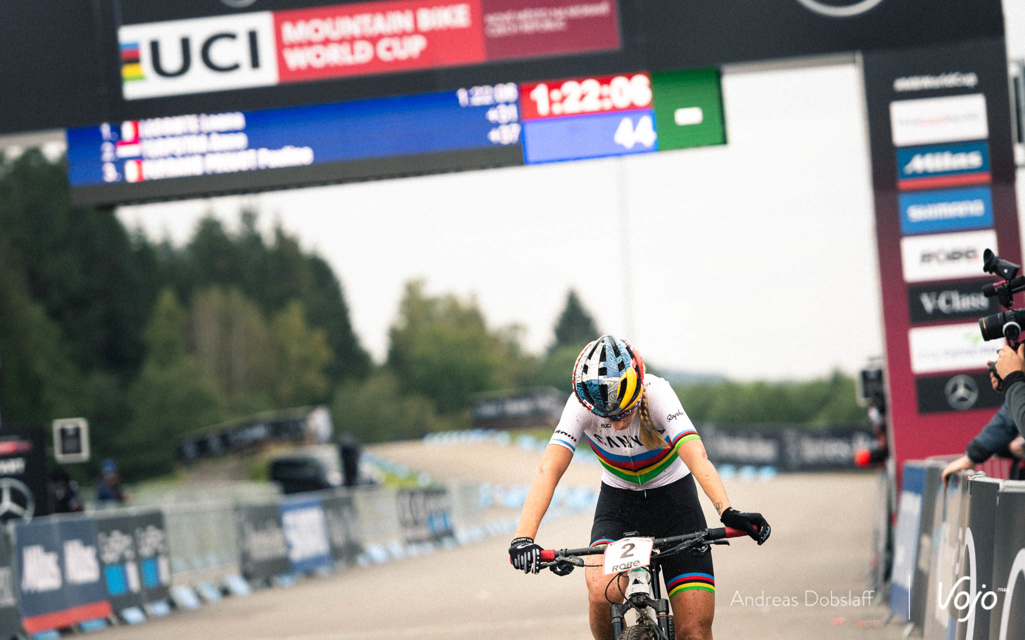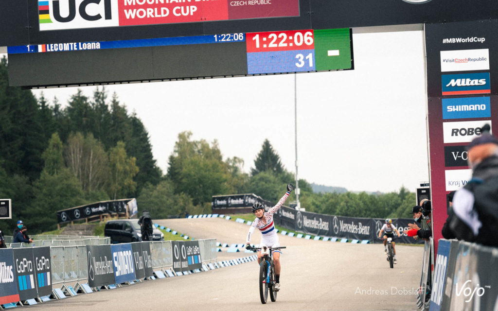 Devant, Loana Lecomte a suffisamment d’avance et peut se permettre de lever le pied pour savourer sa victoire dans les derniers hectomètres. La jeune Française, âgée de seulement 21 ans, remporte sa première coupe du Monde ! C’est la première fois dans l’histoire du XC qu’un ou une athlète remporte une coupe du Monde de XCO Elite dès sa première participation (Evie Richards avait fait de même pour le XCC deux jours auparavant).