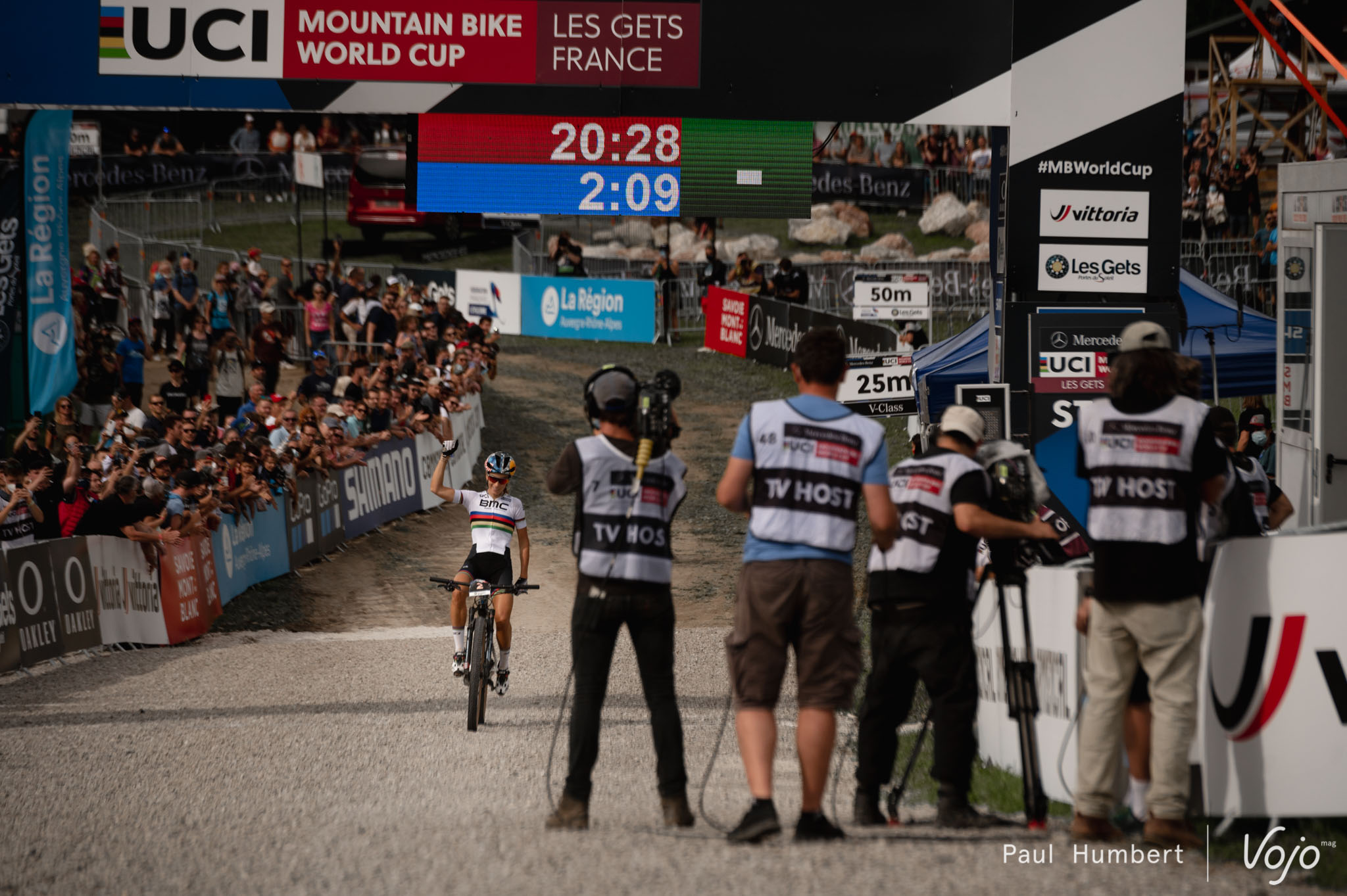 La Française arrive alors dans les épingles sur herbes, là où sont massés les spectateurs. Plus qu’une clameur, un véritable rugissement monte de la foule et accompagne la championne du Monde tout le long de la traversée. Le bruit est impressionnant ! Portée par le public jusqu’à l’arrivée, Ferrand-Prévot ne faiblit pas et signe sa deuxième victoire de la saison sur un XCC en coupe du Monde, après l’ouverture à Albstadt en mai.
