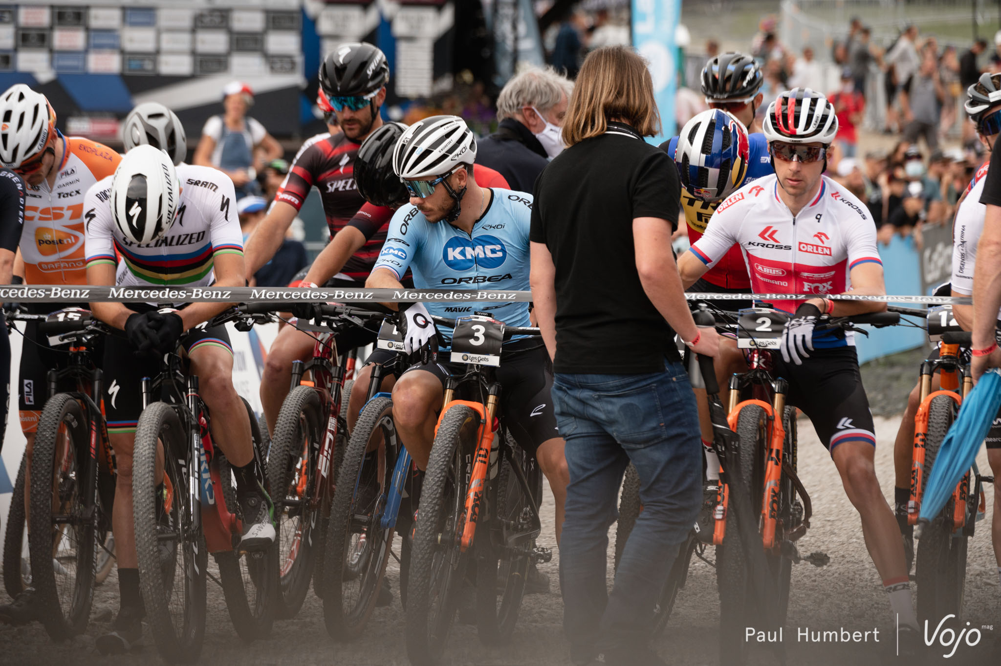 Avant le départ, beaucoup de regard sont tournés vers un homme : Tom Pidcock (à gauche de la photo, au deuxième plan). Le Britannique s’est cassé la clavicule à l’entraînement sur route il y a un mois tout pile et il est déjà de retour sur une coupe du Monde de VTT !