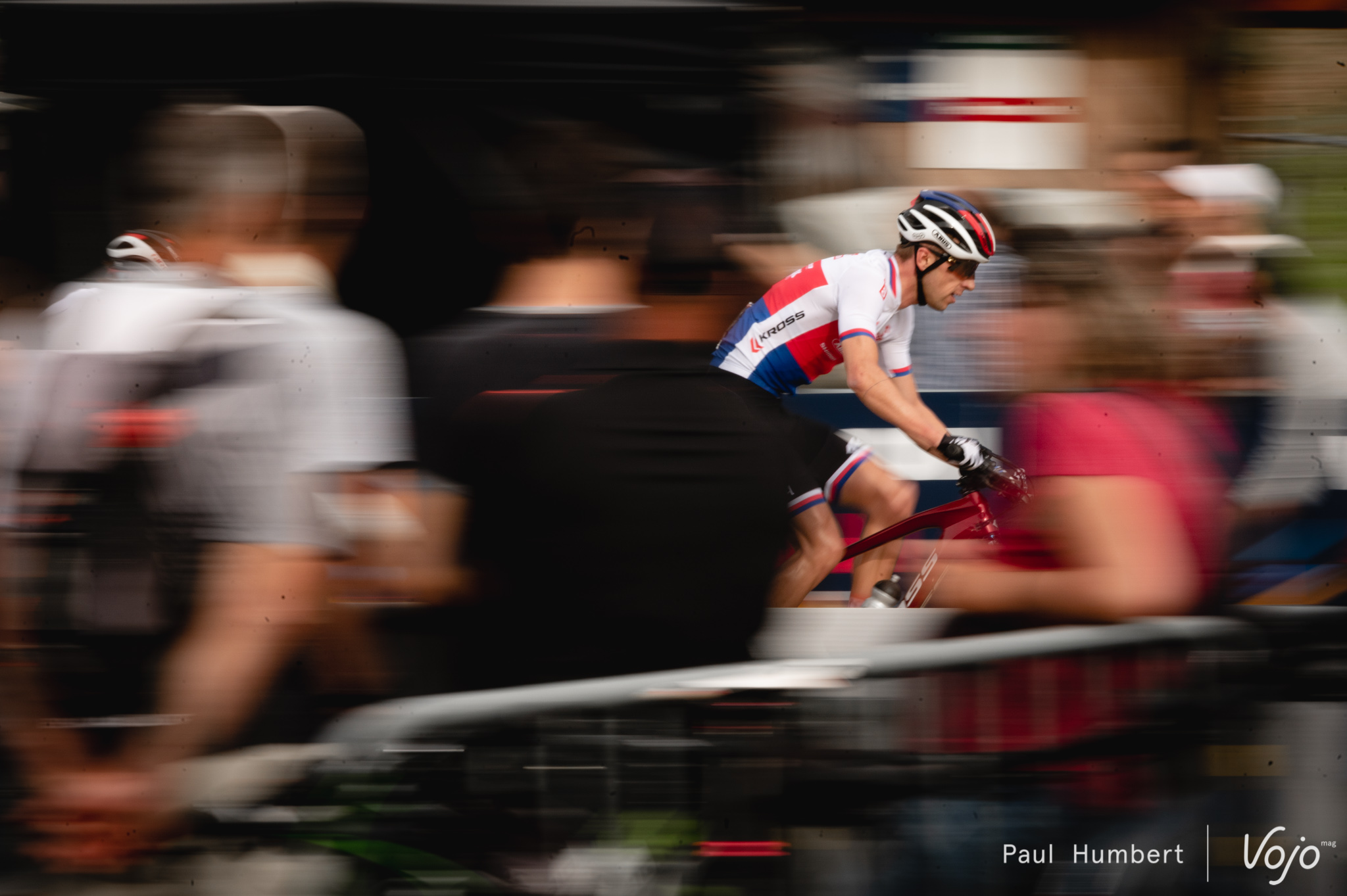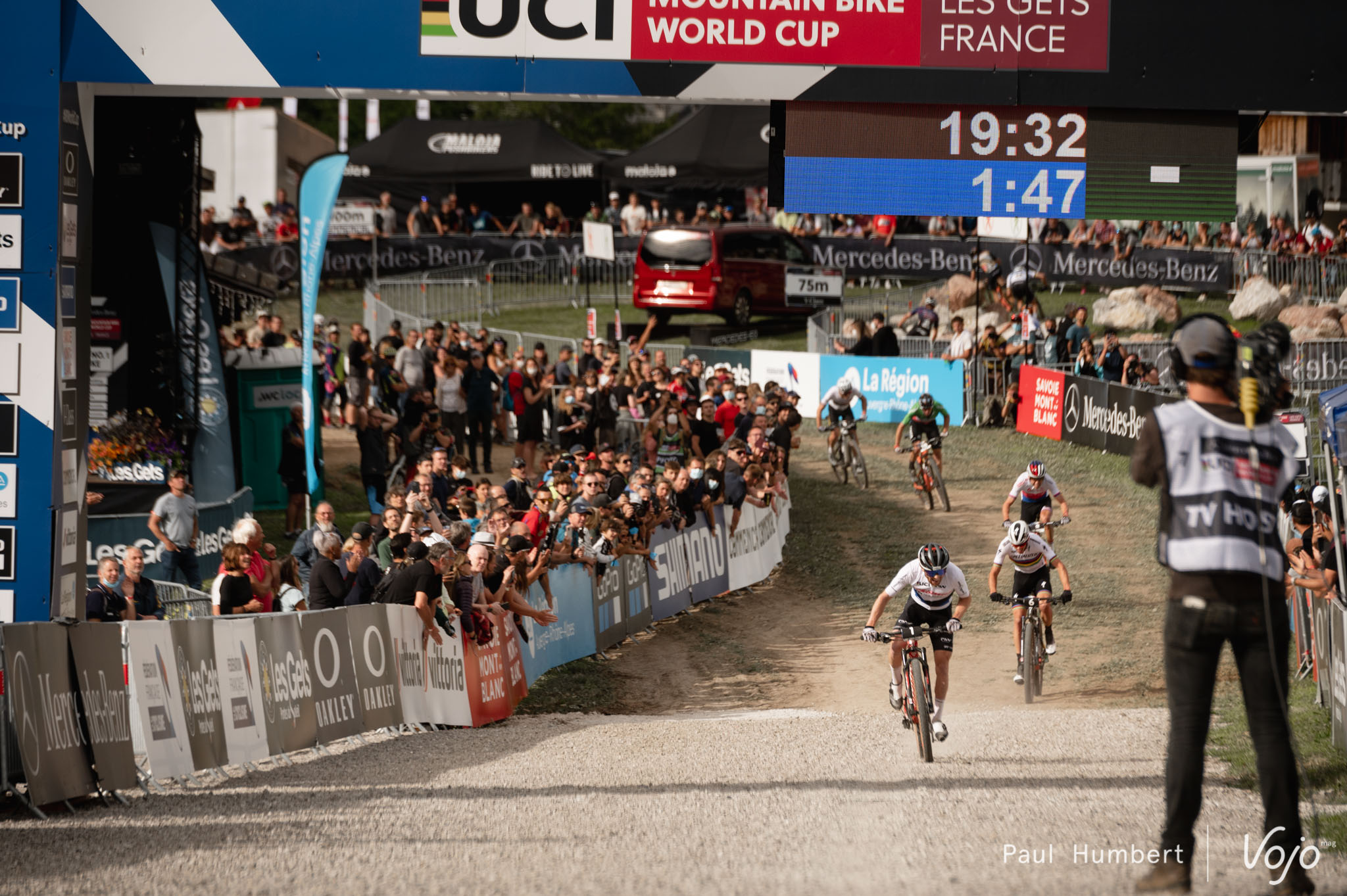 Malheureusement, une erreur va lui coûter cher. Juste avant un saut, il touche la roue arrière du Français et s’écrase sur l’appel en bois, sous les roues de Nino Schurter. Le Suisse ne peut faire autrement que rouler sur le vélo de Pidcock, et doit faire appel à toutes qualités de pilotage pour rester sur le vélo. On ne sait pas trop comment, mais ça passe !
