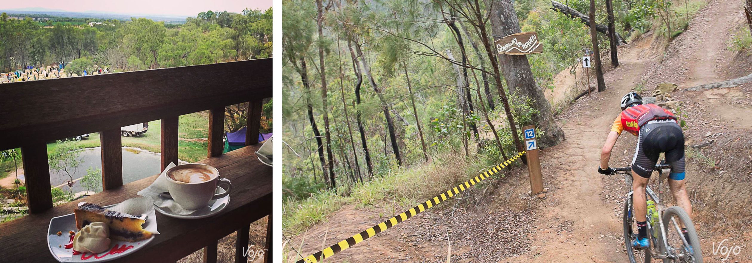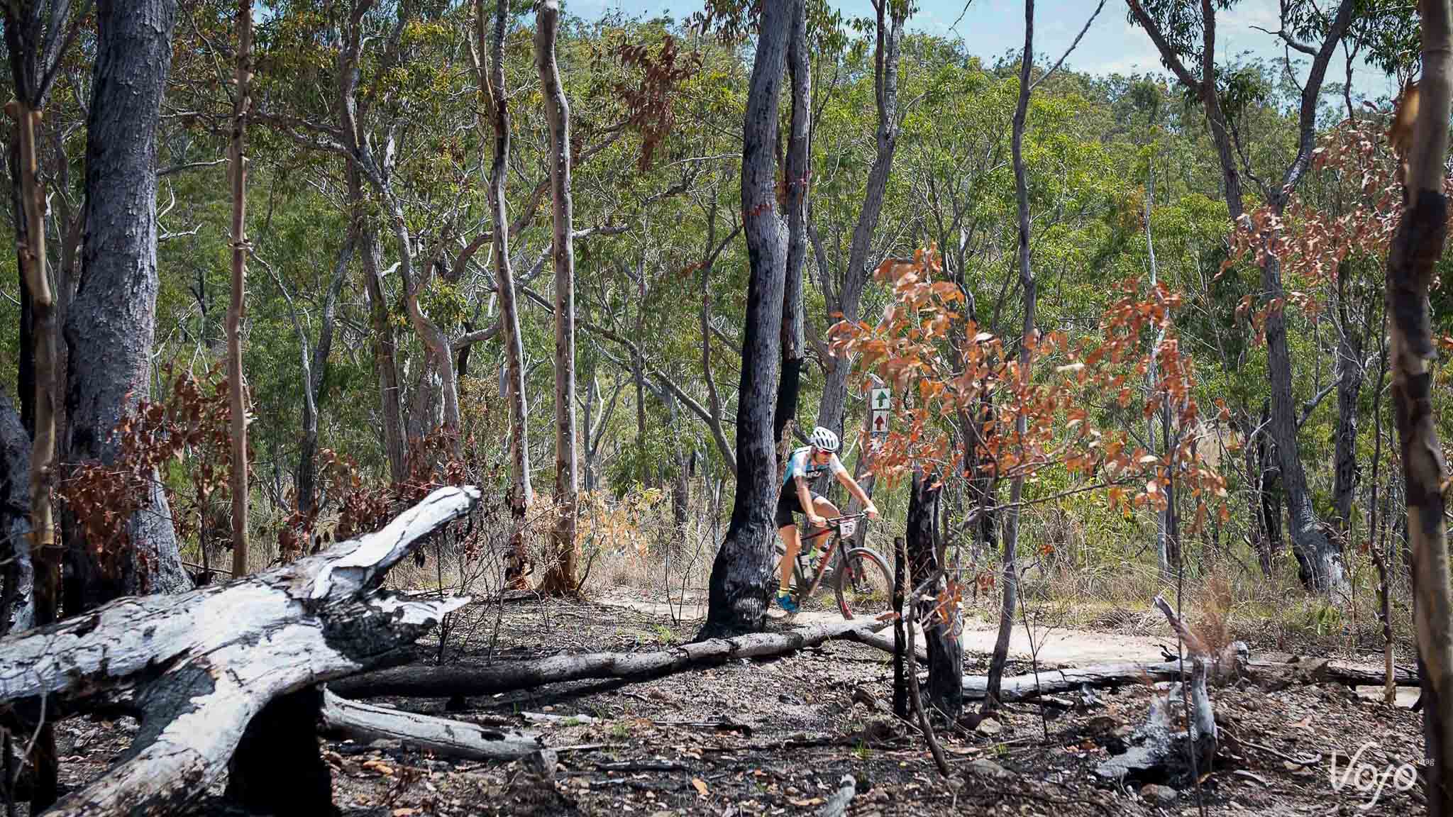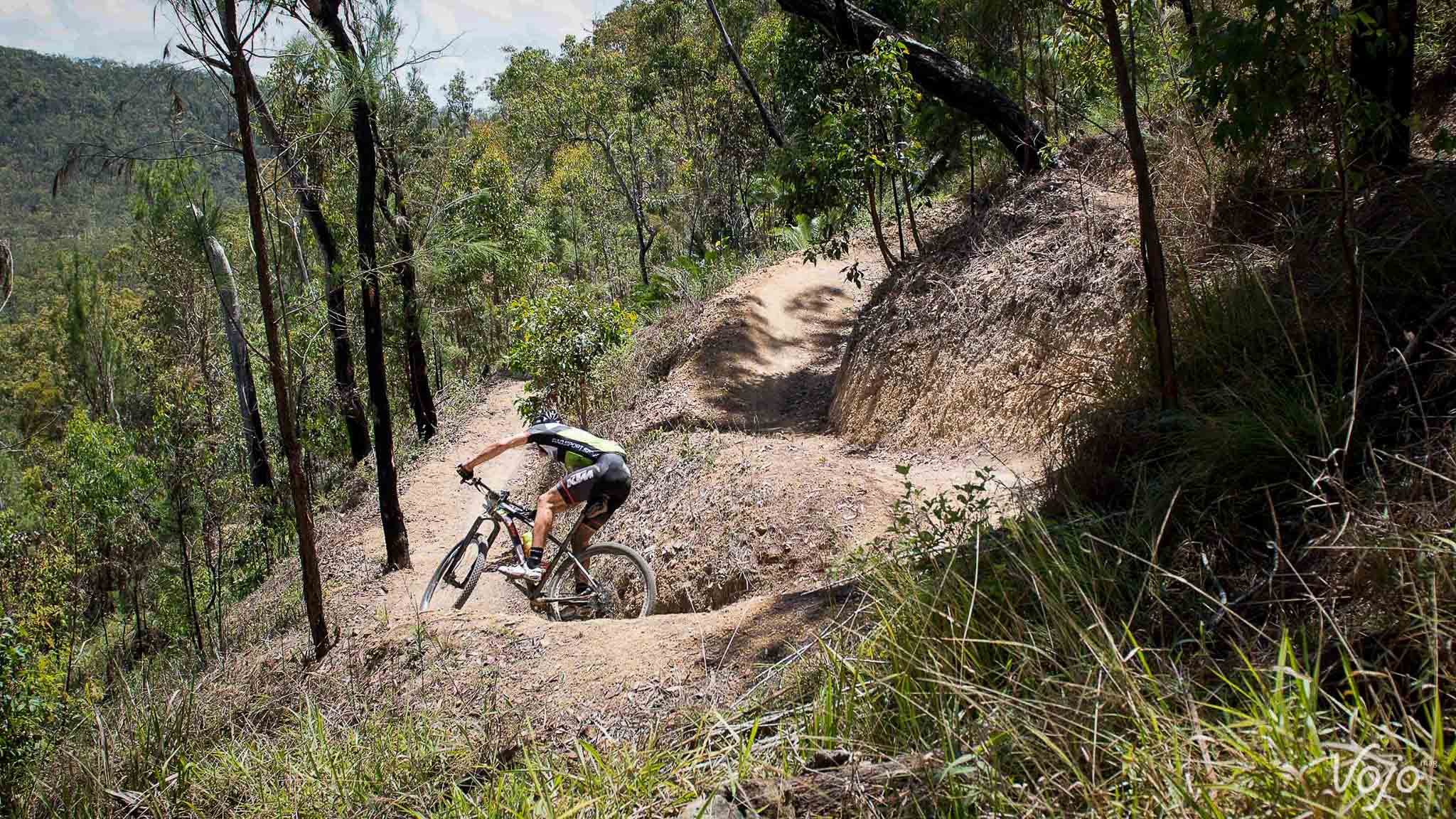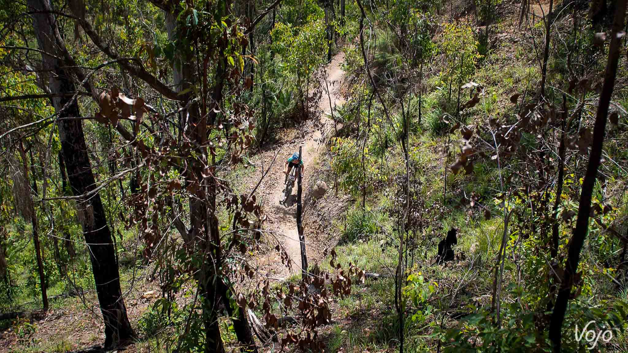 Nous serpentons sur le terrain tantôt meuble, tantôt sablonneux du Queensland. Le single nous fait tournoyer autour des arbres, déraper entre les rocailles et sauter par-dessus les pierriers. Le sourire aux lèvres, nous grimpons lentement au gré des épingles disséminées pour vaincre la pente. Une légère brise fait vibrer la végétation et refroidit la température qui commence à monter. Mais ce sont les mouvements de la pente qui érodent le plus notre puissance car le terrain ondule sans cesse. Chaque coup de pédale se fait à une puissance différente du précédent, la faute à des raidillons de 2 ou 3 mètres qui viennent durcir notre tâche. N’espère pas te reposer dans les descentes non plus, elles sont aussi à base d’épingles, de sauts et autres joyeusetés, mais il faudra aussi compter quelques passages forts techniques.