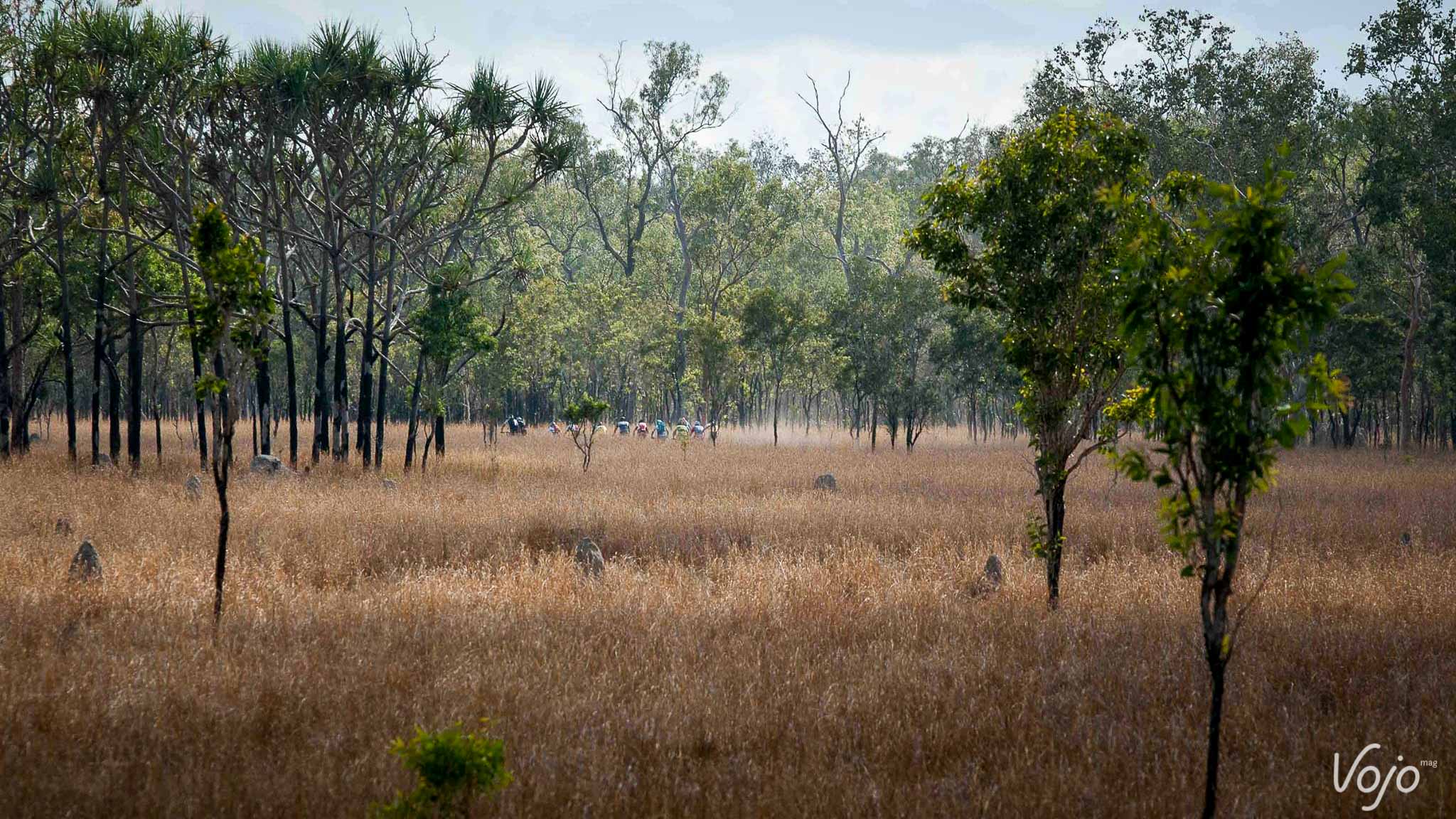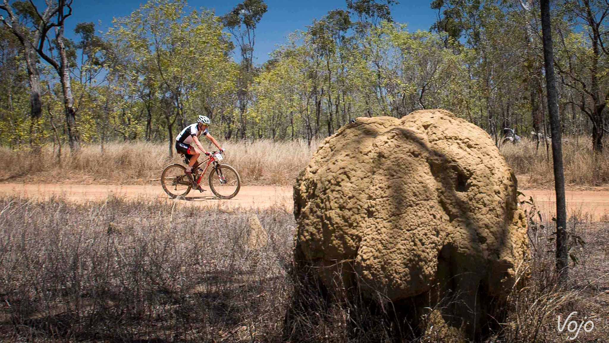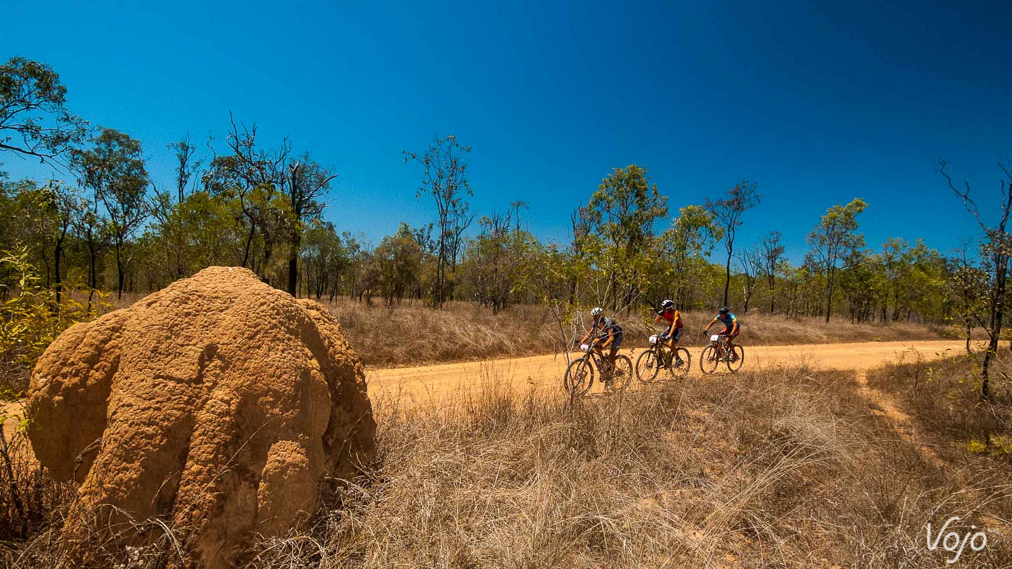 Aujourd’hui, la chaleur est oppressante, il n’y a pas un brin de vent pour atténuer cette fournaise. Tout le monde s’engage quand même avec le sourire dans l’étape. La sécheresse a rendu la piste glissante, la pente est d’autant plus compliquée à vaincre qu’il est impossible de se mettre en danseuse sous peine de perdre l’adhérence. La faune est quasi inexistante, seules quelques termitières hautes comme un homme viennent jalonner le circuit. Ce décor désertique nous accompagnera les deux tiers du circuit. La principale difficulté consistant à éviter l’ondulation du chemin qui secoue nos jarrets.