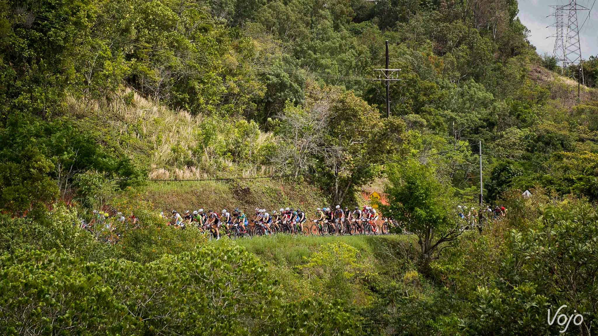 Les amoureux de grands espaces resteront forcément sur leur faim. Nous roulons sur un pan de montagne et la végétation luxuriante empêche toute possibilité de voir la mer. Mais éveille tes sens, ami lecteur, aucunement tu ne te sentiras en Europe au milieu de cette forêt. La chaleur et la végétation te le rappelleront. Le départ est à 11h, il est 3h du matin en France, j’ai atterri il y a 24h après 30h de vol. Le soleil agresse carrément mon corps et la transpiration que je dégage n’a rien d’ordinaire. Le coup de sifflet me décroche une petite exaspération…La meute se lance groupée sur le sinueux tracé. Plus la course avance et plus la fatigue devient pesante, j’appuie sur les pédales avec l’entrain d’un octogénaire mais j’ai le sourire aux lèvres. Mes deux portes bidon suffisent à peine à emporter de quoi étancher ma soif de 20 minutes d’effort.