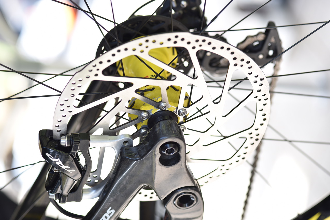 On constate aussi la présence d’un dérailleur peu courant qui, après examen, s’avère être un TRP ! La marque, connue pour ses freins, semble désireuse de se lancer aussi dans les transmissions, mais elle n’a pas donné plus de détails à ce stade.