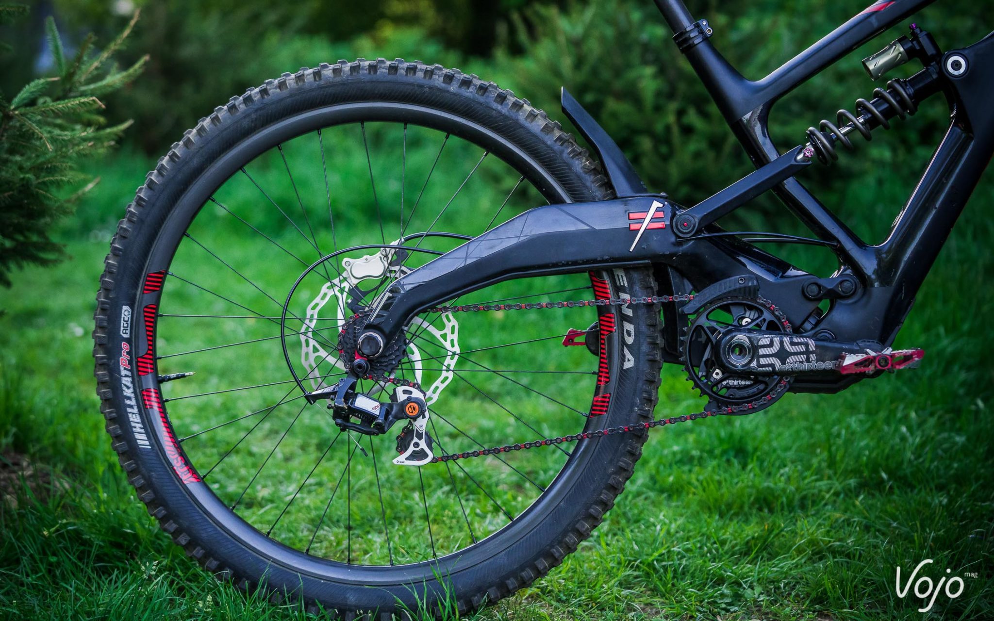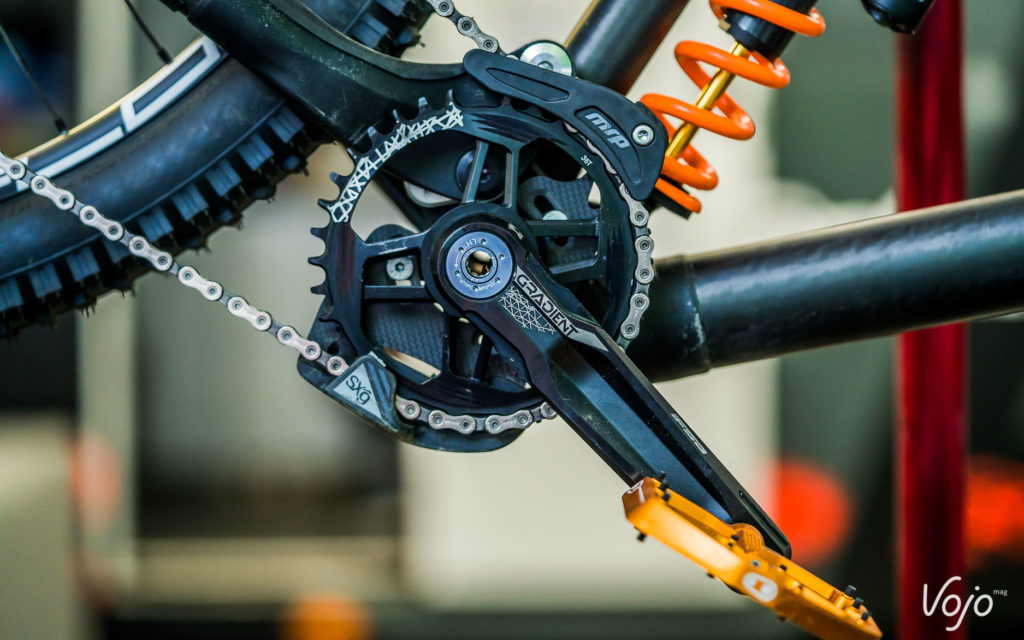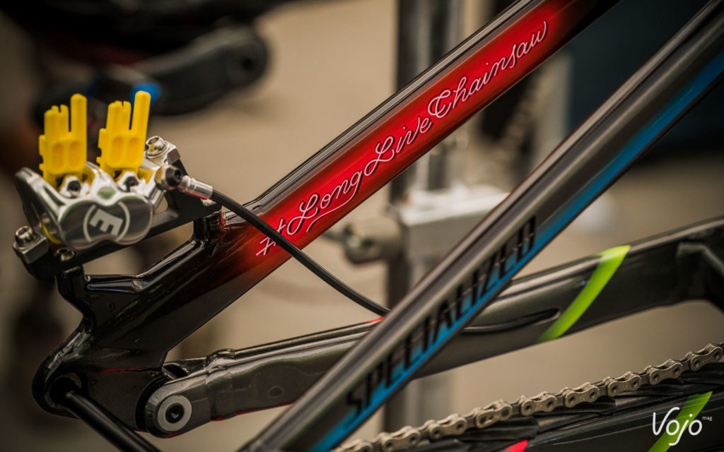 Le reste des composants vient de chez E13 pour les roues et le pédalier, la transmission est une Box et les freins des Trickstuff comme chez les Atherton.