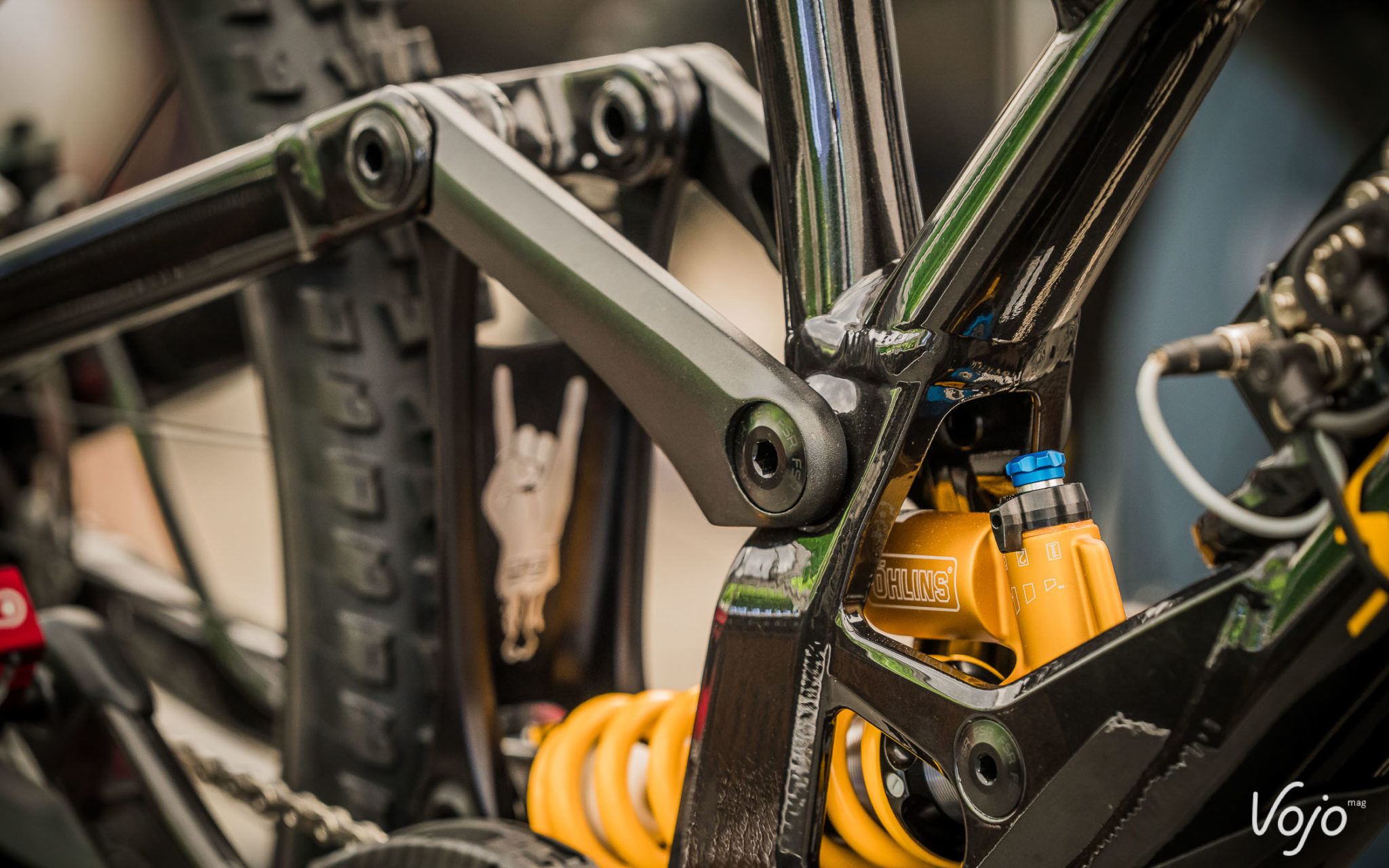 Marine Cabirou utilise aussi une roue de 27,5″ derrière et une 29 devant. La suspension complexe du précédent Gambler fait place à une cinématique 4 Bar Linkage plus traditionnelle, et à l’arrière on aperçoit un insert réversible qui laisse à penser que le cadre pourrait être compatible avec les deux tailles de roues.