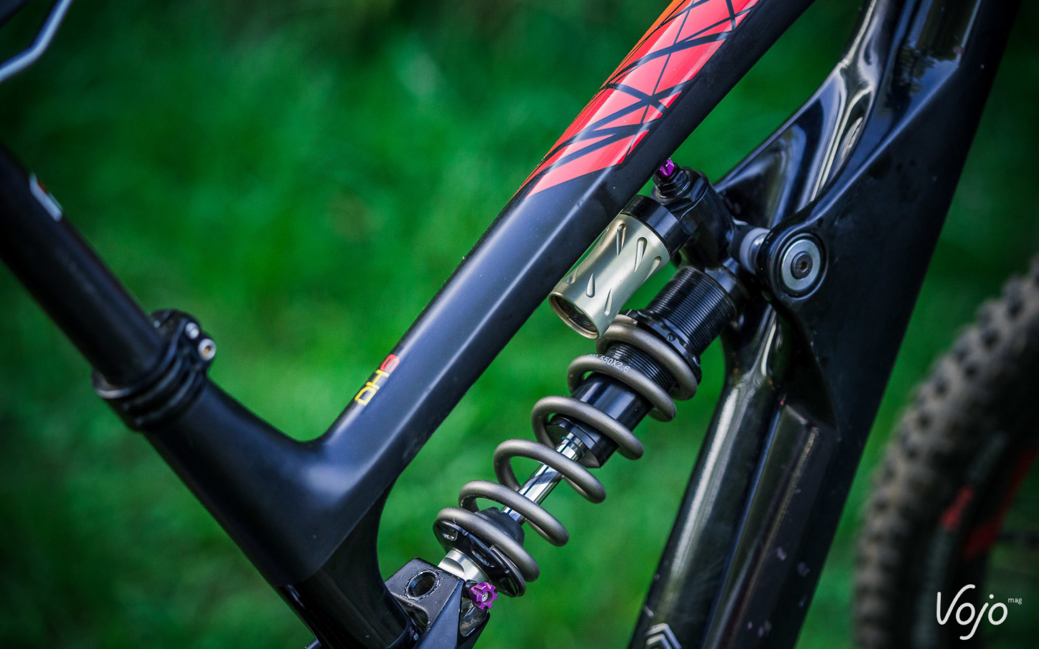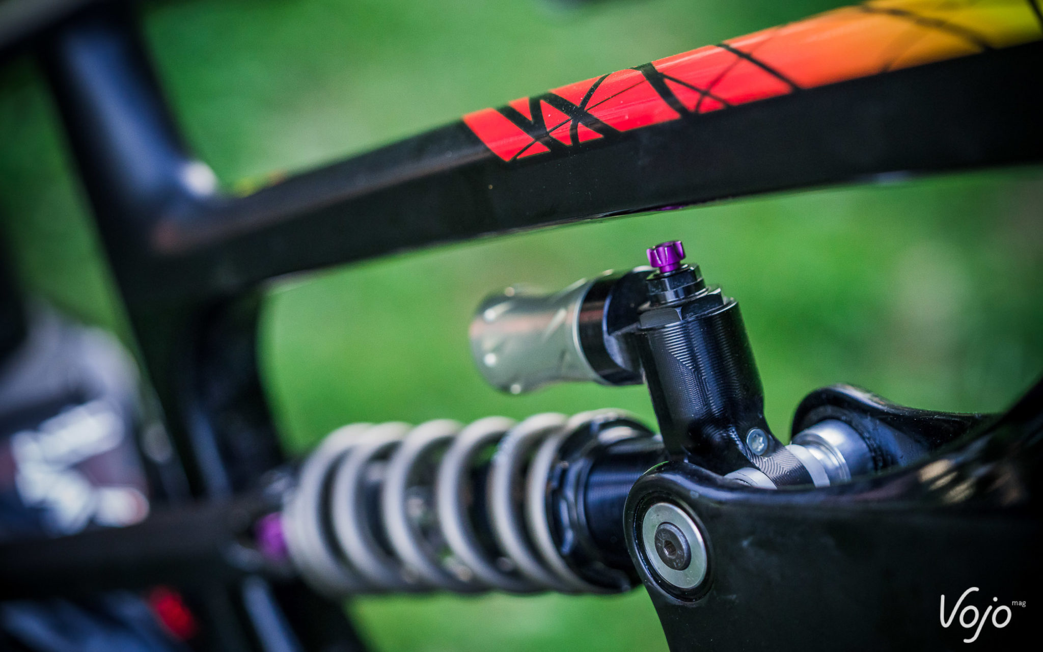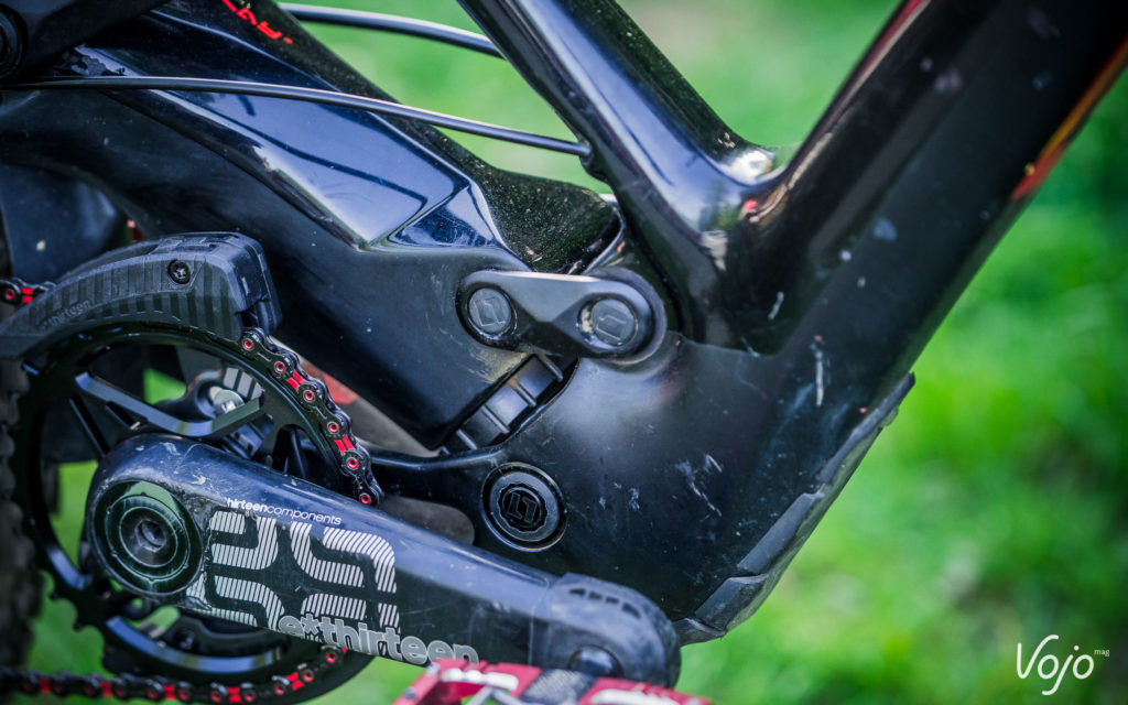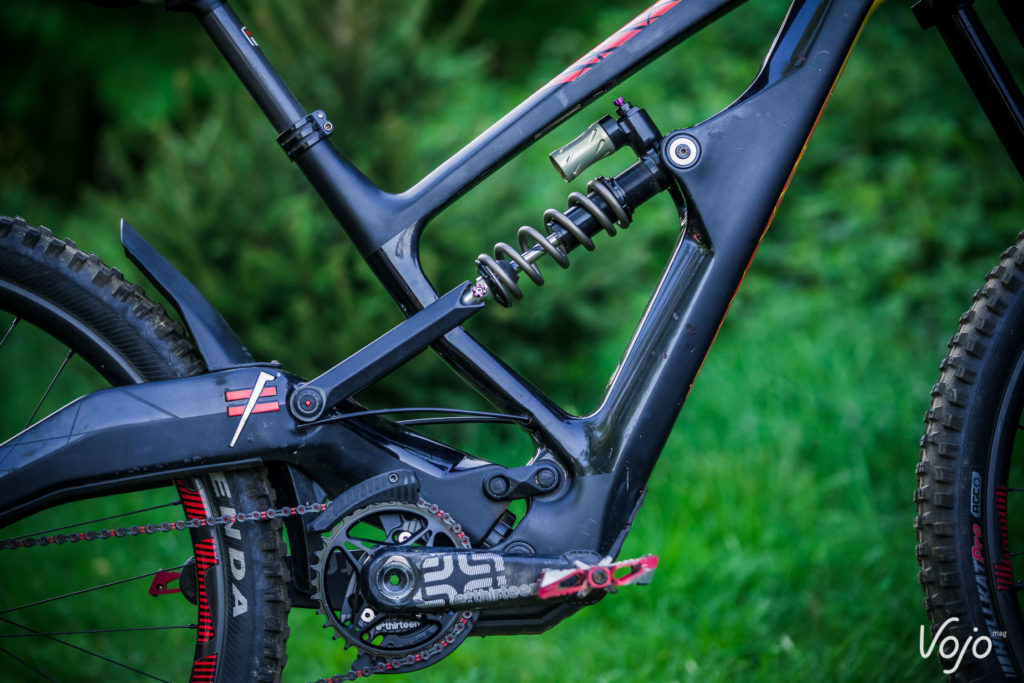 Développée avec Dave Weagle, la suspension a des airs de 4 Bar Linkage, mais une petite biellette inférieure montre que ce n’est pas le cas et que cela s’apparente plus à une variation du DW Link avec un point de pivot additionnel sur les bases.