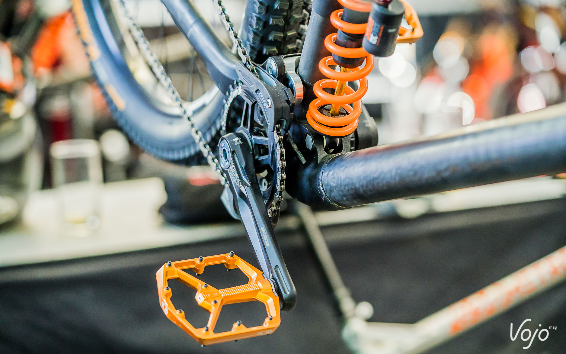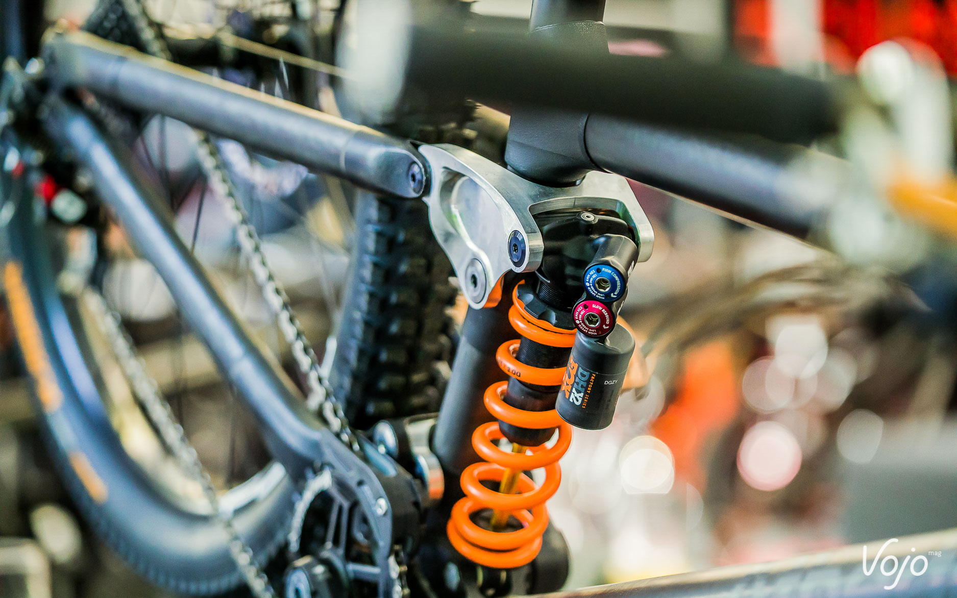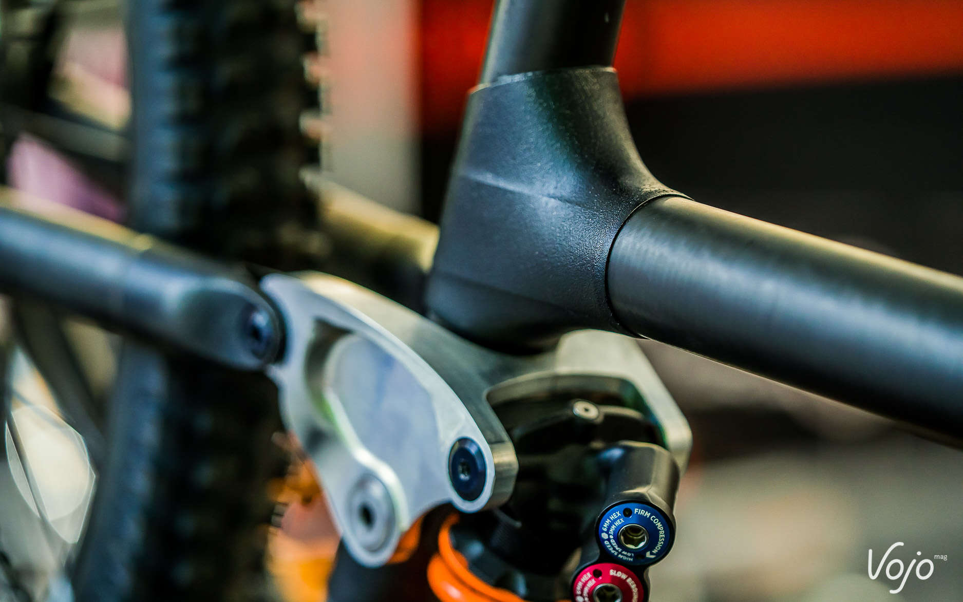 L’idée est d’avoir une biellette qui comprime deux amortisseurs simultanément ; le supérieur étant juste le ressort gérant la courbe de ratio, sans aucun réglage de détente ou de compression ; l’amortissement proprement dit étant confié à l’amortisseur inférieur. On constate aussi la présence d’un pivot haut (petite roulette de renvoi de la chaîne au-dessus du pédalier). Le cadre est en carbone donc on peut s’avancer à dire qu’une mise en production est prévue.