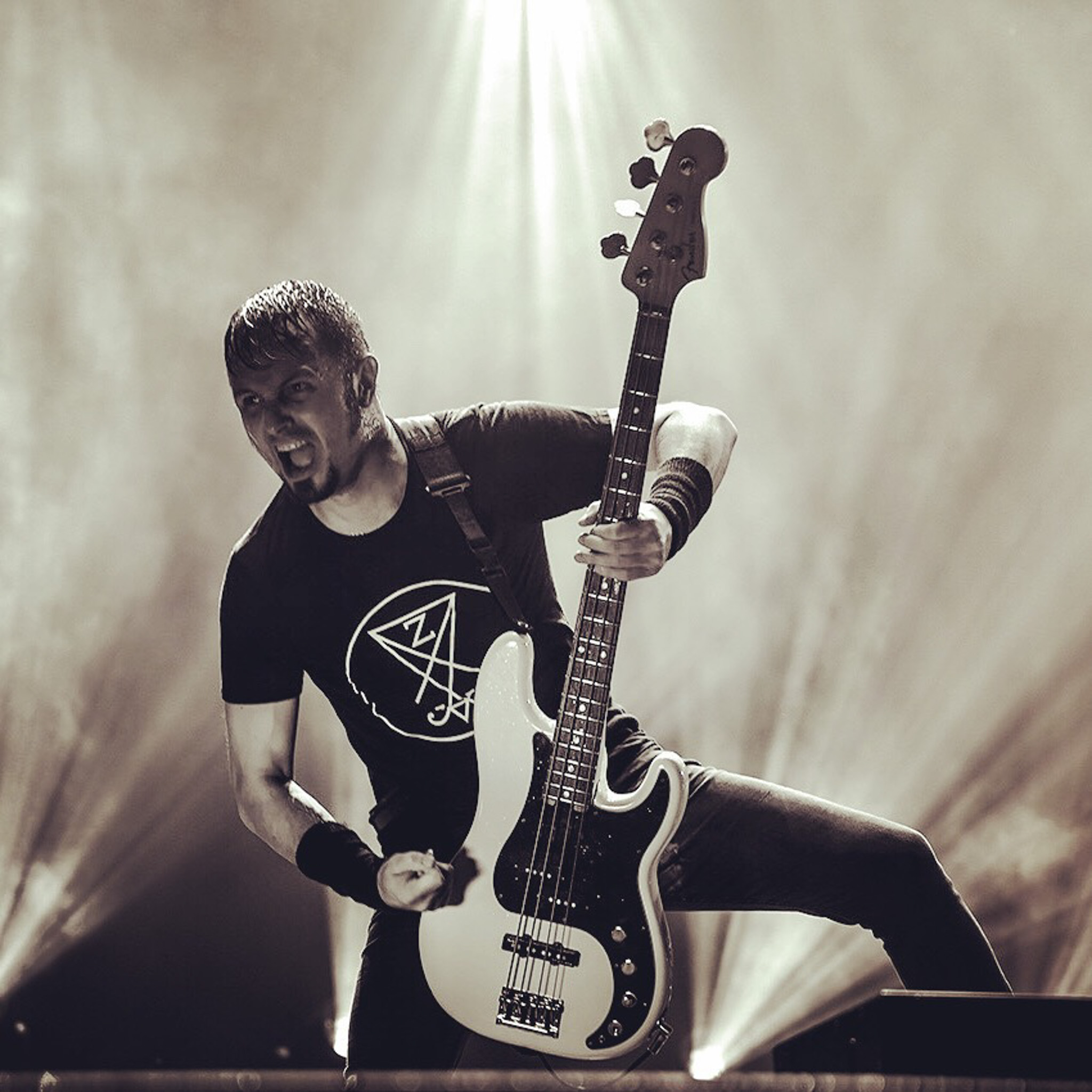 Jouer de la basse sur scène, c’est un effort ultra physique. Je joue avec un médiator, sur chaque note, un peu comme un guitariste mais avec de très grosses cordes. Il y a aussi la gestuelle de scène, je bouge fort, je me jette, je saute : je « ride » la scène. Pendant le show, je monte à des endroits sans calculer, je fais des « 360 », je suis complètement libre ! J’ai un rapport physique à mon instrument. Quand le show se termine, je suis trempé intégralement, complètement claqué. Je suis peut-être anti-rock star parce qu’après un concert c’est une bière, une douche et au lit !