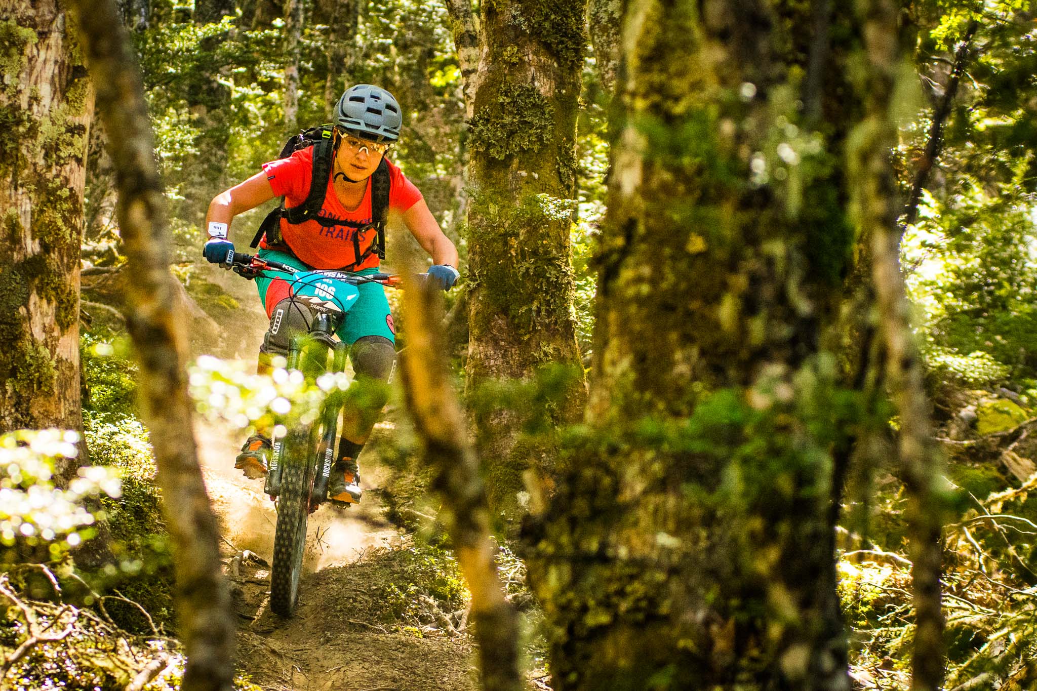 Je garde un sacré souvenir de cette sortie. À la sortie du van, j’ai subi une attaque de sandflies, ces toutes petites mouches qui paraissent toutes mignonnes, mais qui piquent bien plus que des moustiques ! Autant vous dire que je me suis préparée rapidos pour partir rouler. Je vous avoue que la montée c’était un peu le parcours du combattant avec pas mal de portages et de franchissements d’obstacles. Ça glissait pas mal et je n’était pas très rassurée. Arrivée en haut, la pluie et l’orage approchent. J’ai eu tellement peur que j’ai fait la descente d’une seule traite en priant pour que l’orage n’arrive pas au-dessus de moi ! Je n’ai regretté à aucune seconde d’avoir fait ce trail, l’atmosphère était magique tant le terrain était moelleux et les arbres remplis de mousse !