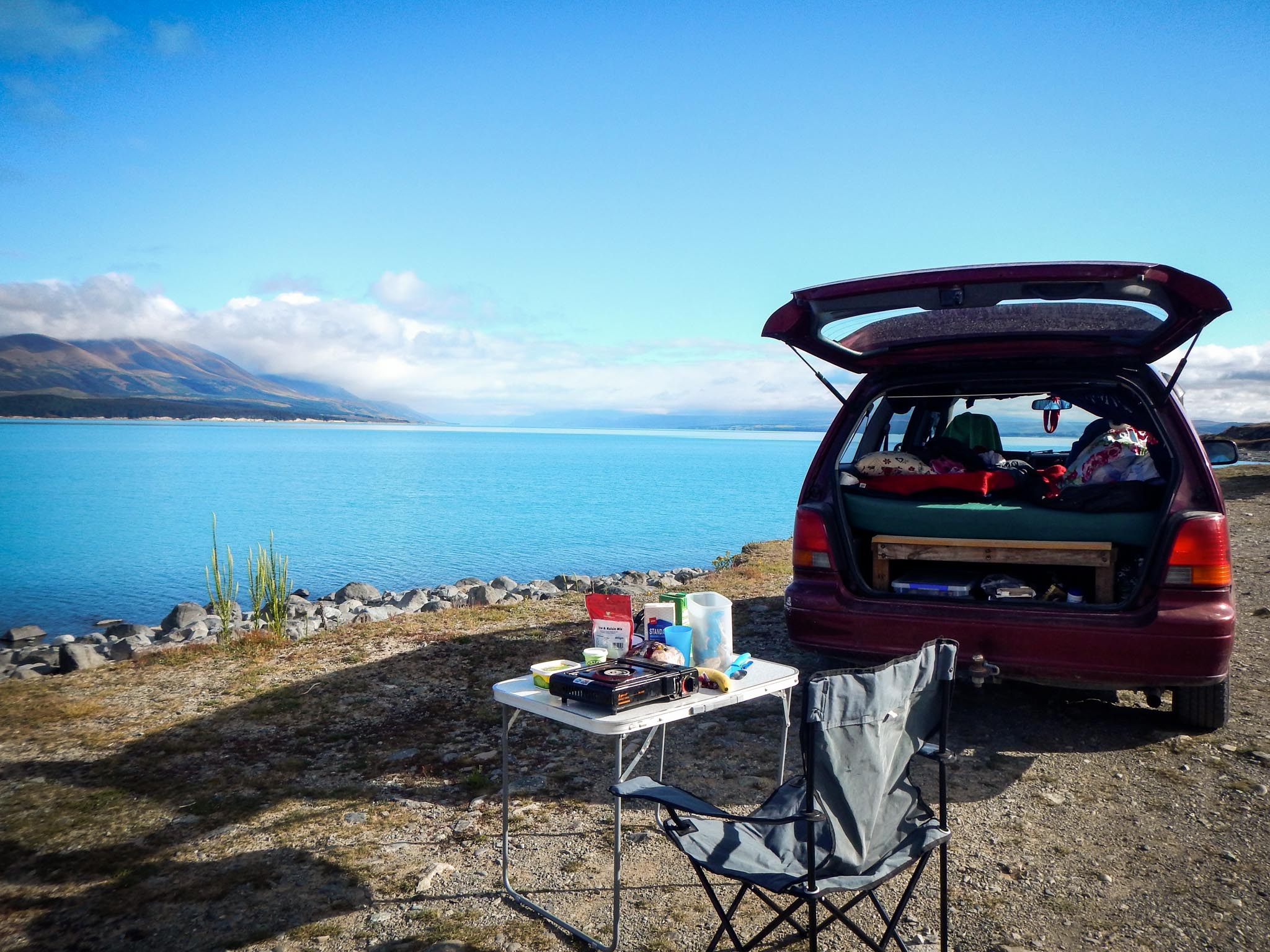 Je vous épargne la packing list mais il y a quelques affaires essentielles qu’on a souvent tendance à oublier : une prise adaptateur NZ, une petite multiprise, un allume-cigare avec double prise USB, une batterie externe et de la musique hors-ligne (avec un large choix au risque d’être rapidement dégoûté) et une petite enceinte (pour les heures que vous risquez de passer sur la route dans votre véhicule sans autoradio, c’est vraiment utile !).