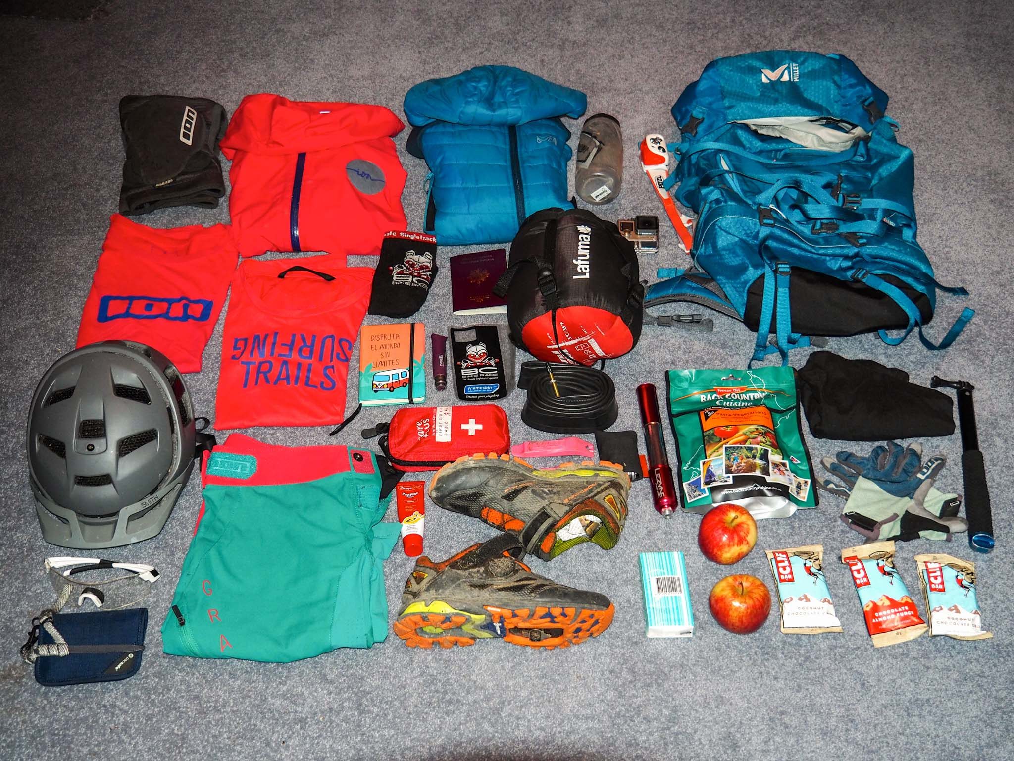 J’imagine que la plupart d’entre vous partent souvent faire des week-ends de bike, voitures et bagages pleins à craquer ! Je me suis posé la même question: comment préparer des affaires pour 6 mois ?! Eh bien que l’on parte pour un week-end où 6 mois, il y a exactement la même chose (voire moins) dans vos bagages ! Quand on part en road trip, il est indispensable de voyager léger, c’est bien plus pratique. Les vêtements de bike et ceux plus confortables font très bien l’affaire. Alors…… sac à dos ou valise ? Les choix sont à faire en fonction de l’usage et du programme de chacun. À vous de réfléchir au plus pratique ! Dans mon cas, pour un road trip van-VTT de 6 mois, j’ai choisi : un sac à dos de 65+10L, un sac à dos pour l’avion et un sac à dos de bike.