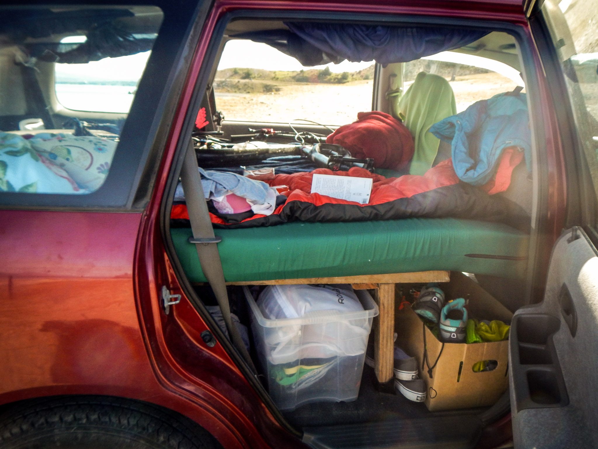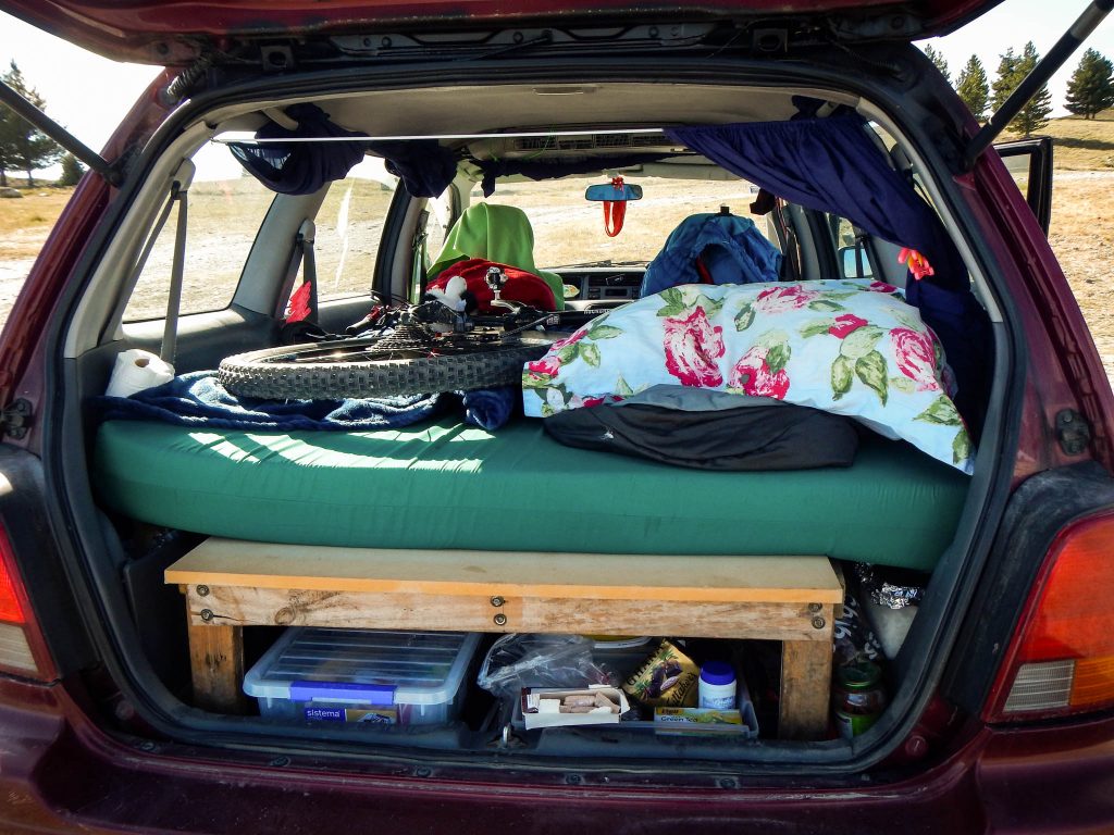 Pour manger : tous les rangements, que ce soit vêtements ou nourriture étaient sous le sommier en bois. Les aliments « frais » étaient plutôt bien conservés sous le bois même les jours de chaleur. Evidemment, il ne faut pas être trop attentif à la chaîne du froid ! Quand on est sur la route, on n’a pas vraiment le même régime alimentaire que d’habitude. J’ai trouvé mon rythme en commençant ma journée par un petit déj consistant (un bon porridge par exemple), partir rouler, grignoter 2-3 trucs dans l’aprem et cuisiner quelque chose de facile le soir (souvent des wrap dans mon cas).