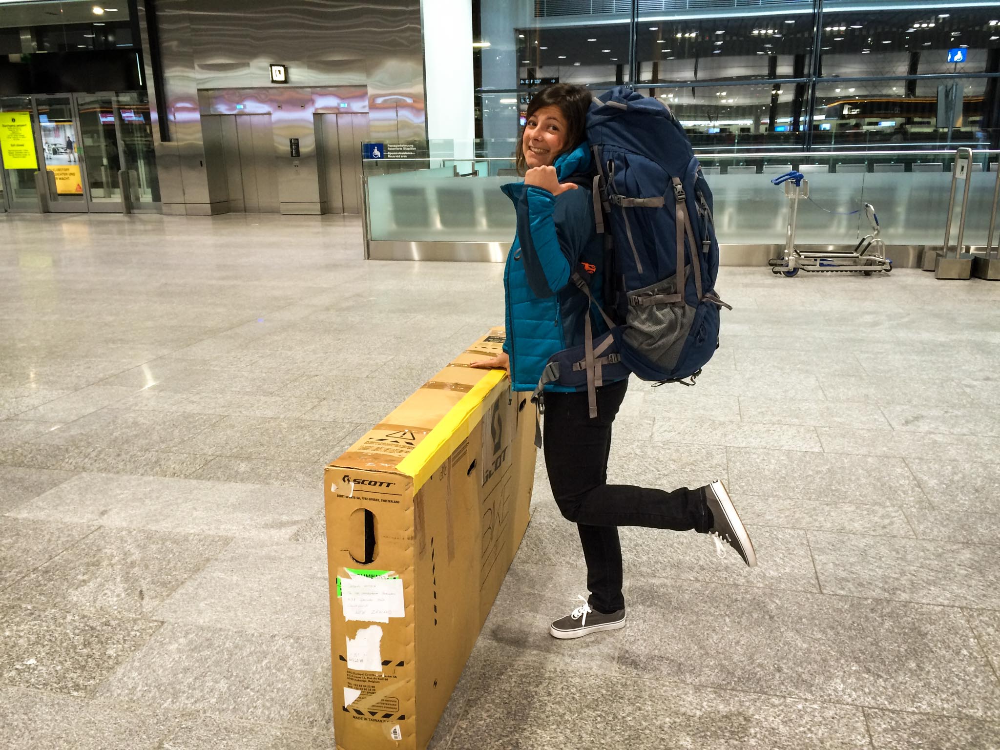 Carton ou housse ? Comme vous l’aurez compris, quand on prépare un long voyage, il faut penser pratique ! Mon choix se porte donc sur le carton, c’est bien plus facile de jeter le carton en arrivant plutôt que de s’encombrer d’une housse qu’on ne sait pas où stocker. La partie de « tetris » commence ! Pour un vélo de petite taille, il suffit de démonter les roues, les pédales et le guidon. Pensez surtout à bien protéger votre VTT à l’aide de chiffons, de mousses… et à dégonfler vos pneus. Si jamais ça ne rentre pas, libre à vous de démonter d’autres pièces de votre vélo jusqu’à ce que ça rentre sans problème dans le carton. J’ai préféré monter mes pneus en chambre à air pour éviter le remontage en tubeless dès la sortie de l’aéroport avec une pompe à main… N’hésitez pas à glisser votre casque, sac à dos de vélo et chaussures dans votre carton… et n’oubliez pas de vérifier le poids !