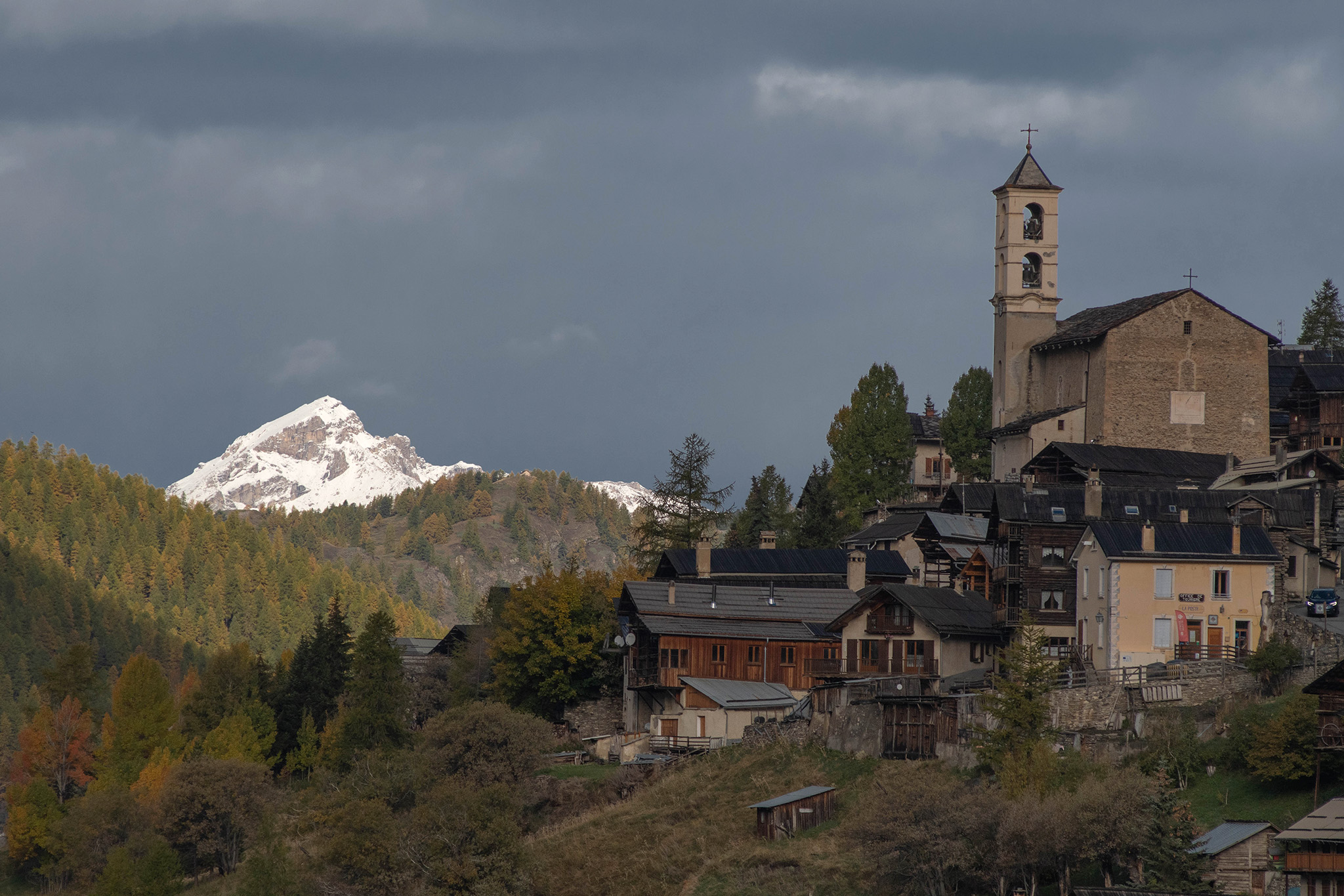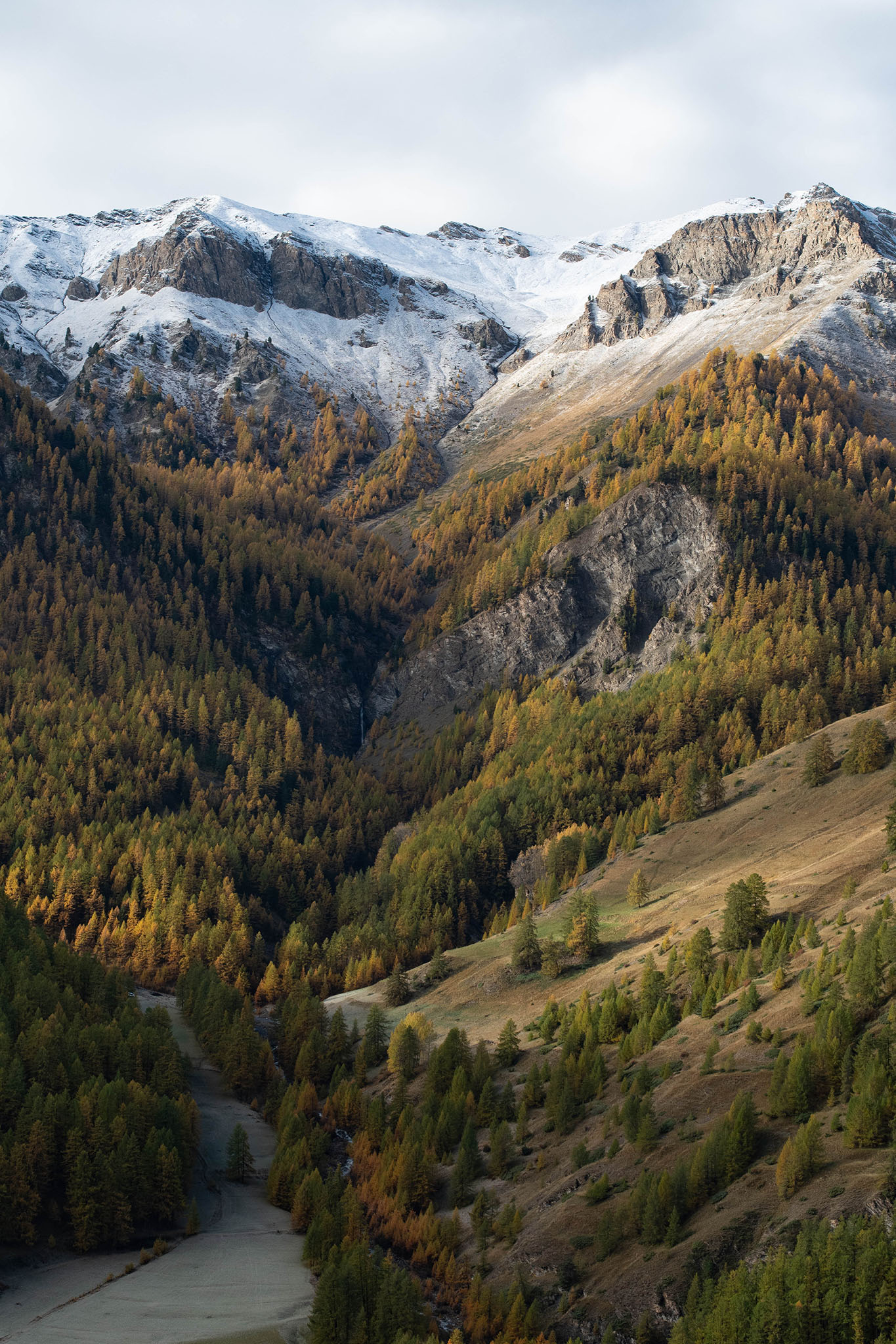 Un peu plus bas, la vallée s’ouvre à l’approche de Pierre-Grosse et de Molines-en-Queyras qui se gorgent de lumière. L’itinéraire traverse le village et pique vers la jonctions des deux torrent de l’Aigue : il sera mon fil d’Ariane pour retrouver La Chalp. En arrière-plan, les sommets enneigés témoignent d’un hiver en devenir : la montagne va peu à peu plonger dans son silence blanc et originel.