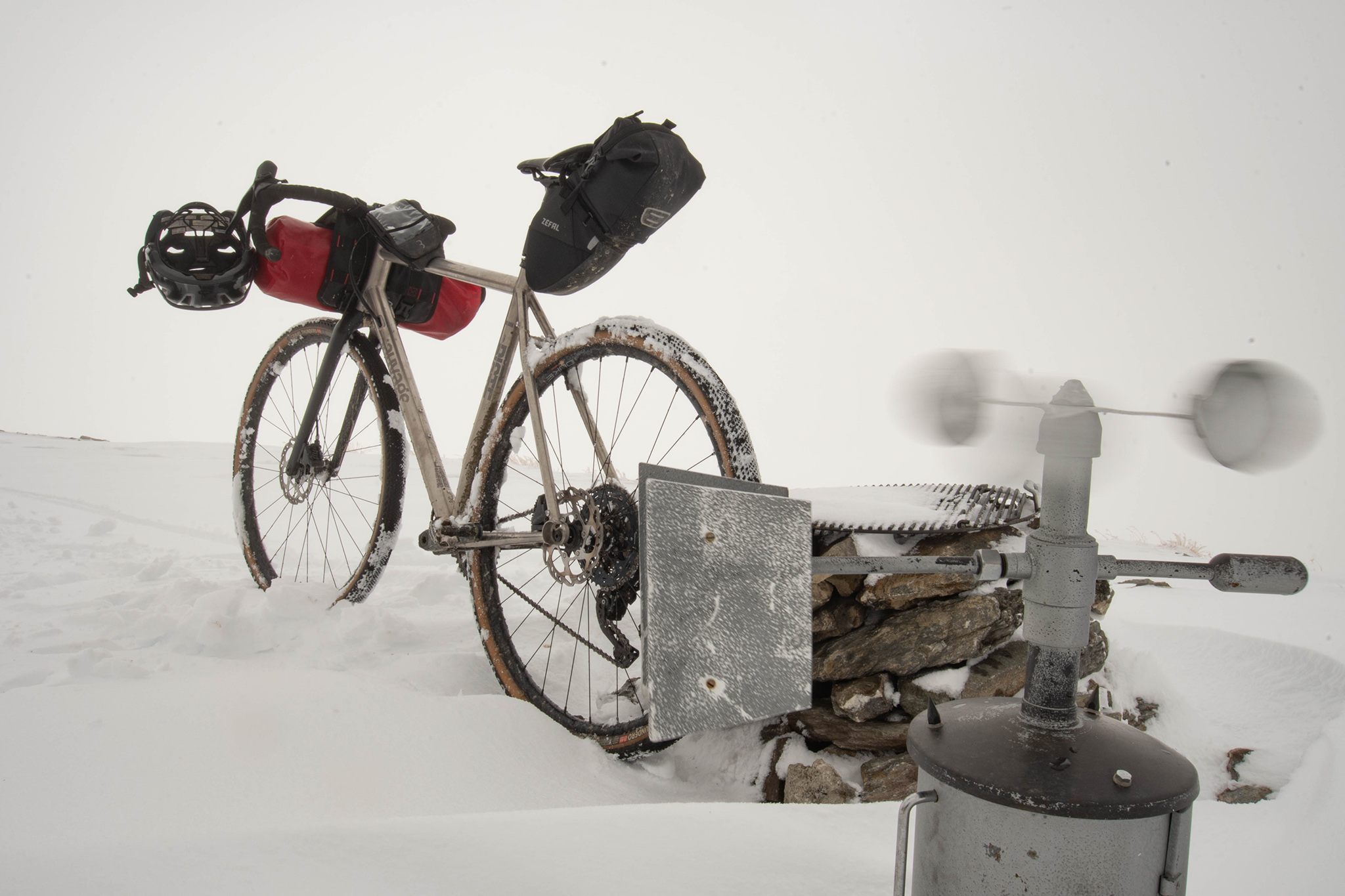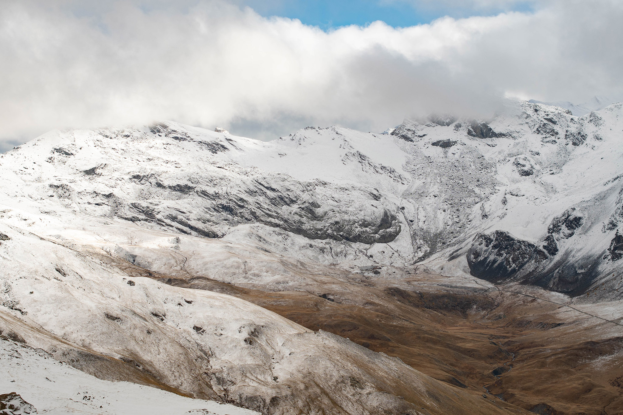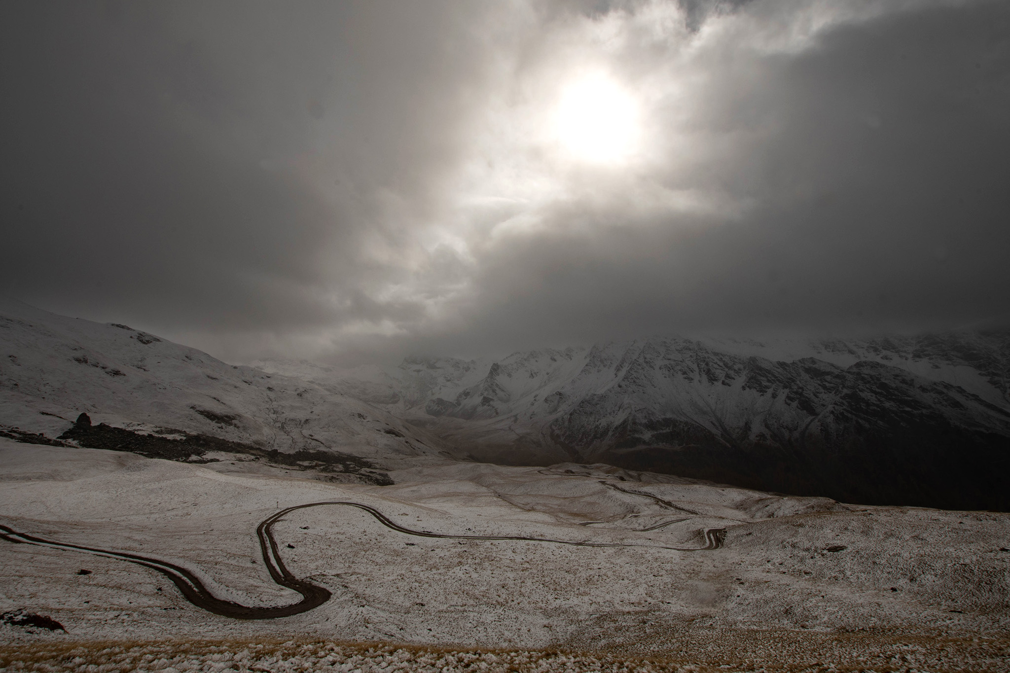 Je rencontre plutôt des ornières et une boue collante : les pneus de mon gravel ne sont guère adaptés. Qu’importe : plus je grimpe, plus le froid fige le sol. Le chemin gèle et devient plus roulant, du moins jusqu’à 2.600 mètres. Peu après la bifurcation vers le col du Longet, le chemin caracolant sur le versant se couvre peu à peu de neige : l’hiver a déjà établi ses quartiers en altitude.