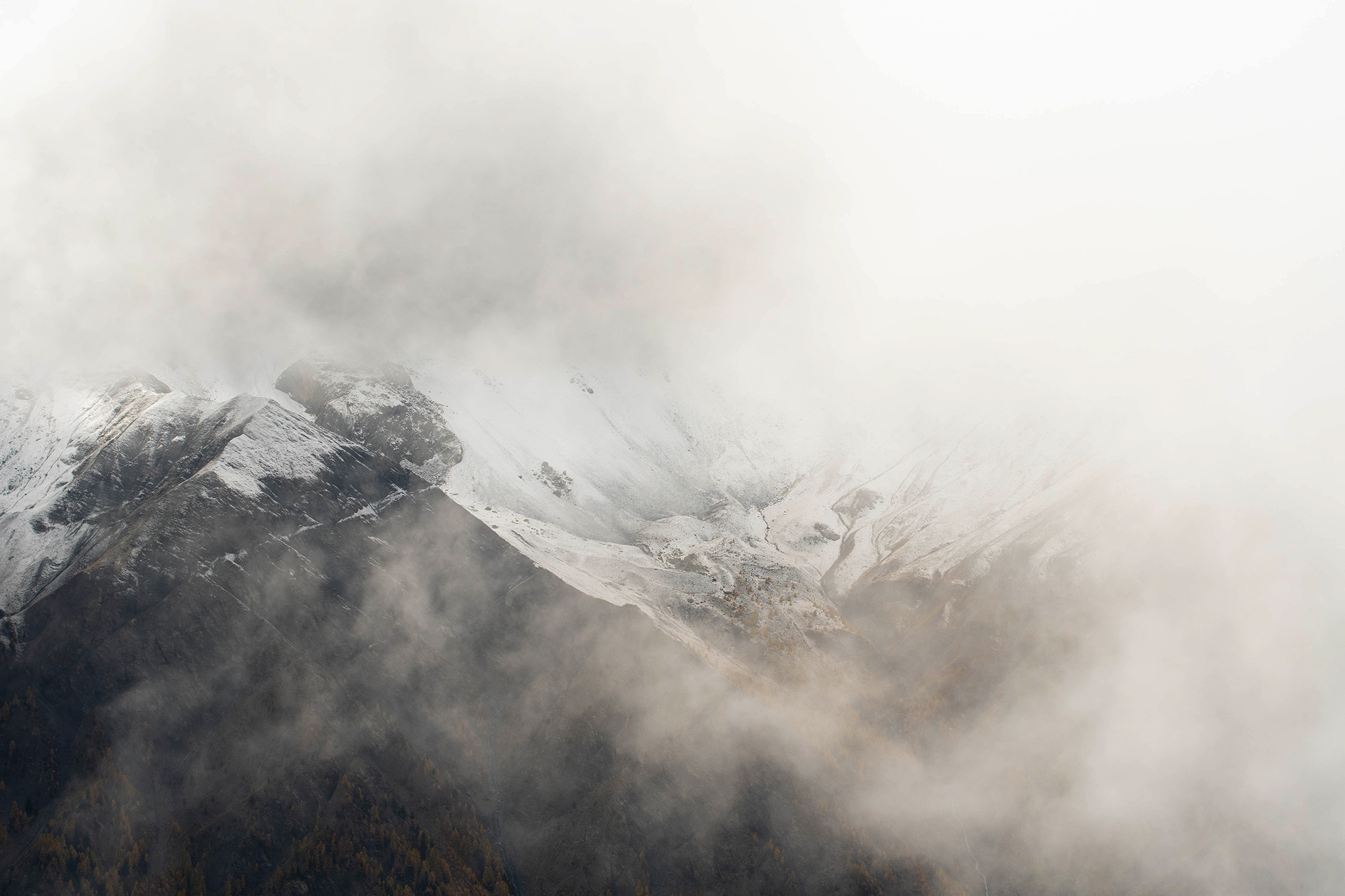 Au sommet, un vent violent soulève la neige saupoudrée et me claque au visage. Le ballet de nuages offre un spectacle magnifique que doivent connaître les alpinistes, moi qui ne suis qu’un simple cycliste venu côtoyer ce monde minéral et austère.