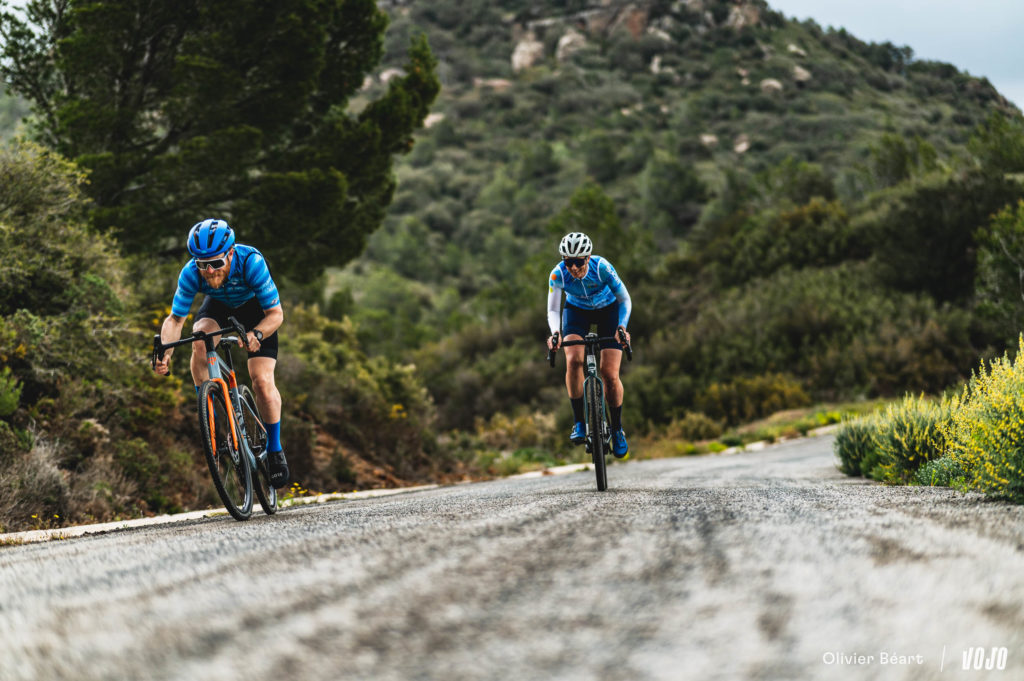 Notre guide nous a immédiatement indiqué que les chemins sur lesquels nous allons rouler sont jonchés de cailloux assez gros et que le Grifn sur les chemins de gravel catalans n’est pas un cadeau. Veerle et Olivier (avec son matériel photo), prennent le Kanzo Adventure, alors que Jeffry choisit le Grifn.