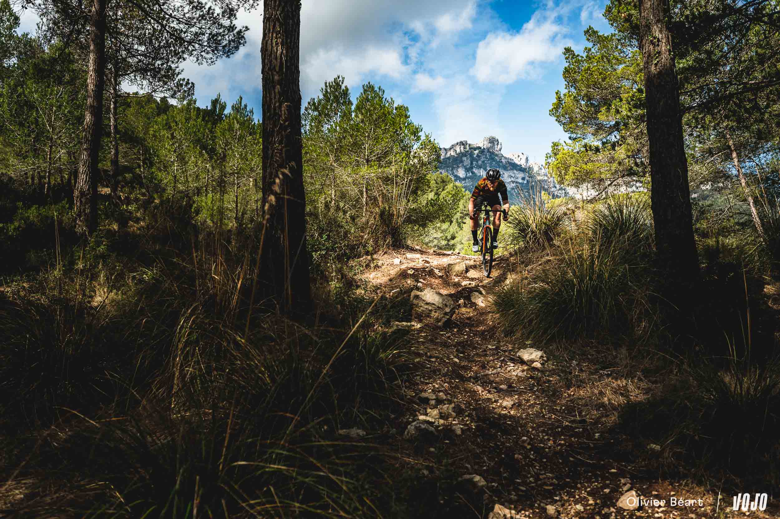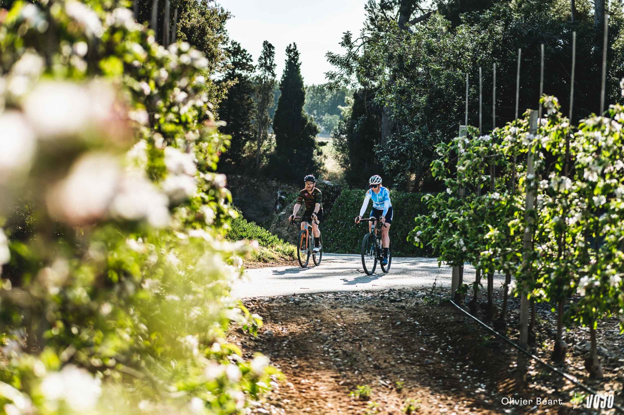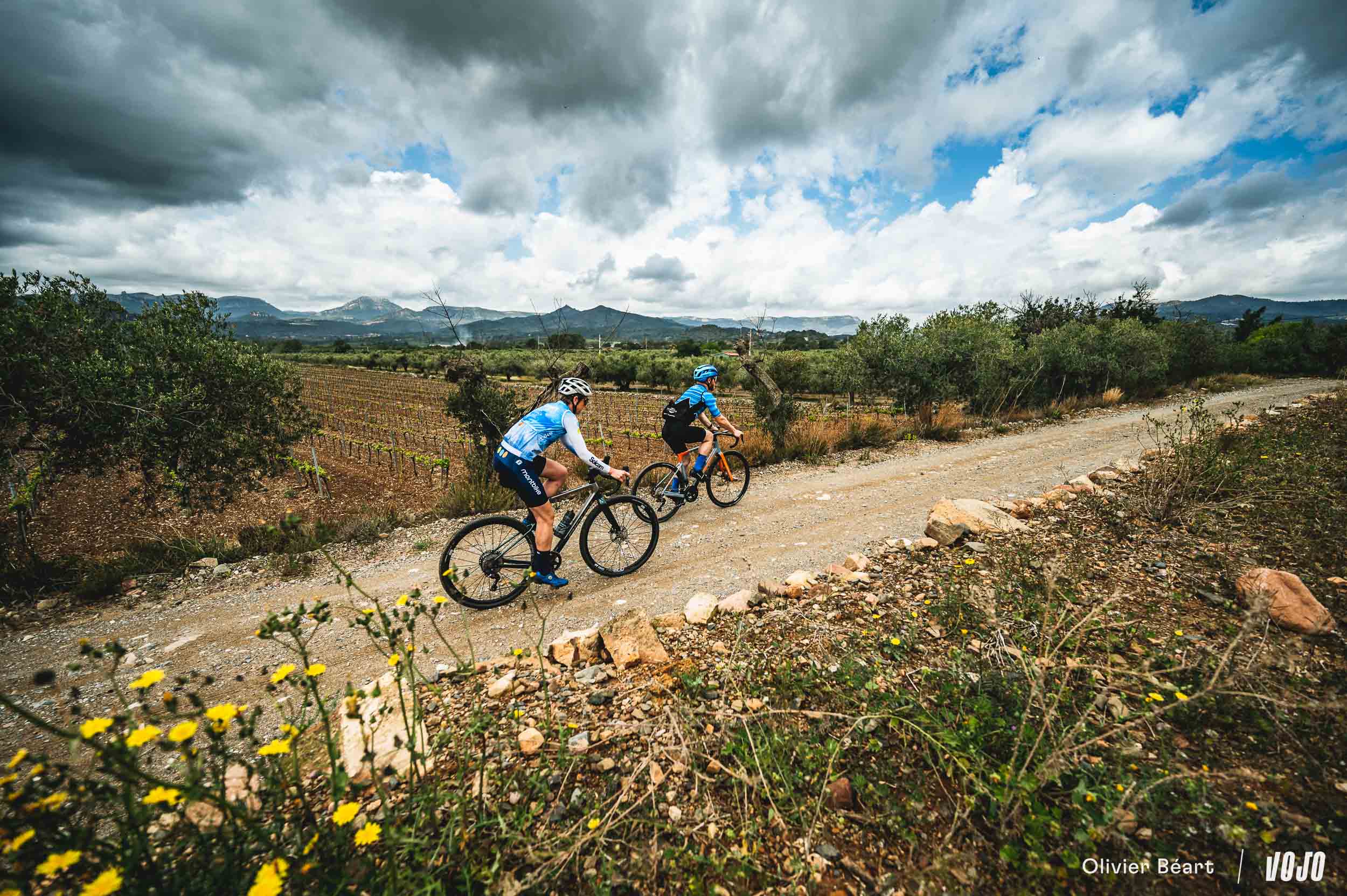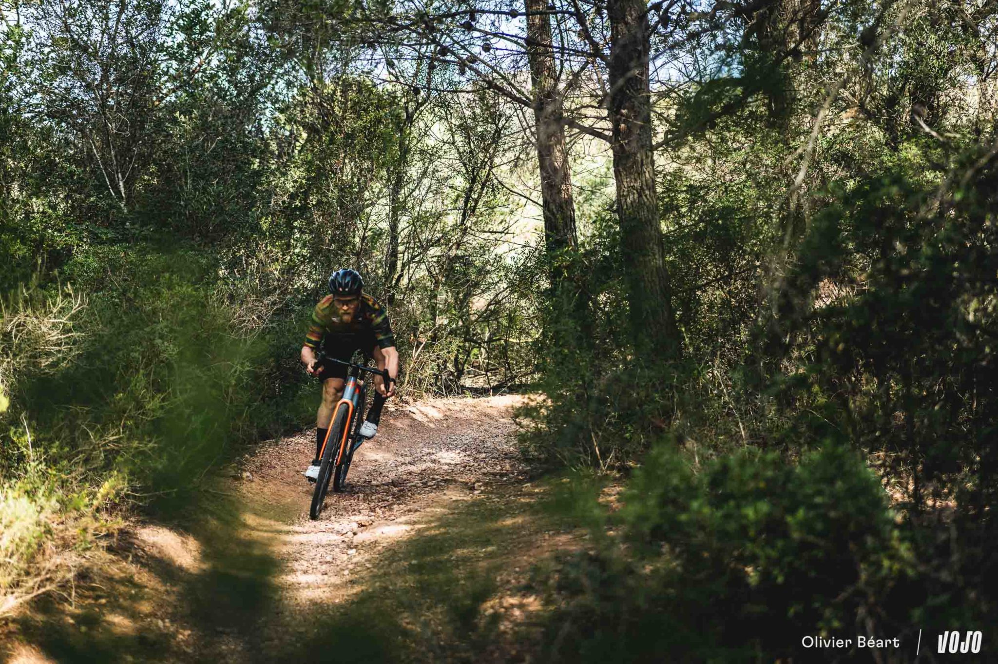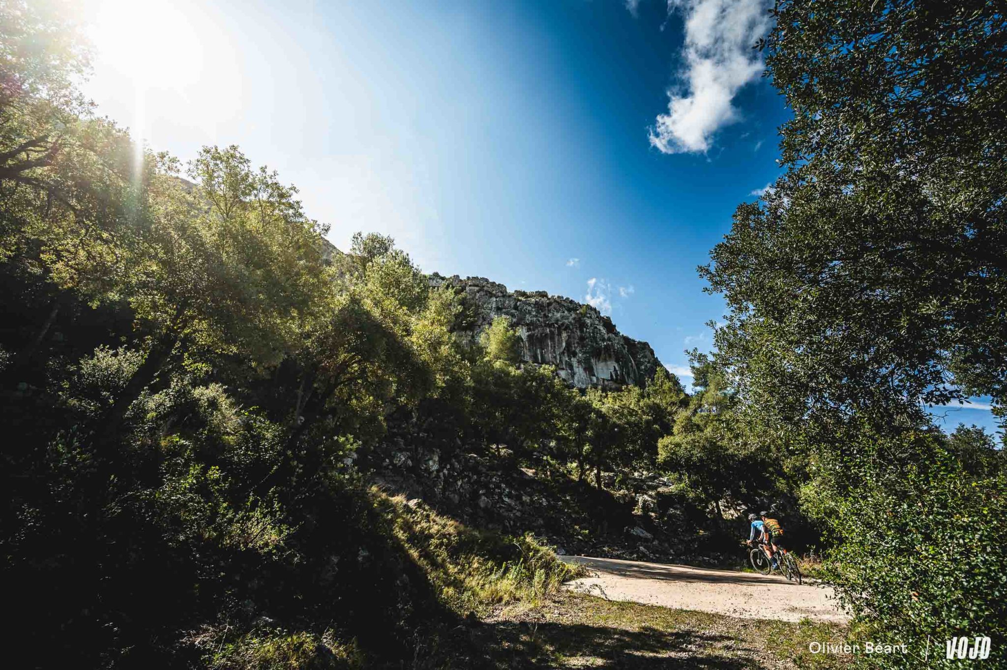 Notre guide nous a immédiatement indiqué que les chemins sur lesquels nous allons rouler sont jonchés de cailloux assez gros et que le Grifn sur les chemins de gravel catalans n’est pas un cadeau. Veerle et Olivier (avec son matériel photo), prennent le Kanzo Adventure, alors que Jeffry choisit le Grifn.