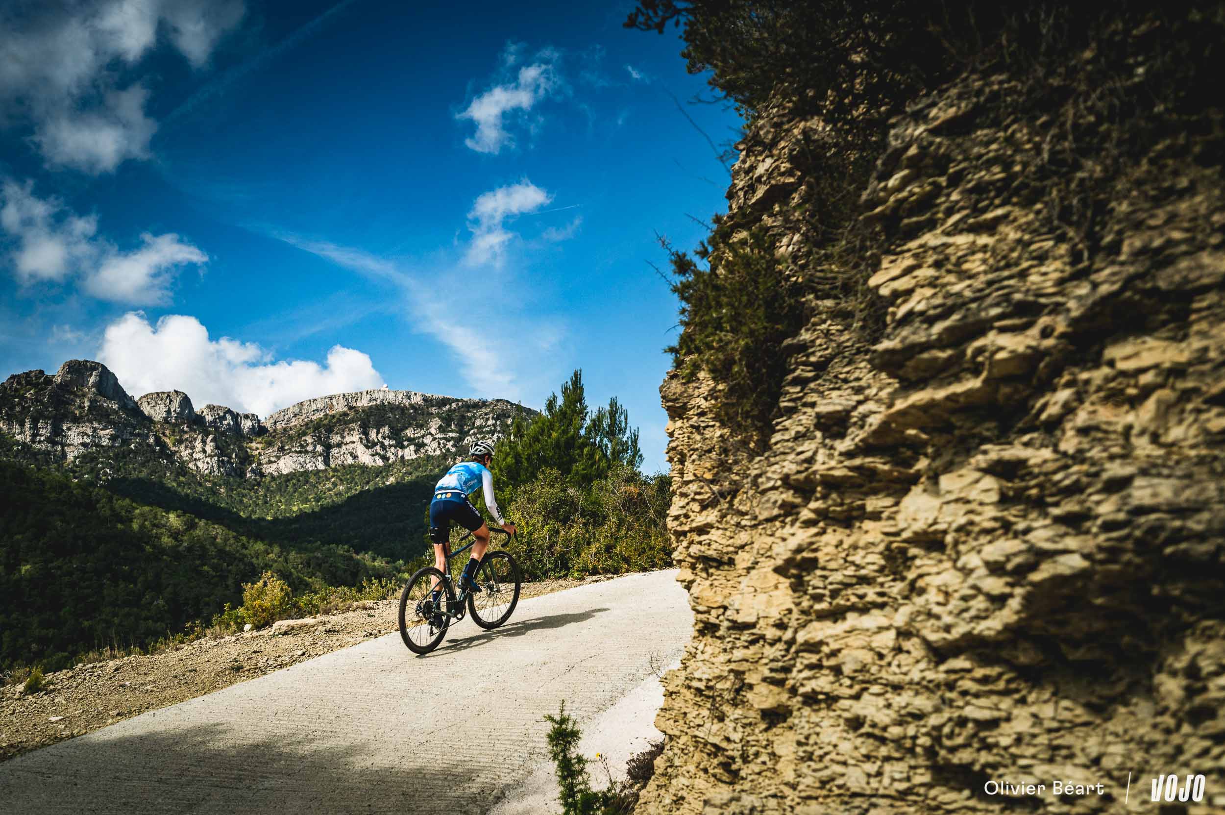 La montée fait plus de quatre kilomètres, mais n’affiche une pente moyenne que de 4%. L’asphalte est d’excellente qualité, il n’y a pas de circulation, le paysage est inspirant… Veerle nous raconte que de nombreux locaux viennent ici pour faire leur entraînement en bloc. On ne peut pas résister et sprinter sur la plaque avec notre Grifn !