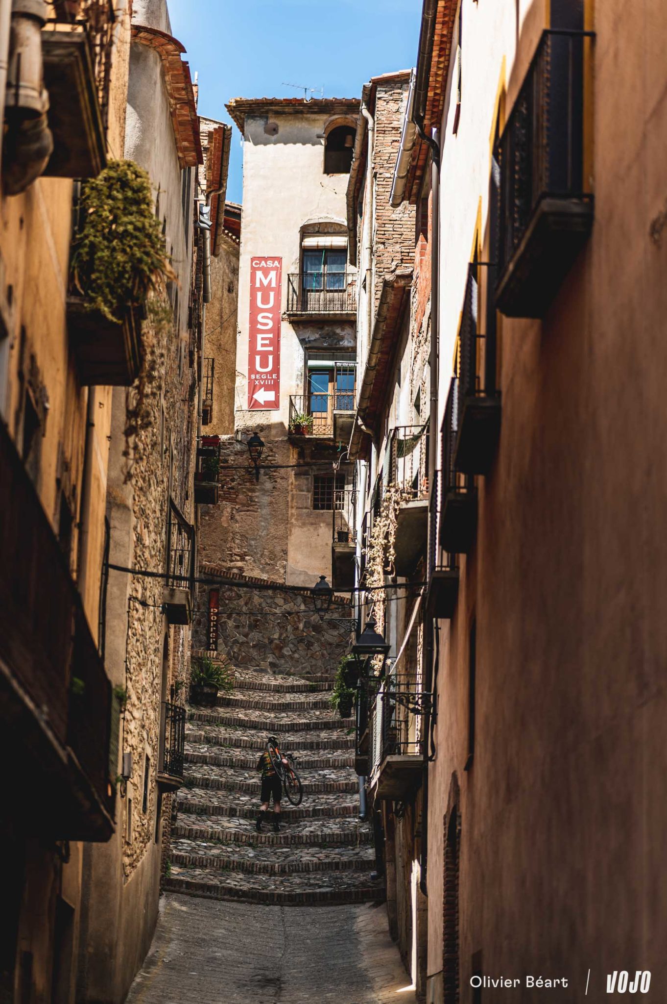 A propos d’arrêts, on peut bien sûr souffler un peu en pleine nature, mais notre tracé passe par de très nombreux petits villages dans lesquels il est fort plaisant de s’arrêter, comme Torre de Fontaubella (foto à gauche). Parfois, on ne fait que les frôler, mais on peut aussi prendre le temps d’y pénétrer pour mieux les découvrir, comme nous l’avons fait à Porrera (à droite) malgré ses nombreux escaliers raides pas très « vélo friendly ».