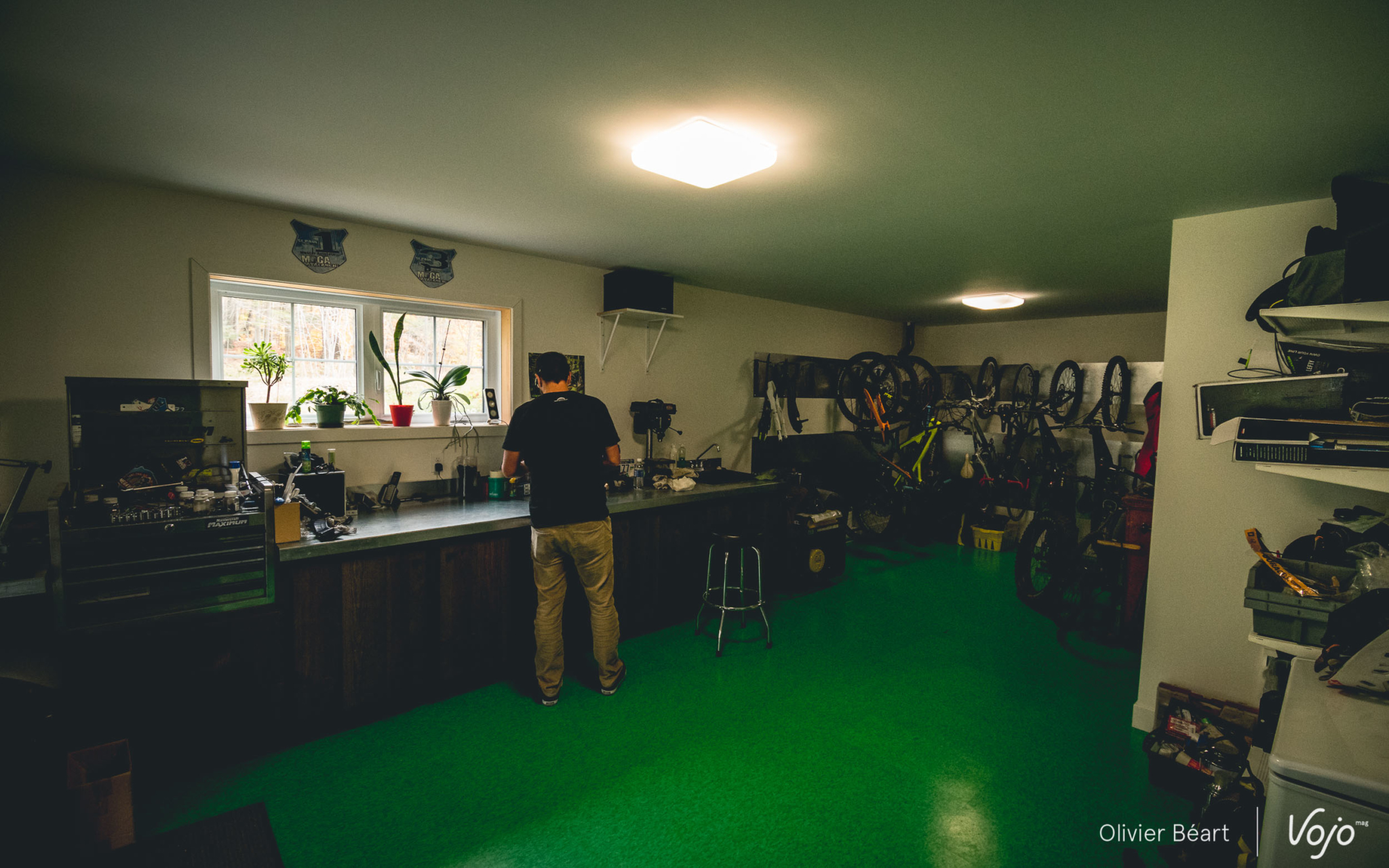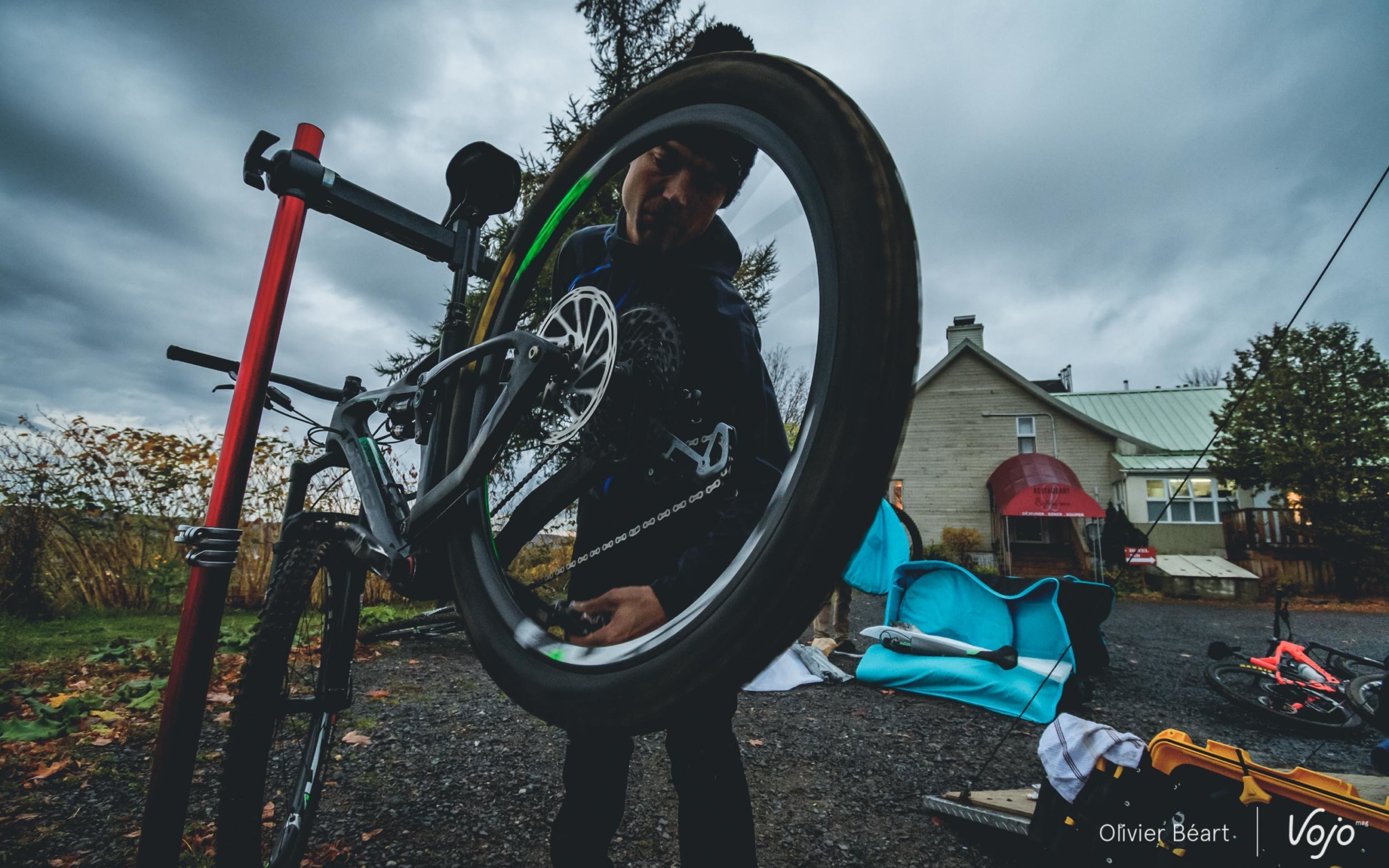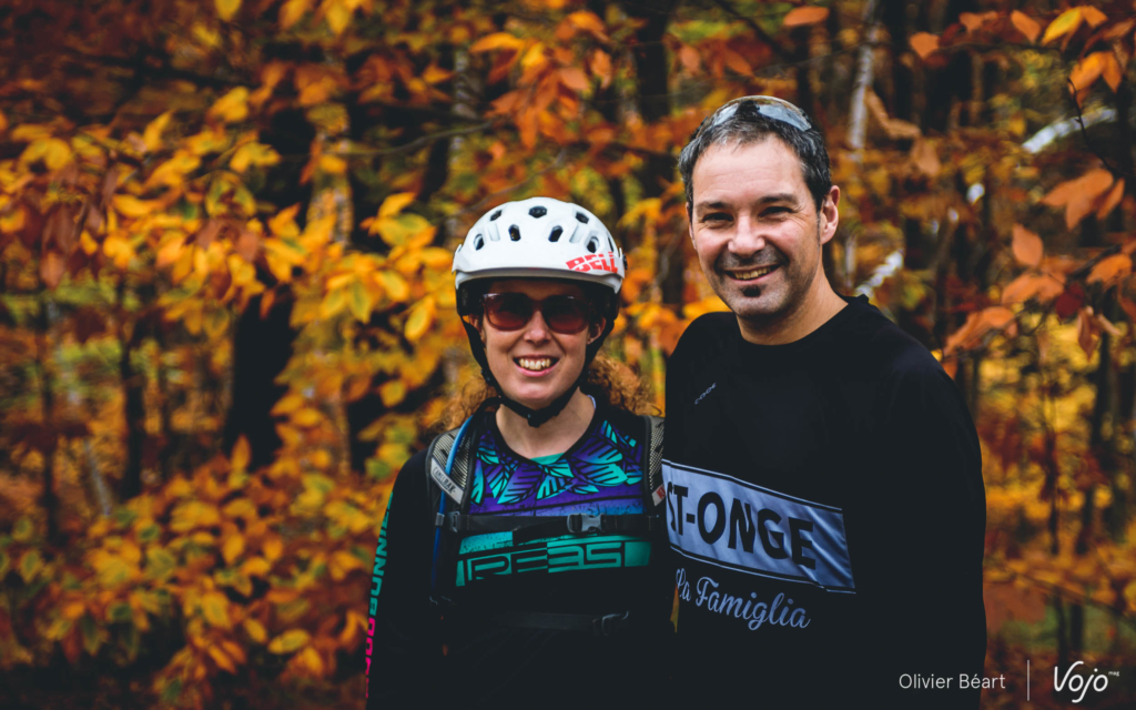 Comme si c’était un signe, quand nous approchons de notre destination, le soleil refait son apparition. Il illumine une nouvelle fois les couleurs d’automne de la forêt. Magique. La région est très prisée des Montréalais et les grosses villas sont légion. Celle de nos guides, Emilie et Bob, deux figures du VTT local à la simplicité et au sourire communicatifs, paraît presque petite à côté de certains immenses complexes. Mais elle a de quoi faire rêver pas mal de bikers, avec son sous-sol dédié au vélo de montagne et son accès quasi direct aux sentiers !