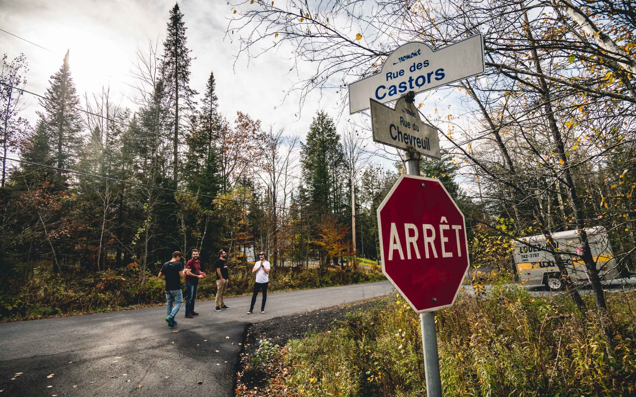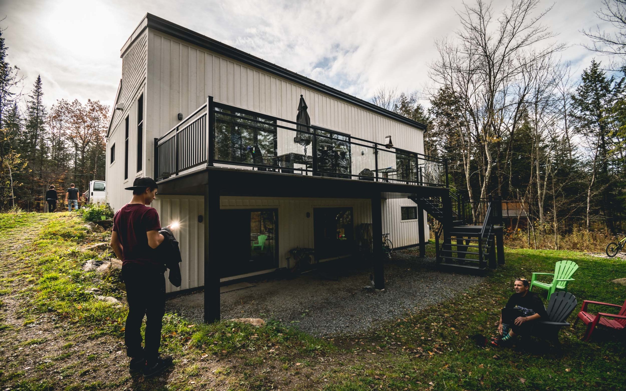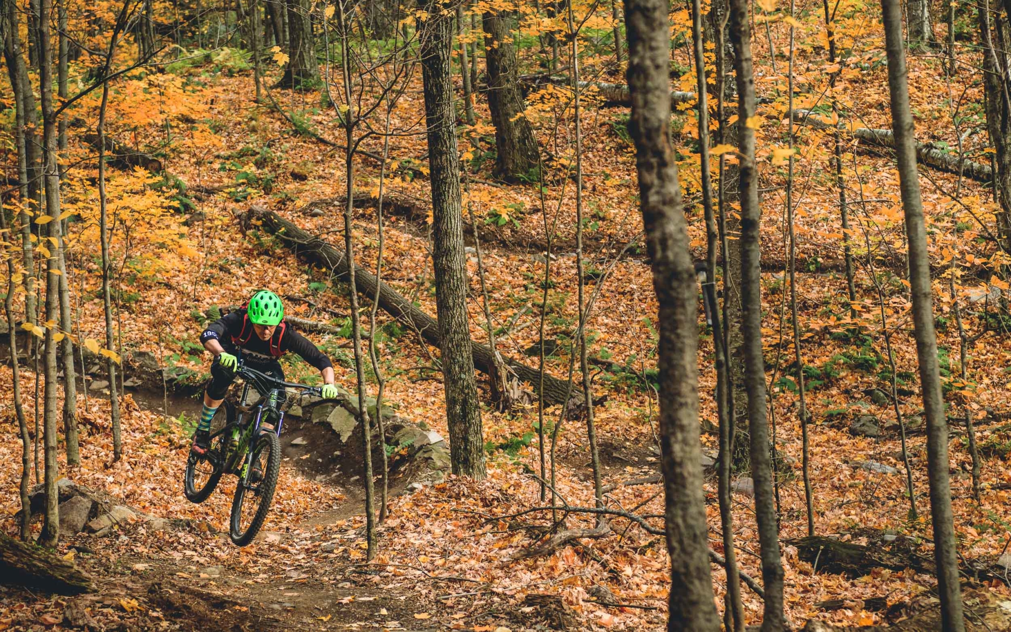 Comme si c’était un signe, quand nous approchons de notre destination, le soleil refait son apparition. Il illumine une nouvelle fois les couleurs d’automne de la forêt. Magique. La région est très prisée des Montréalais et les grosses villas sont légion. Celle de nos guides, Emilie et Bob, deux figures du VTT local à la simplicité et au sourire communicatifs, paraît presque petite à côté de certains immenses complexes. Mais elle a de quoi faire rêver pas mal de bikers, avec son sous-sol dédié au vélo de montagne et son accès quasi direct aux sentiers !