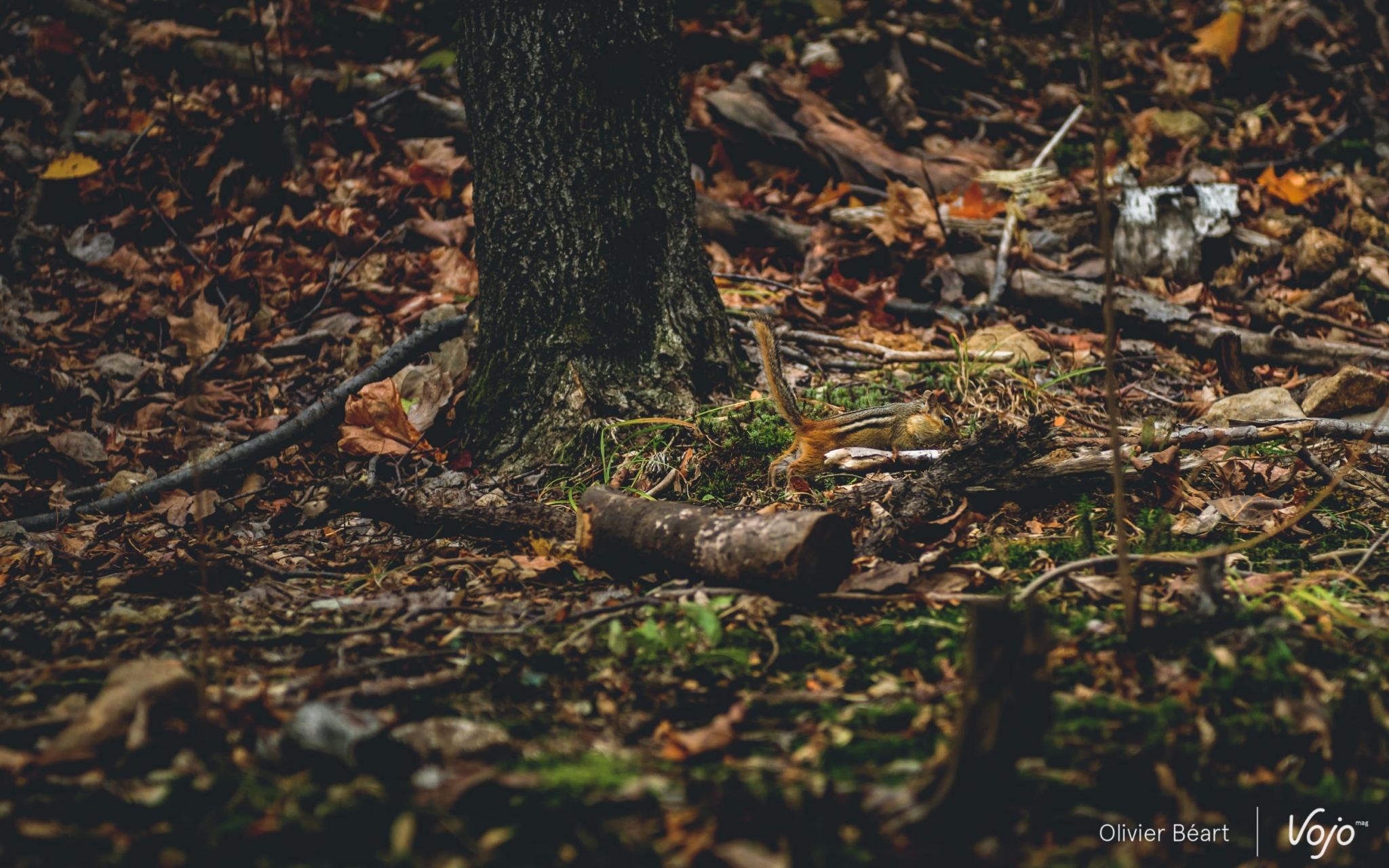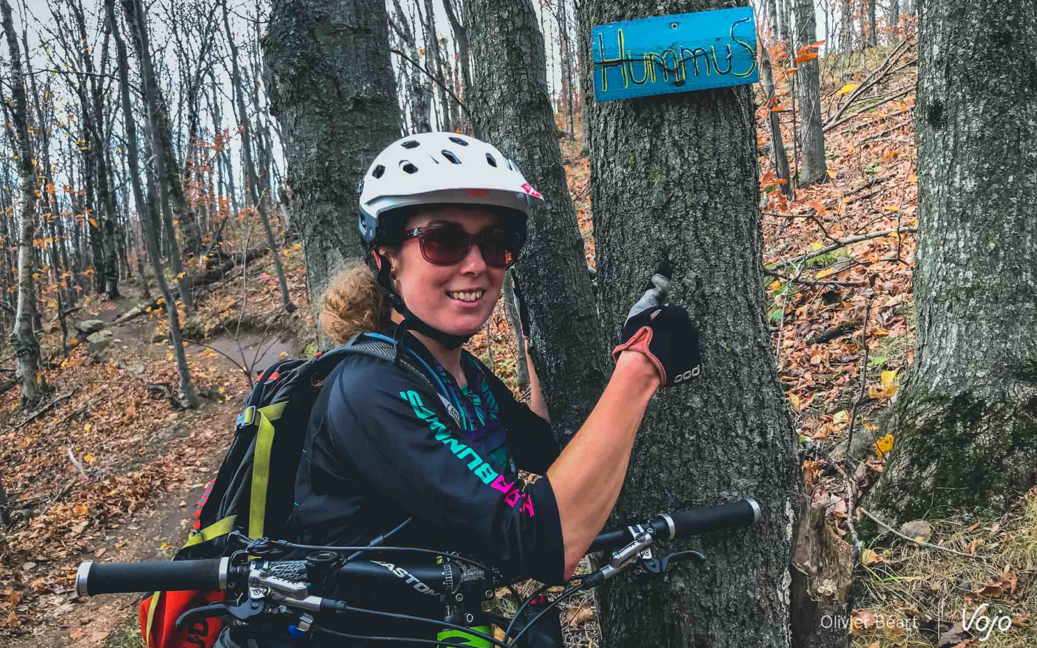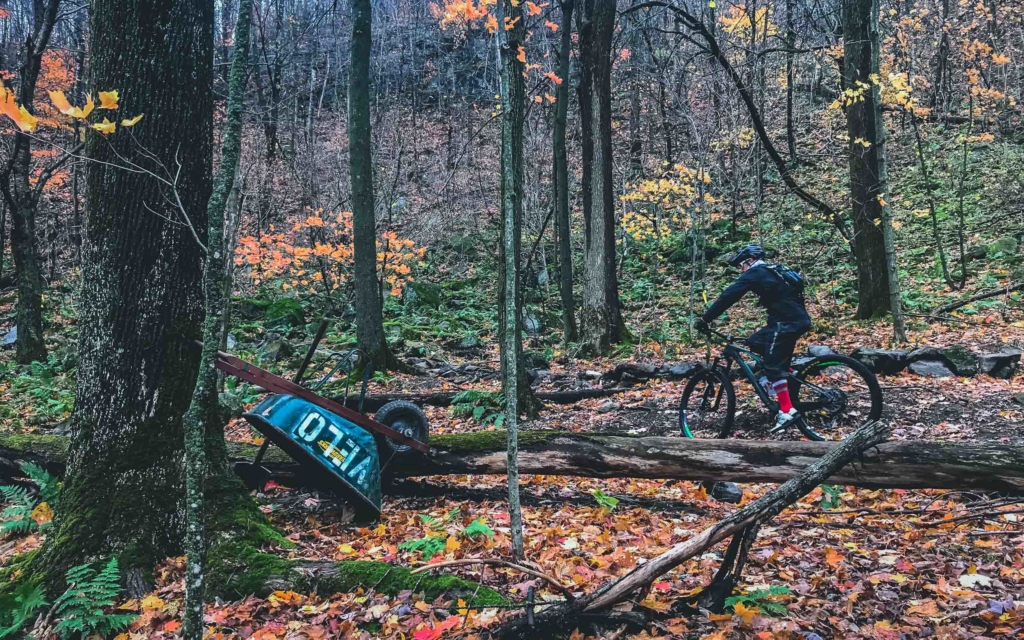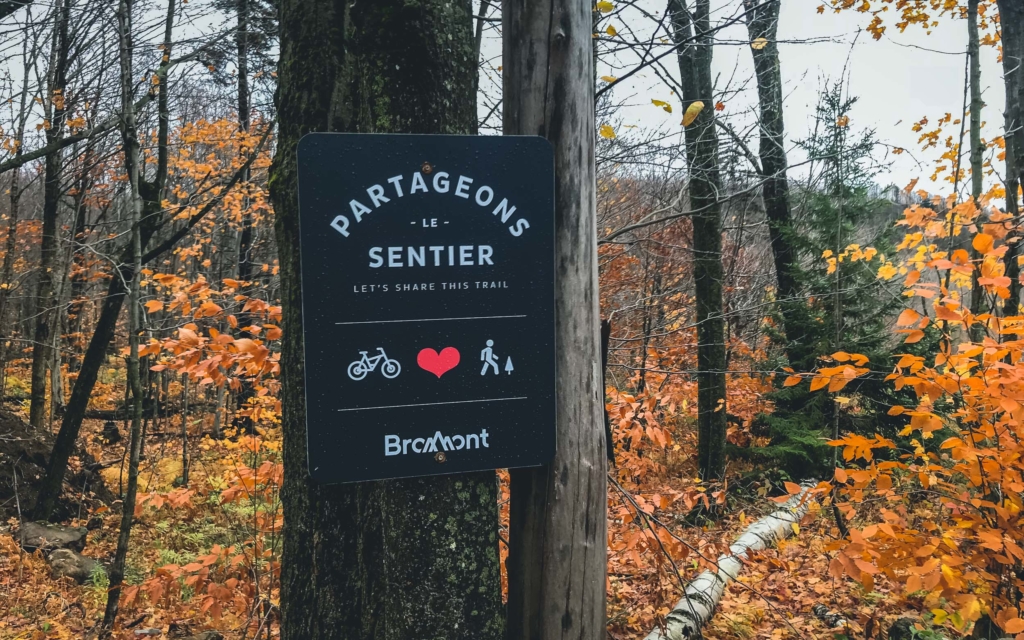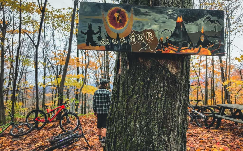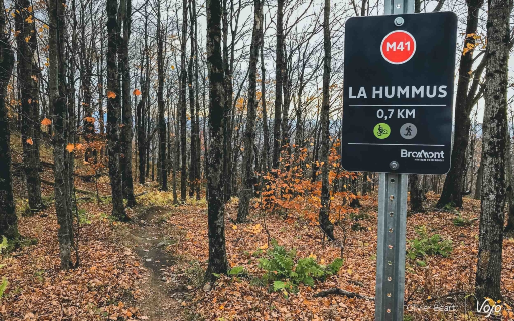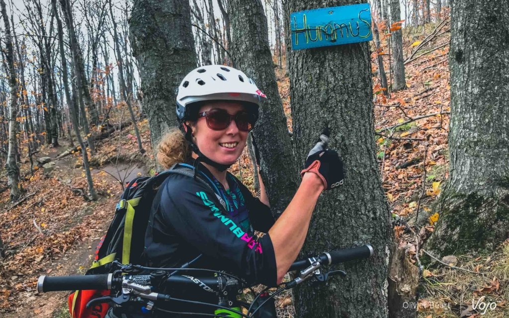 D’ailleurs, la magie de Bromont ne s’arrête pas là. Au détour d’un sentier, Emilie nous arrête et nous montre un petit panneau de bois, très discret, portant l’inscription « Hummus », le nom du trail. « C’est une des premières que j’ai faites. Maintenant, il y en a sur presque tous les sentiers. Et certaines, comme sur la Mordor, sont beaucoup plus travaillées. » En étant attentifs, on remarque aussi que toute une série de petits objets sont posés ça et là sur les bords du sentiers, posés tels des offrandes par des riders anonymes désireux de montrer leur reconnaissance aux créateurs des sentiers par ces petits clins d’oeil.