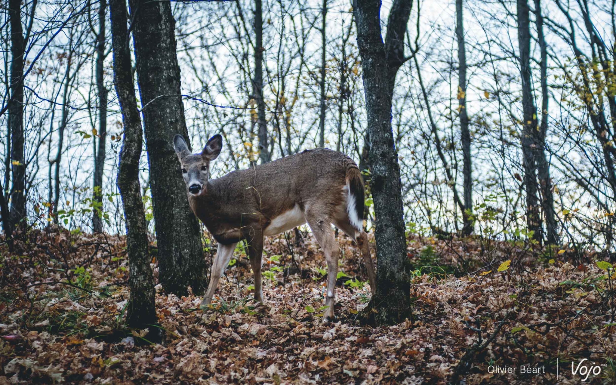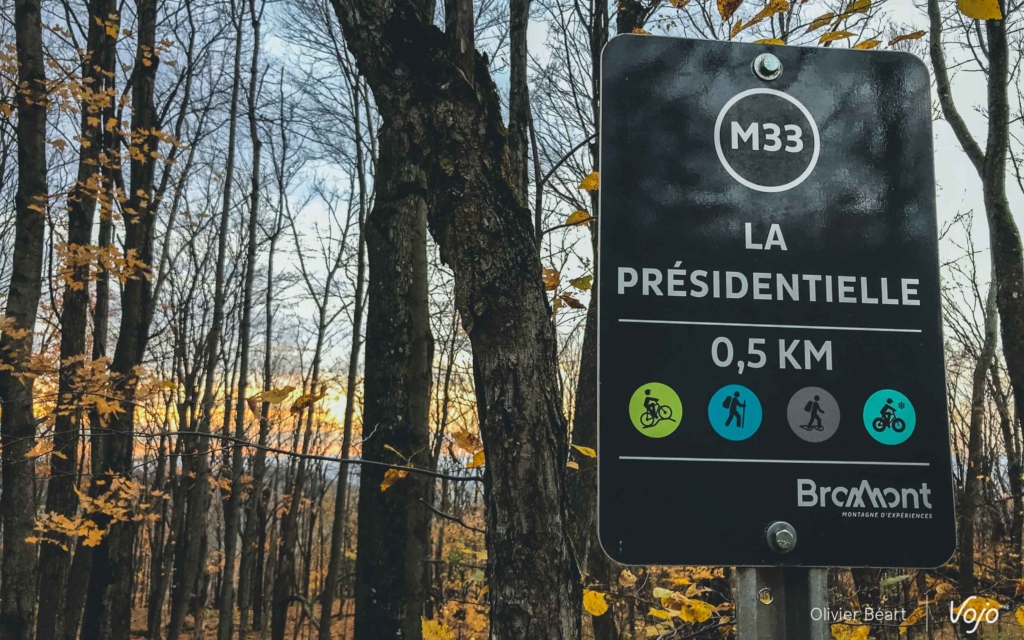 Au fur et à mesure de notre grimpette, des options de chemins plus étroits s’offrent à nous. Quand la forêt s’ouvre un peu, et quand les arbres ont moins de feuille à l’approche du sommet du Mont Chevreuil (situé à un peu moins de 500m, alors que le bas de la station est à 139m), on se rend compte qu’on roule juste sur quelques « pains de sucre » posés au milieu d’immenses plaines sans grand relief. La sensation de rouler dans un petit coin de paradis n’en est que renforcée.