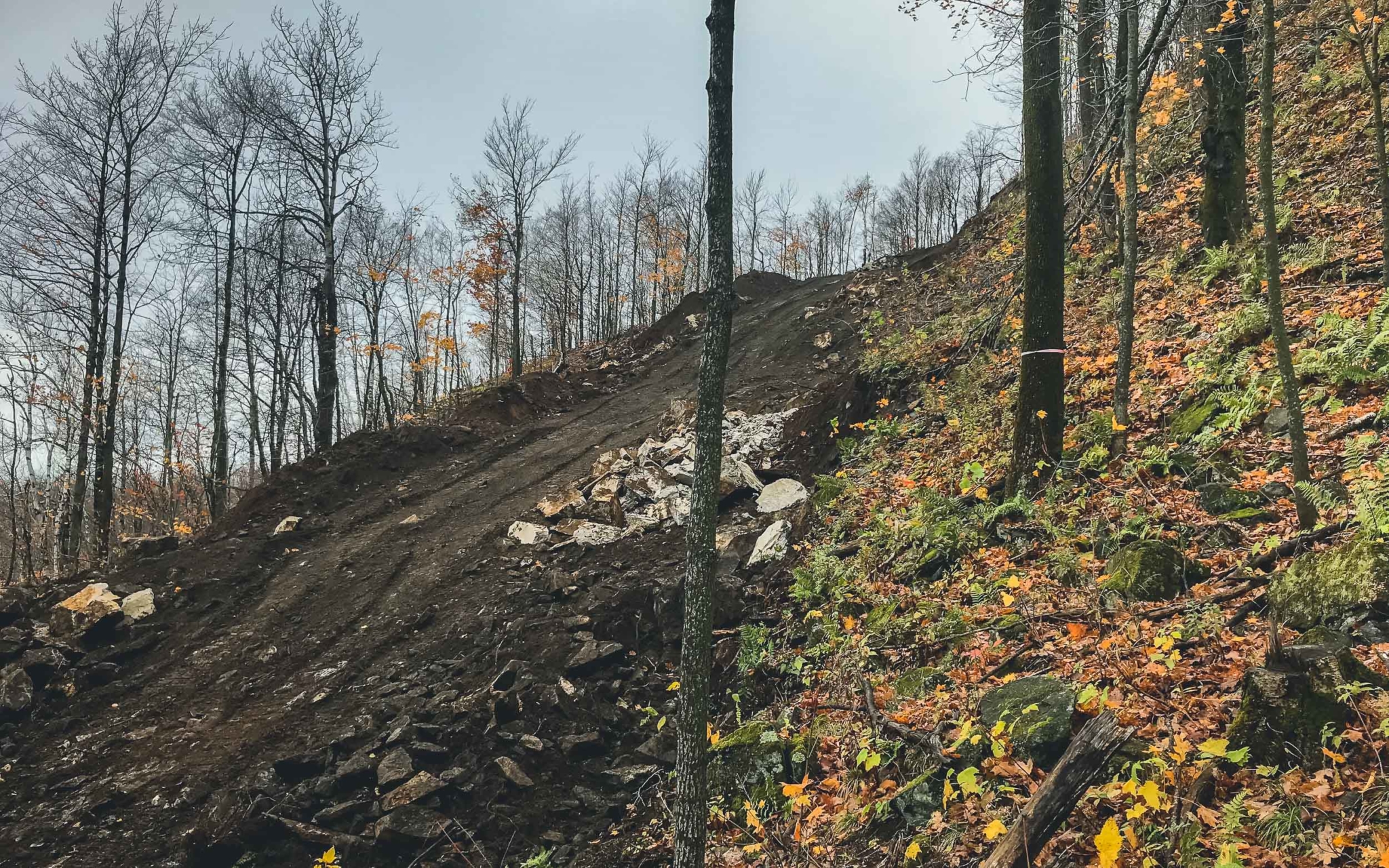 Un bruit assourdissant se fait entendre tout à coup au détour d’un virage : d’énormes engins construisent de nouvelles pistes de ski à grands coups de pelle, voire même de bâtons de dynamite. Chez nos amis, c’est l’incompréhension : « Ils saccagent des zones entières pour faire de grandes pistes bleues faciles. Et cela, alors qu’il y a de moins en moins de neige. Franchement, on ne comprend pas. Et nos trails de VTT, c’est bien le dernier de leurs soucis, » s’emporte Eric, bien décidé cependant à ne pas abandonner le combat.