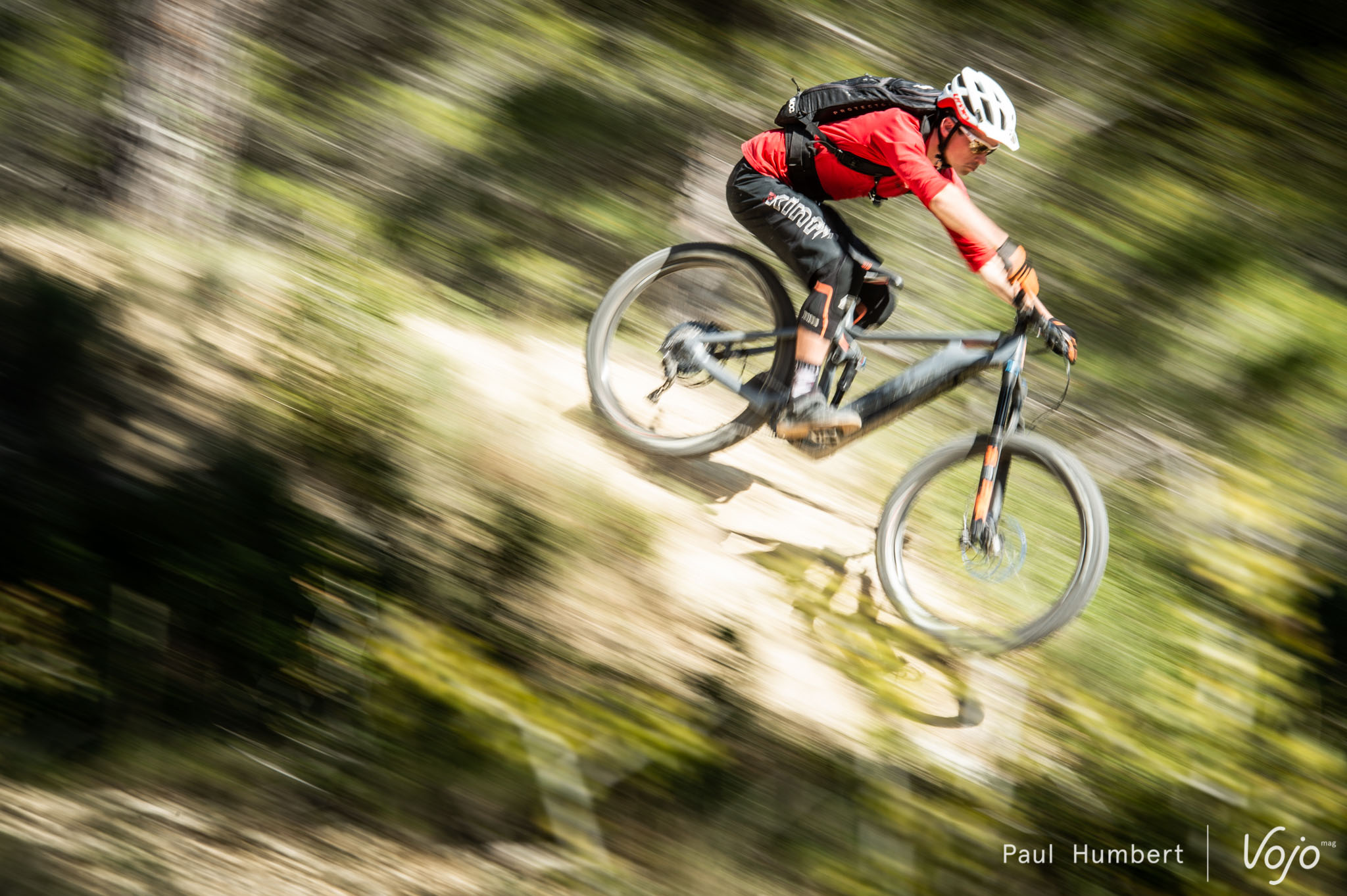 On continue notre cheminement pour rejoindre des pierriers de roche blanche. Dans la roue de Kevin, on lâche les freins pour se laisser flotter avant d’emboiter le pas d’Anne-Caroline Chausson pour un passage on ne peut plus joueur dans les bois.