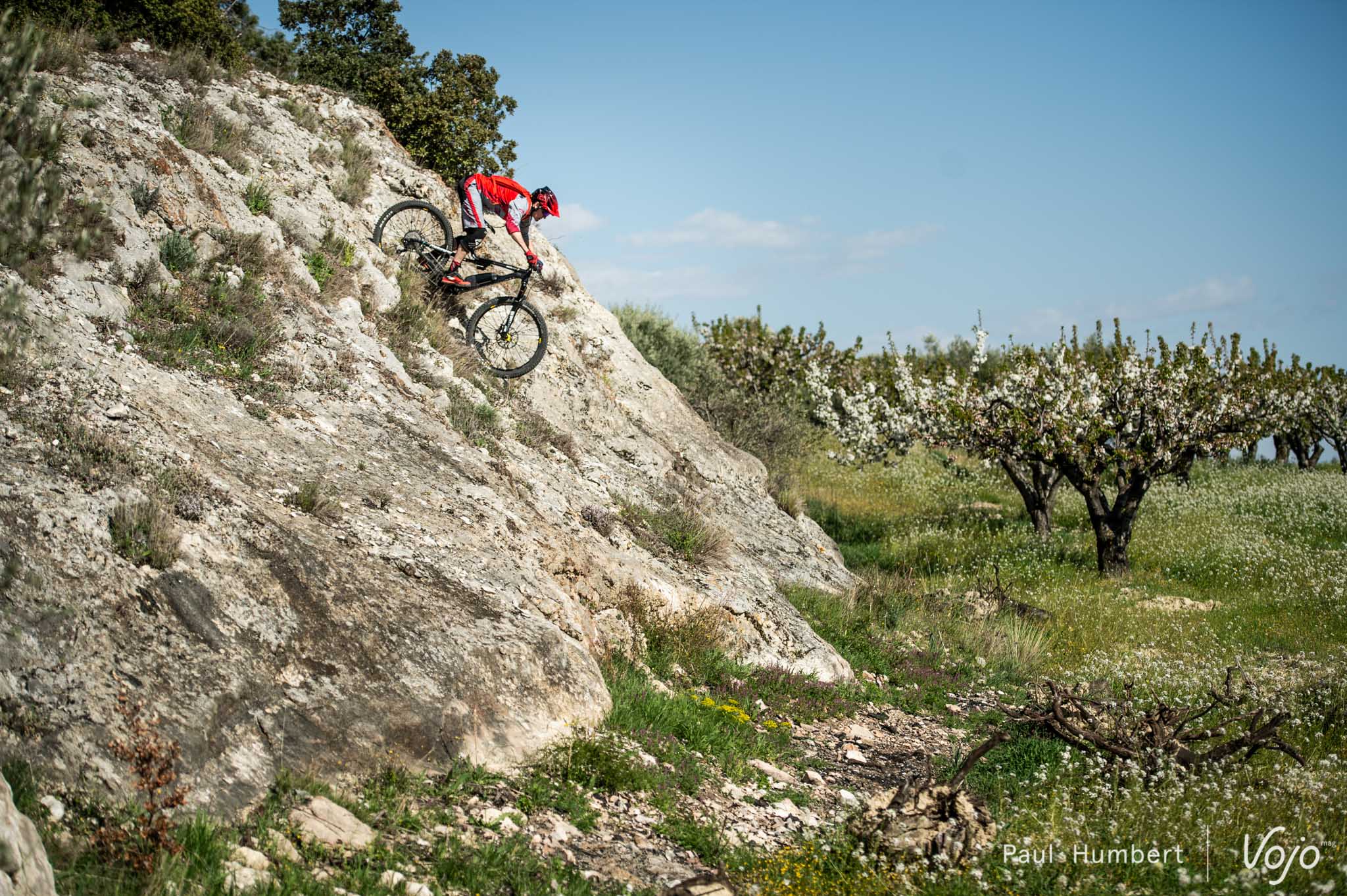 Nous finissons par arriver sur une crête surplombant la vallée, sur les flancs du Ventoux. Devant nous, une ligne rocailleuse qui nous amène dans un sous-bois offrant de superbes passages de dalles. Le tracé concocté par Jey est tout simplement sublime.