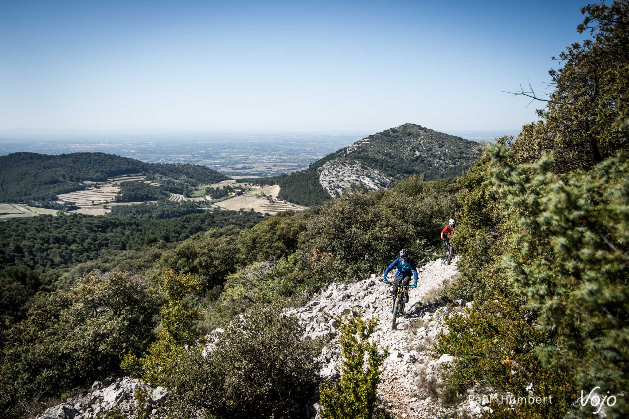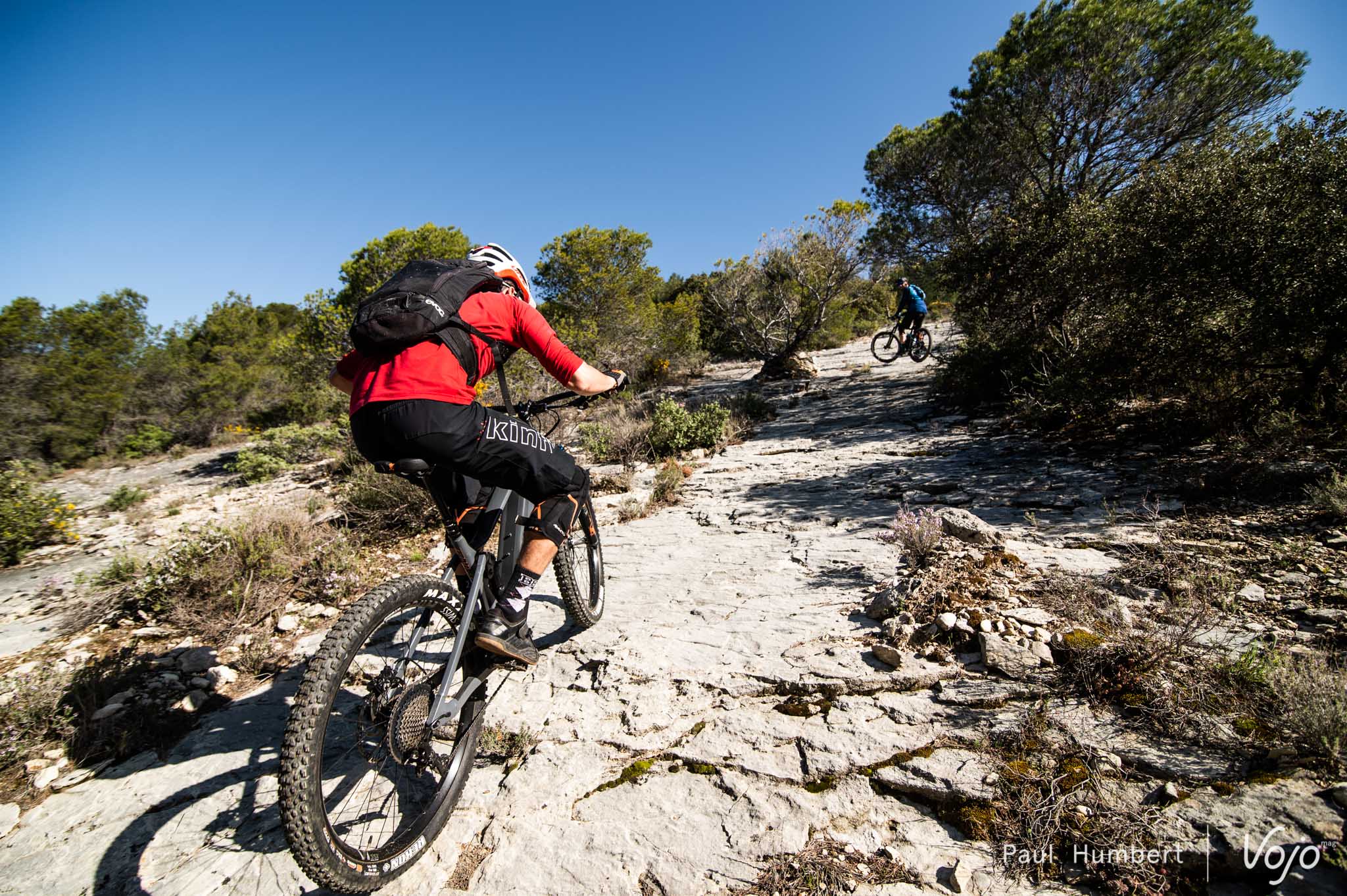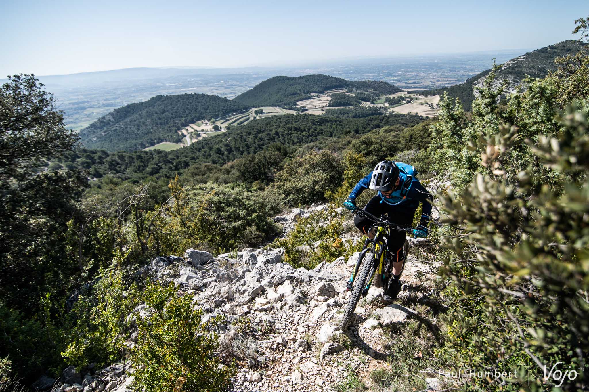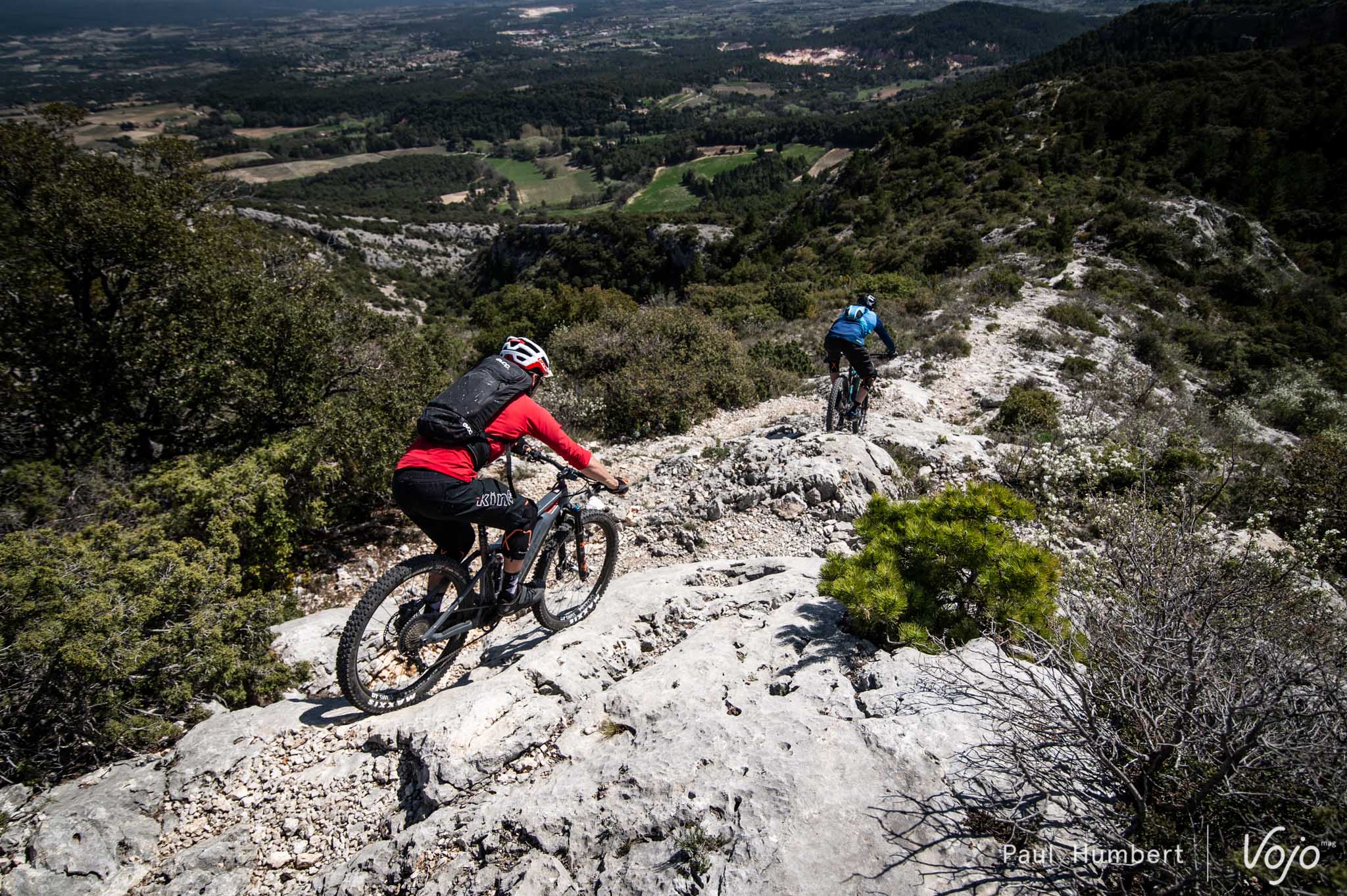 Nous finissons par arriver sur une crête surplombant la vallée, sur les flancs du Ventoux. Devant nous, une ligne rocailleuse qui nous amène dans un sous-bois offrant de superbes passages de dalles. Le tracé concocté par Jey est tout simplement sublime.