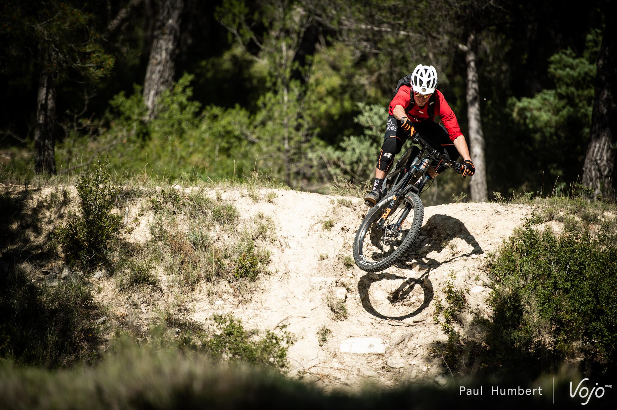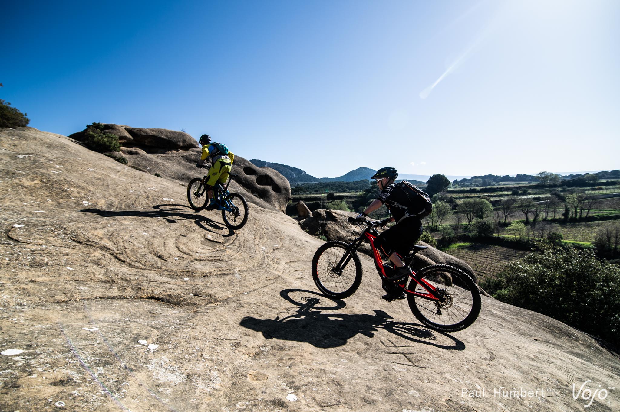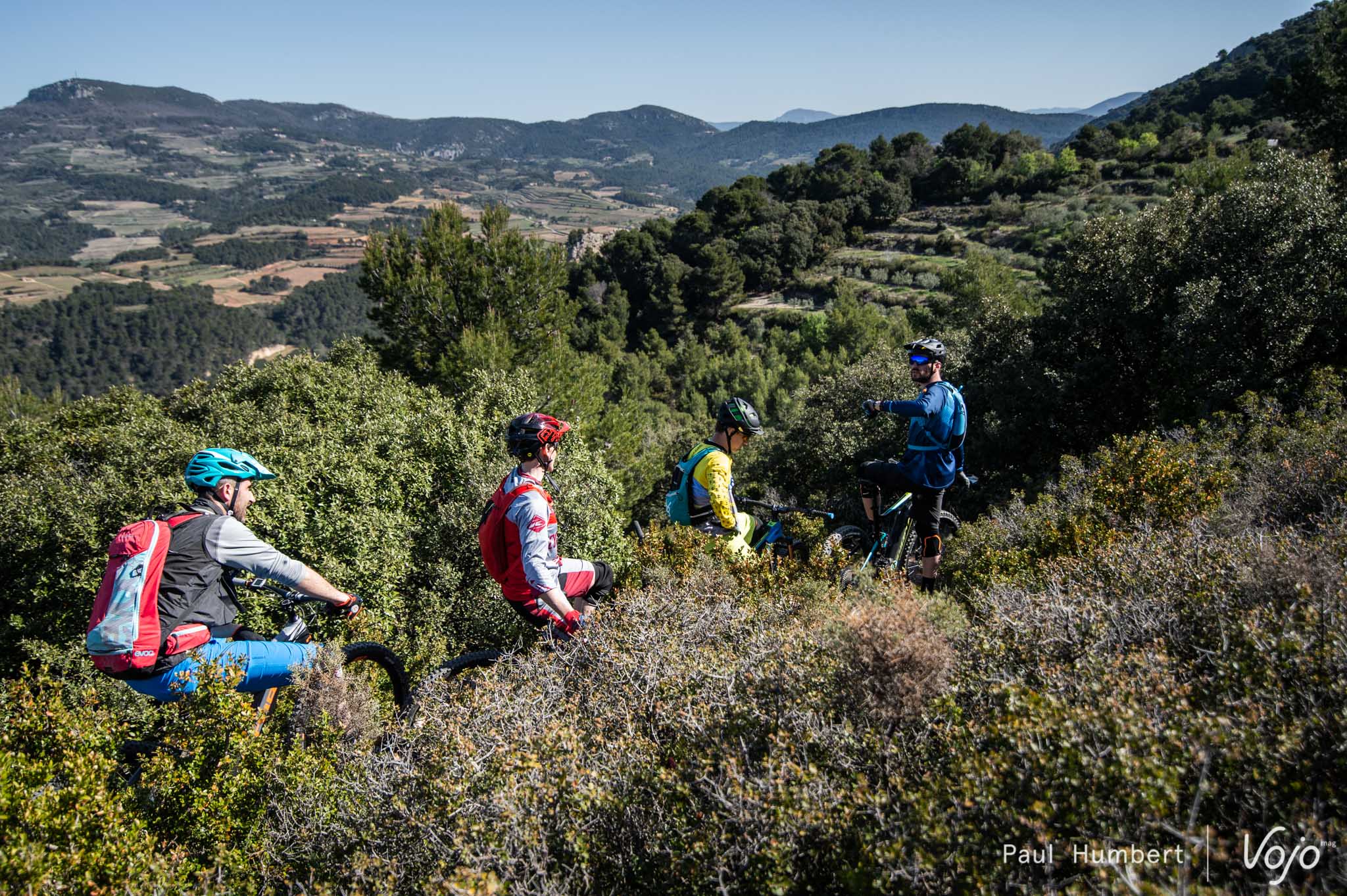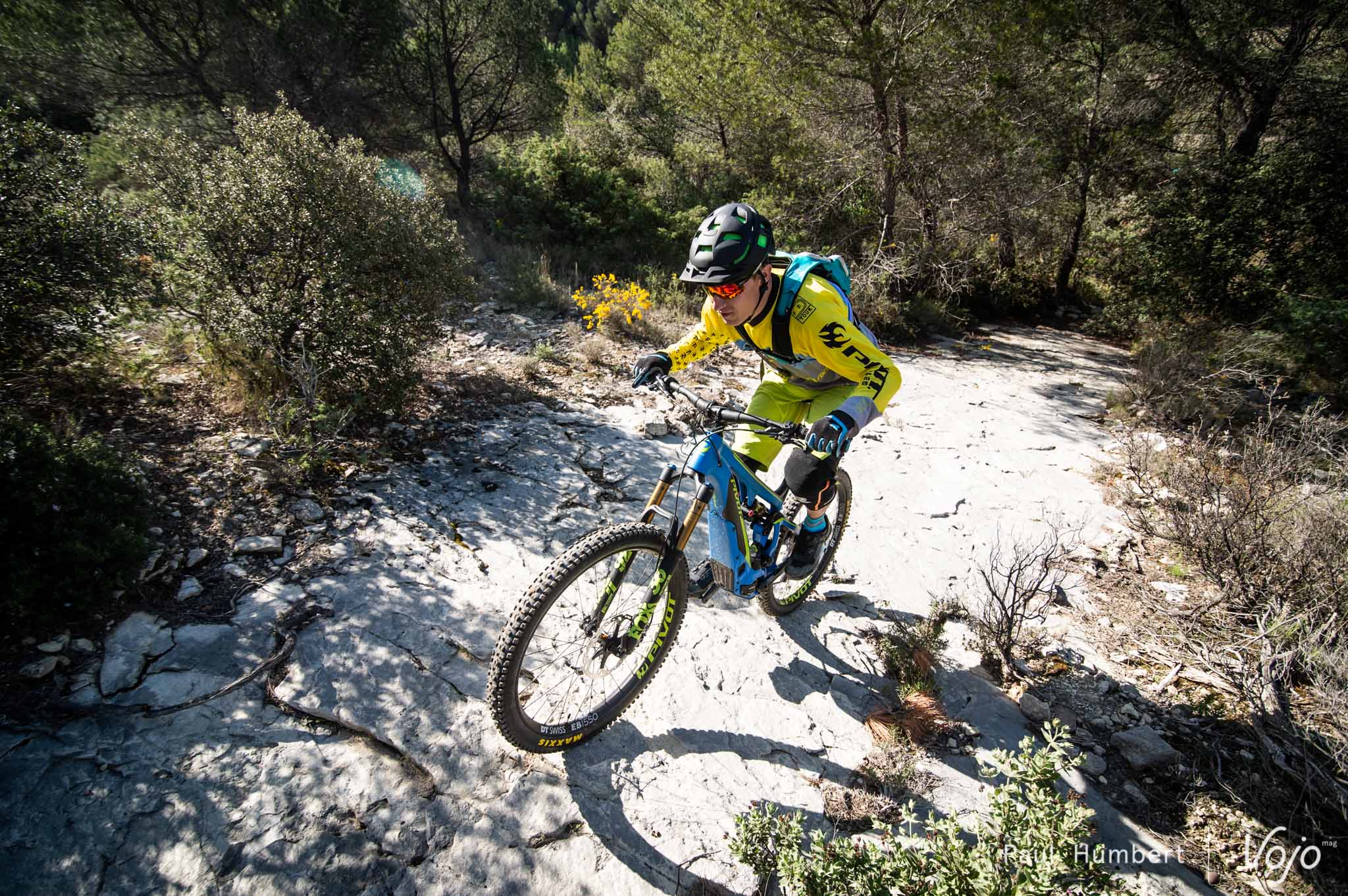 Nous finissons par arriver sur une crête surplombant la vallée, sur les flancs du Ventoux. Devant nous, une ligne rocailleuse qui nous amène dans un sous-bois offrant de superbes passages de dalles. Le tracé concocté par Jey est tout simplement sublime.