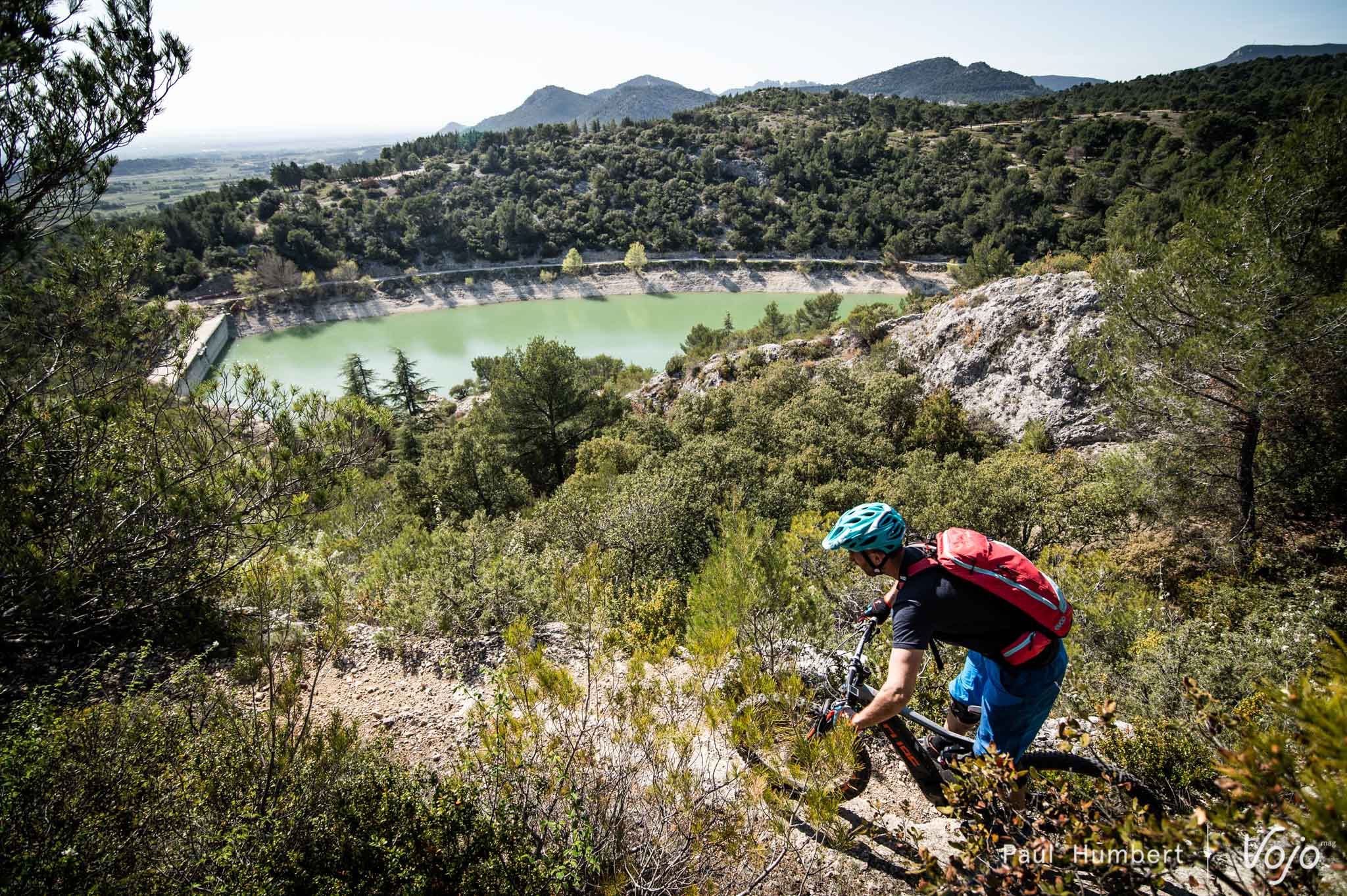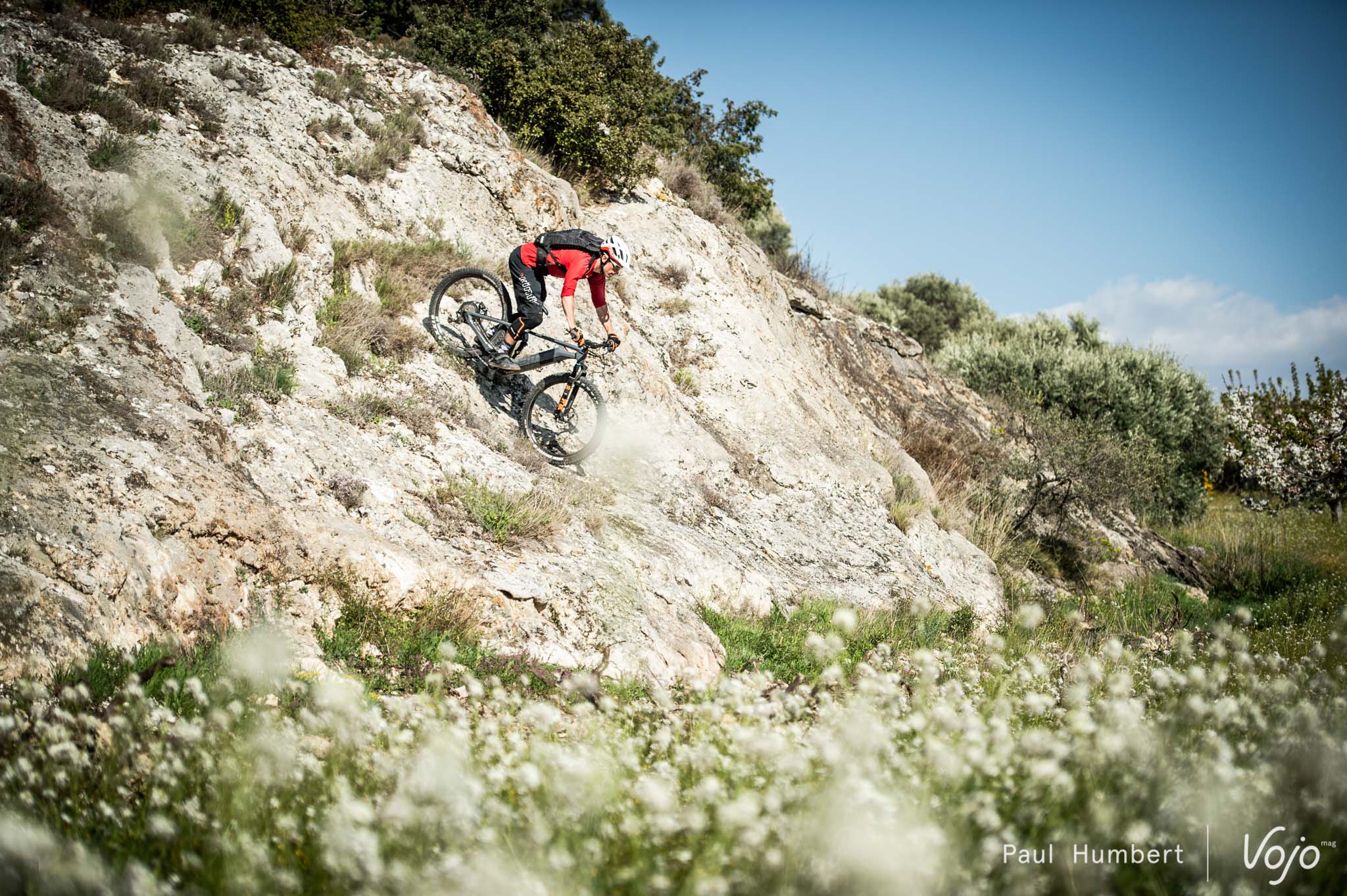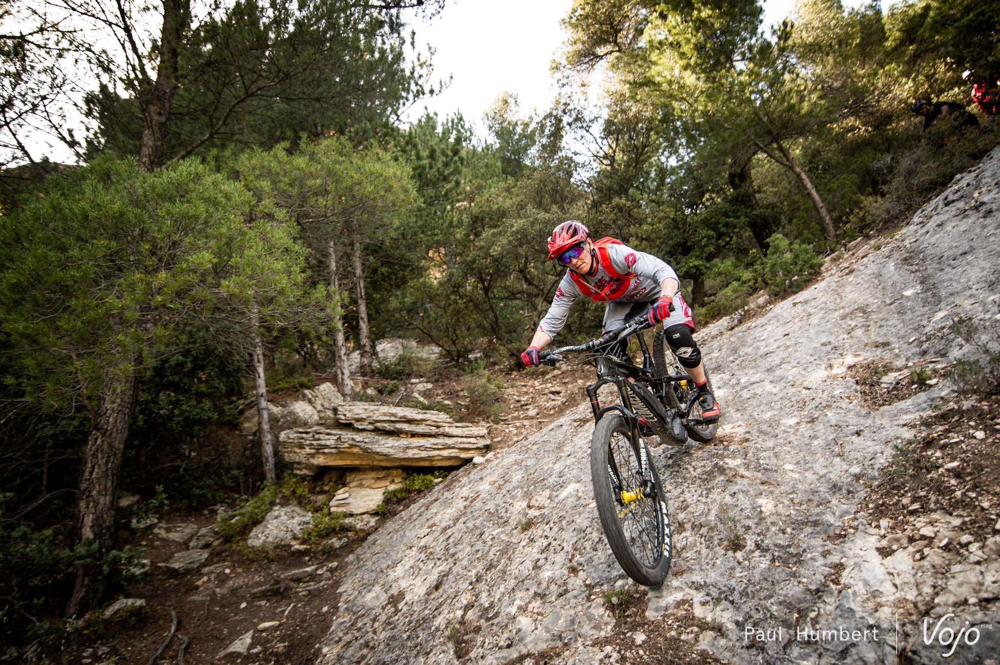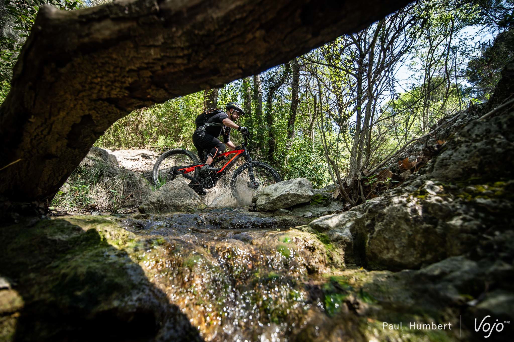 Nous finissons par arriver sur une crête surplombant la vallée, sur les flancs du Ventoux. Devant nous, une ligne rocailleuse qui nous amène dans un sous-bois offrant de superbes passages de dalles. Le tracé concocté par Jey est tout simplement sublime.