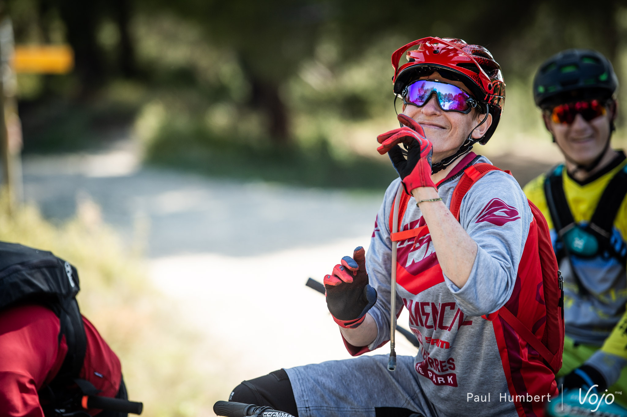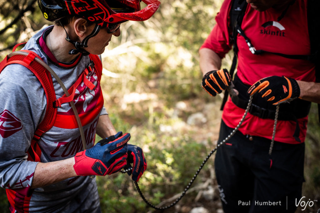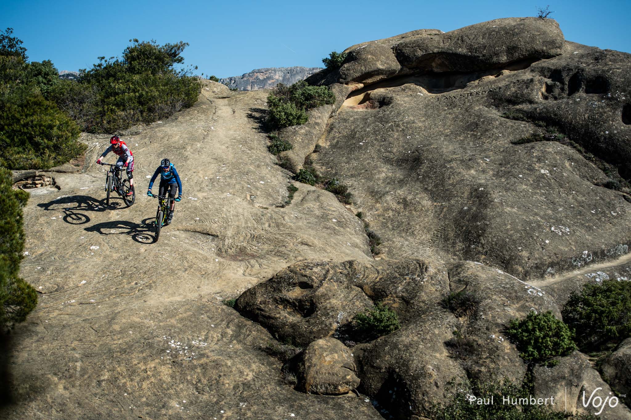 On continue notre cheminement pour rejoindre des pierriers de roche blanche. Dans la roue de Kevin, on lâche les freins pour se laisser flotter avant d’emboiter le pas d’Anne-Caroline Chausson pour un passage on ne peut plus joueur dans les bois.