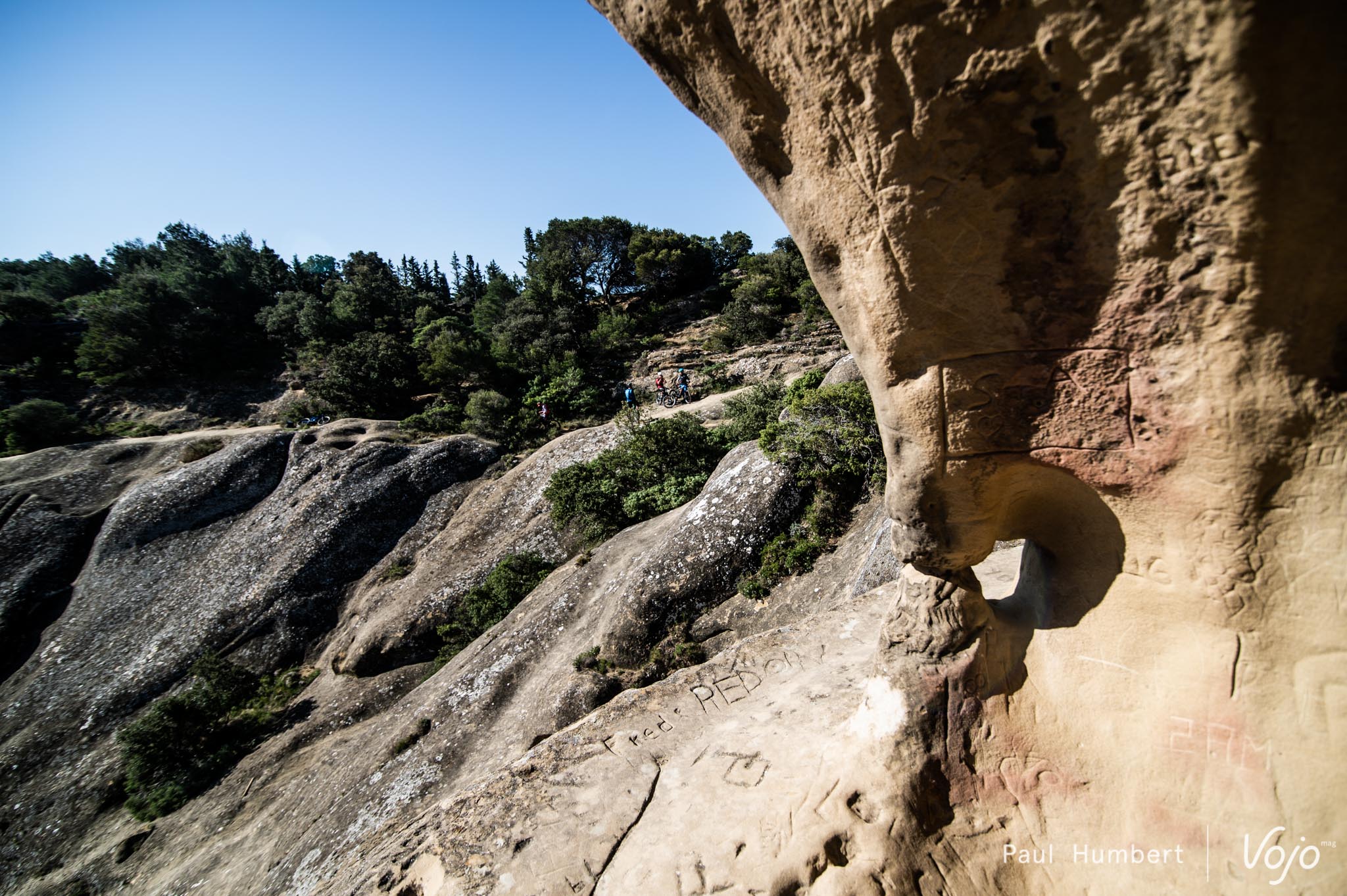 Malgré un rythme bien « sport », on trouve le temps d’admirer le paysage, mais il faut dire que l’inverse serait surprenant vu la beauté des lieux. Partis de Saint-Hippolyte-le-Graveyron, juste à côté de Beaumes-de-Venise, on se retrouve rapidement sur le super, autant qu’étrange, rocher de Rocalinaud.