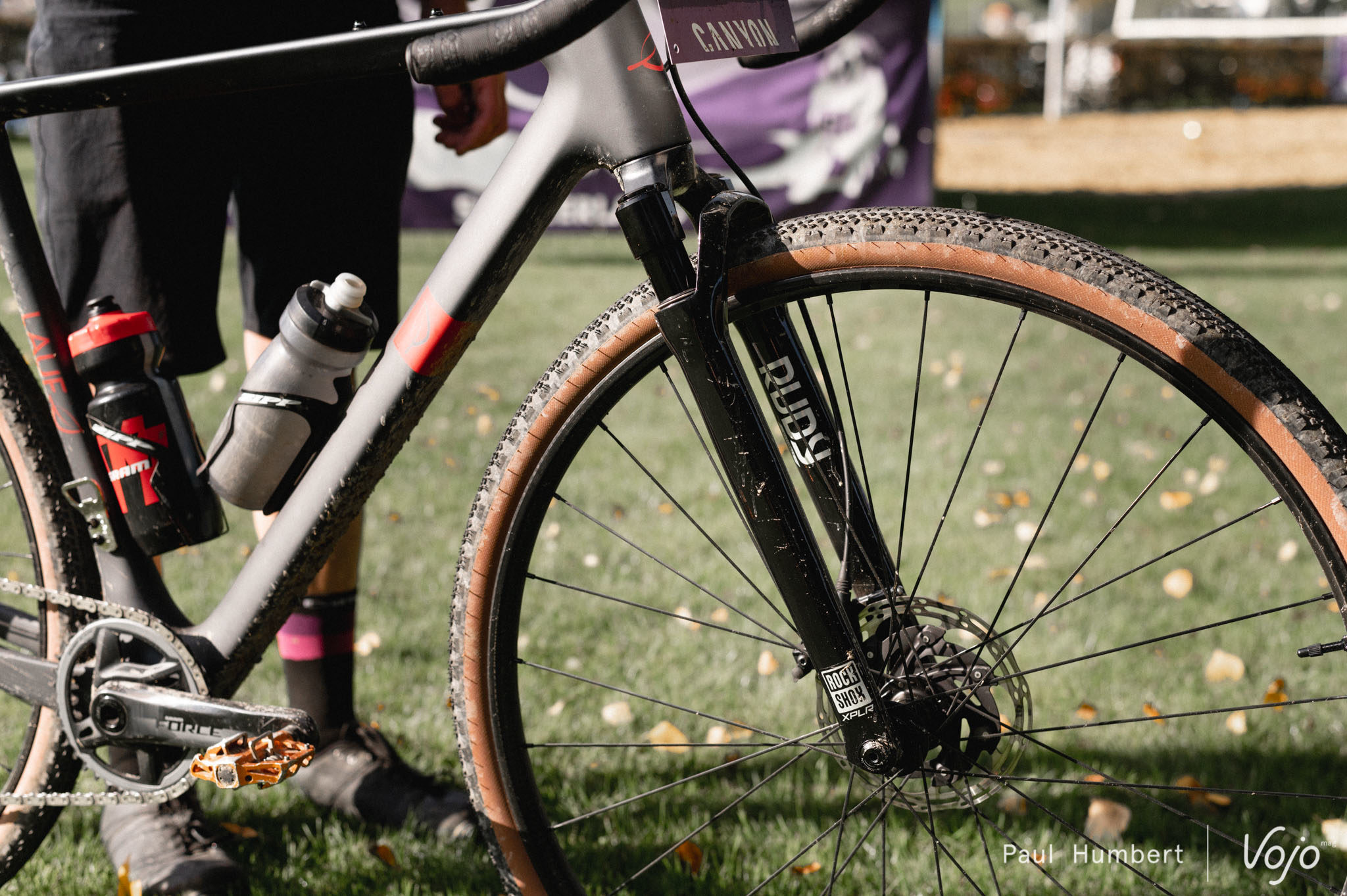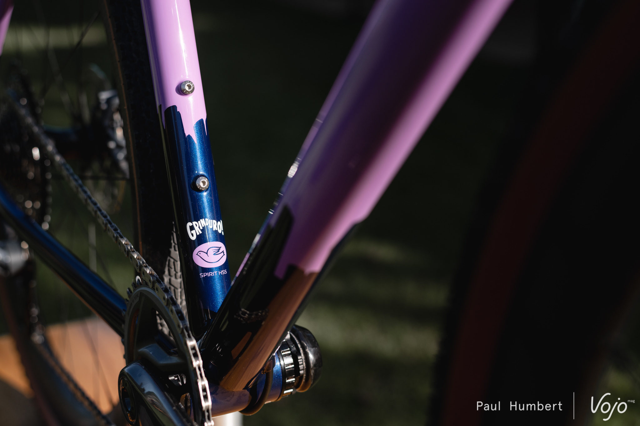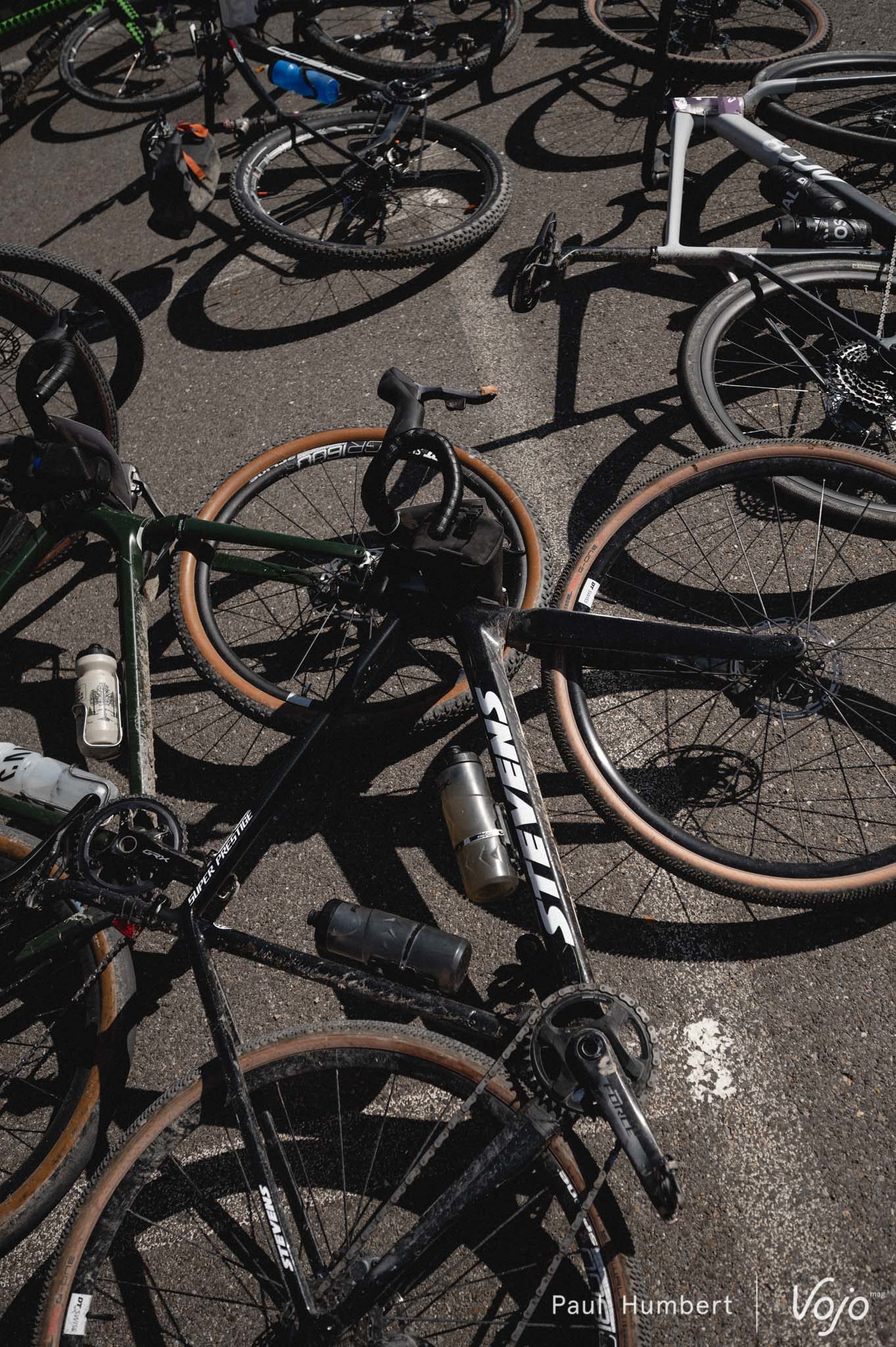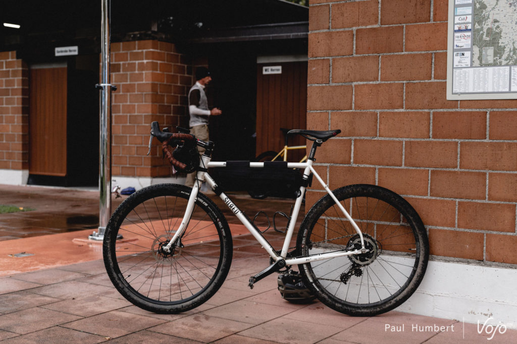 Diversité des pratiquants, et diversité des machines bien sûr ! L’organisation du Grinduro n’est pas sectaire, le règlement précise qu’on peut utiliser « n’importe quel vélo propulsé par des pédales » (seuls les VAE ne sont pas autorisés). On a ainsi vu de l’acier, de l’aluminium, du titane et du carbone, du cintre plat, des tiges de selles télescopiques, des freins cantilevers comme des freins à disques, deux singlespeed (sacré motivation vu le terrain), du pneu de 33 mm comme du 52 mm, quelques VTT tout-suspendus, des montages improbables mais attirants comme ce Santa Cruz Highball équipé d’une RockShox Sid et d’un cintre gravel (au format route mais plus évasé et beaucoup plus large)…