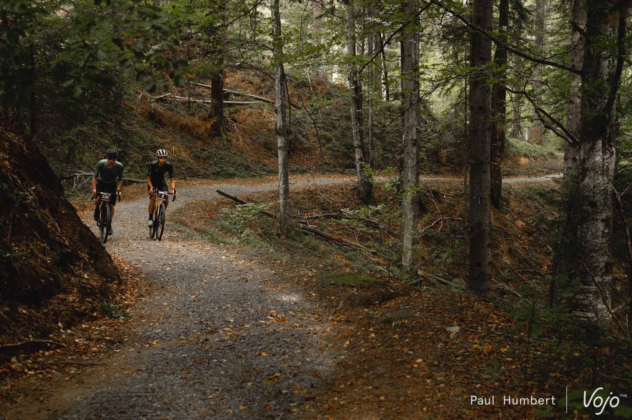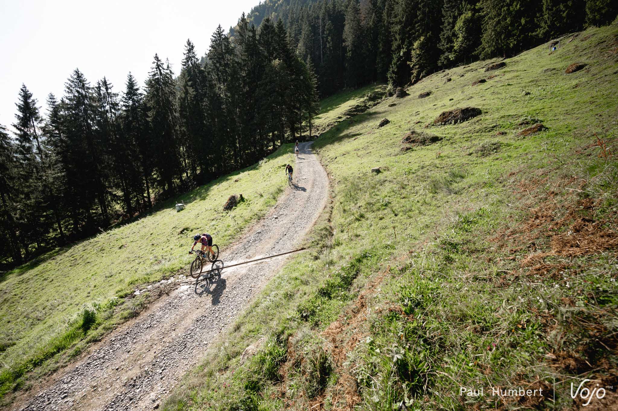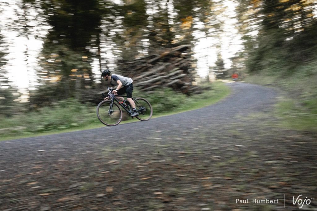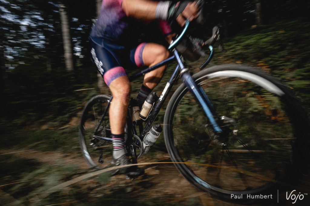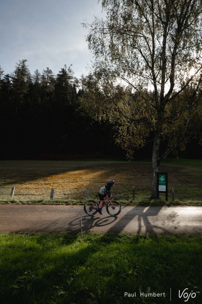 La spéciale est courte, seulement 1,1 km mais cela ne la rend pas facile pour autant puisqu’elle ne fait que monter et que le dénivelé est bien présent : 120 m, ce qui donne un pourcentage moyen supérieur à 10 %. Le chemin large se transforme vite en singletrack caillouteux alors que la pente tourne plutôt autour de 15-16 % puis on entre dans la forêt, mais les choses ne s’améliorent pas. Un passage de racines qui serait déjà un peu technique en VTT oblige à descendre du vélo et courir sur quelques mètres, #cyclocross, puis il faut franchir deux petits ponts en bois avec une marche à la montée et à la descente.