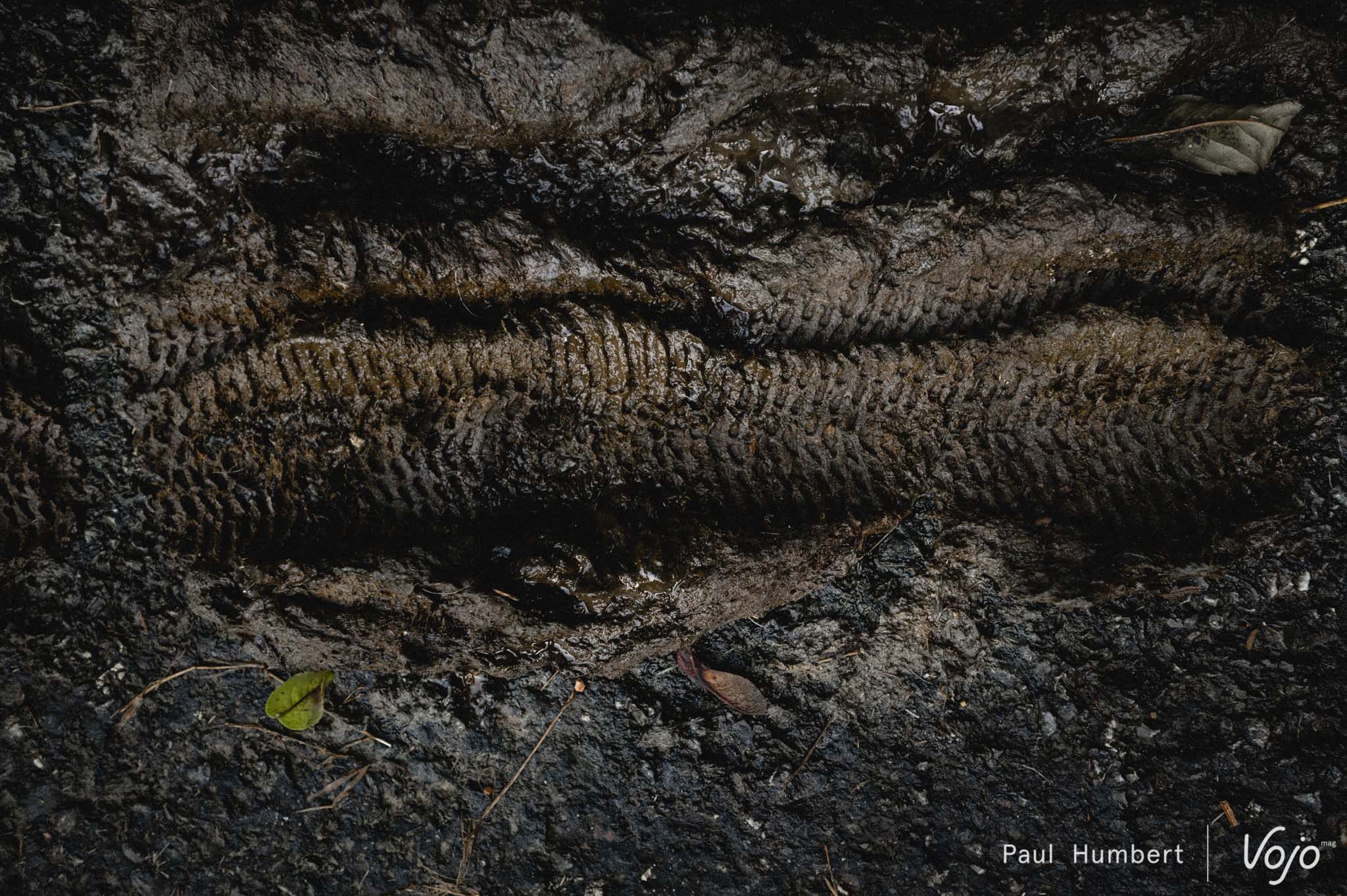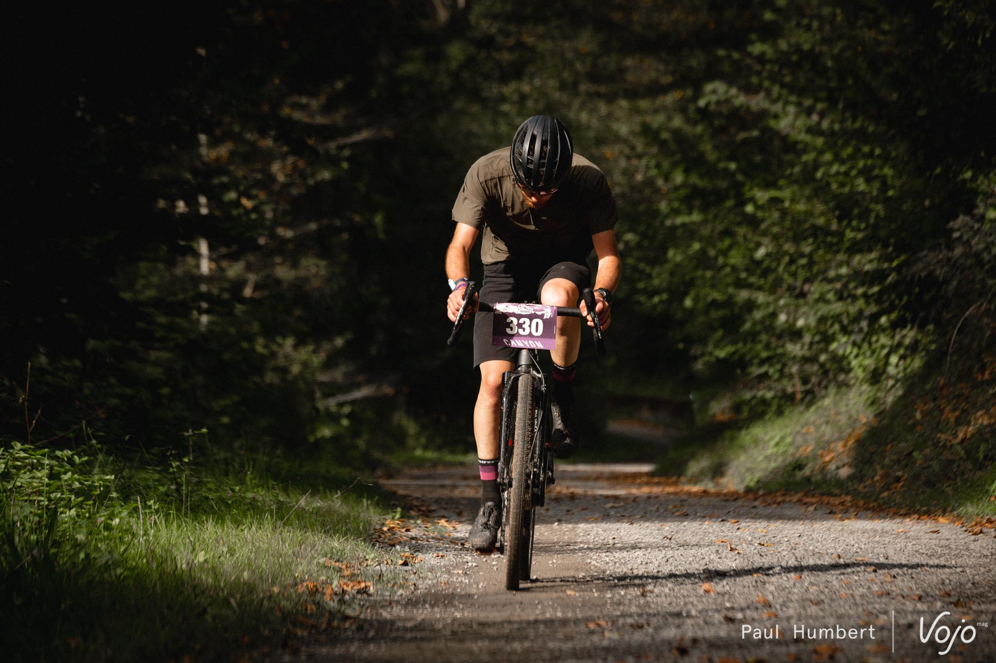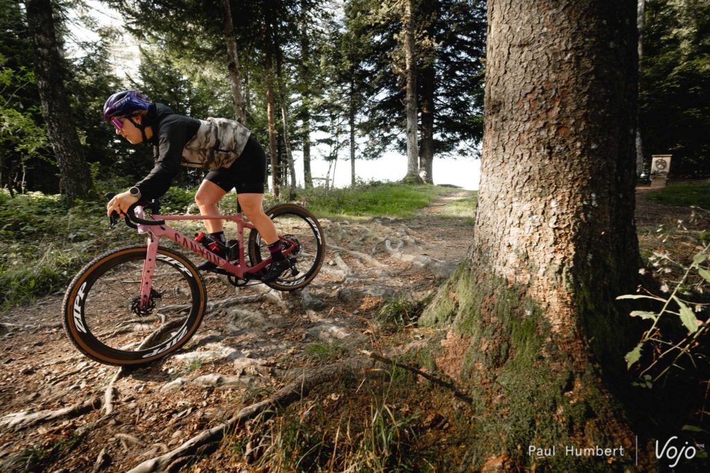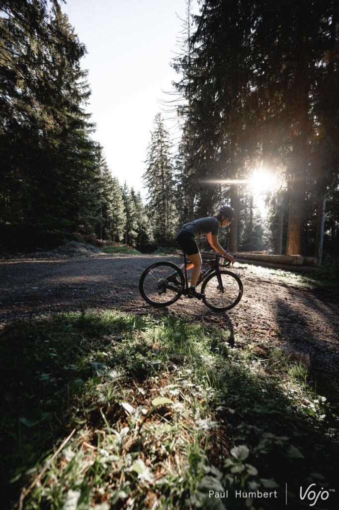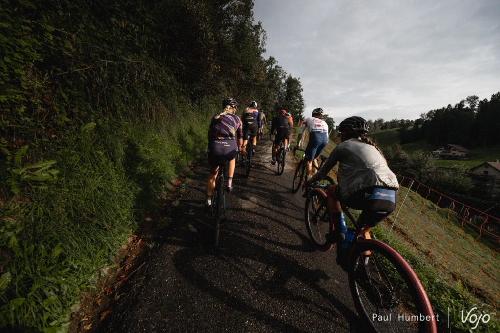La spéciale est courte, seulement 1,1 km mais cela ne la rend pas facile pour autant puisqu’elle ne fait que monter et que le dénivelé est bien présent : 120 m, ce qui donne un pourcentage moyen supérieur à 10 %. Le chemin large se transforme vite en singletrack caillouteux alors que la pente tourne plutôt autour de 15-16 % puis on entre dans la forêt, mais les choses ne s’améliorent pas. Un passage de racines qui serait déjà un peu technique en VTT oblige à descendre du vélo et courir sur quelques mètres, #cyclocross, puis il faut franchir deux petits ponts en bois avec une marche à la montée et à la descente.