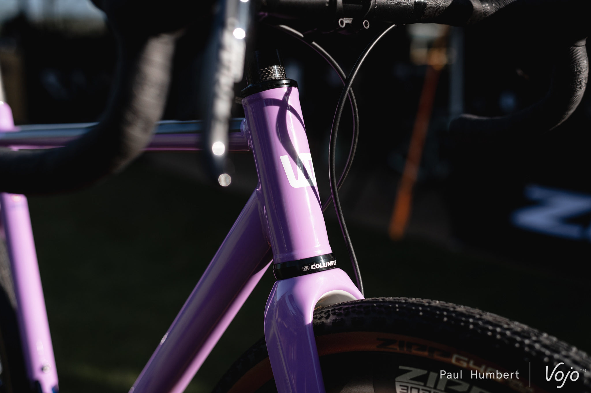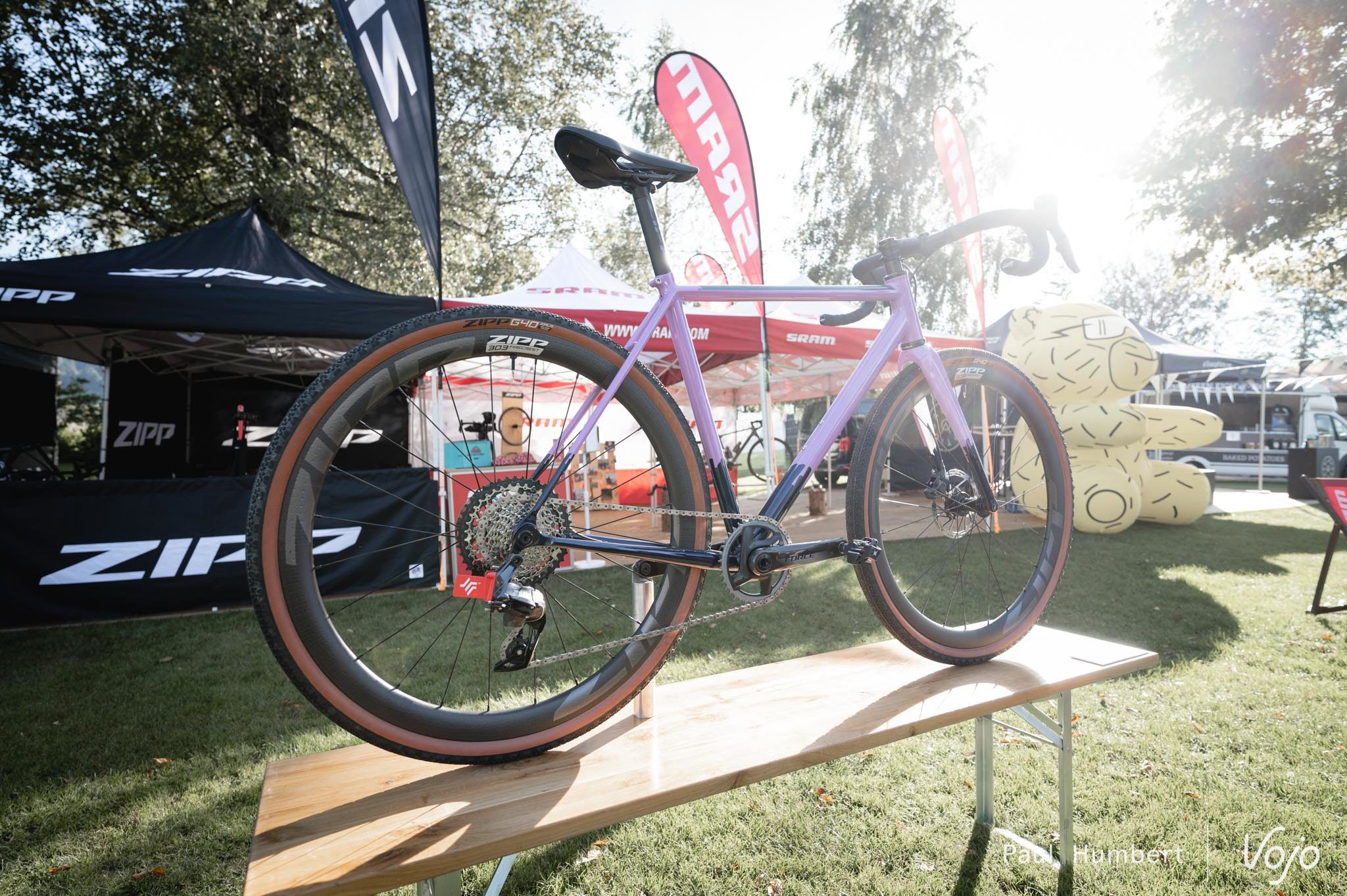 L’exposition de modèles en acier, sponsorisée par le célèbre fabricant italien de tube Colombus, est toujours là et on remarque notamment ce joli WishOne, une petite marque française, peint aux couleurs du Grinduro.