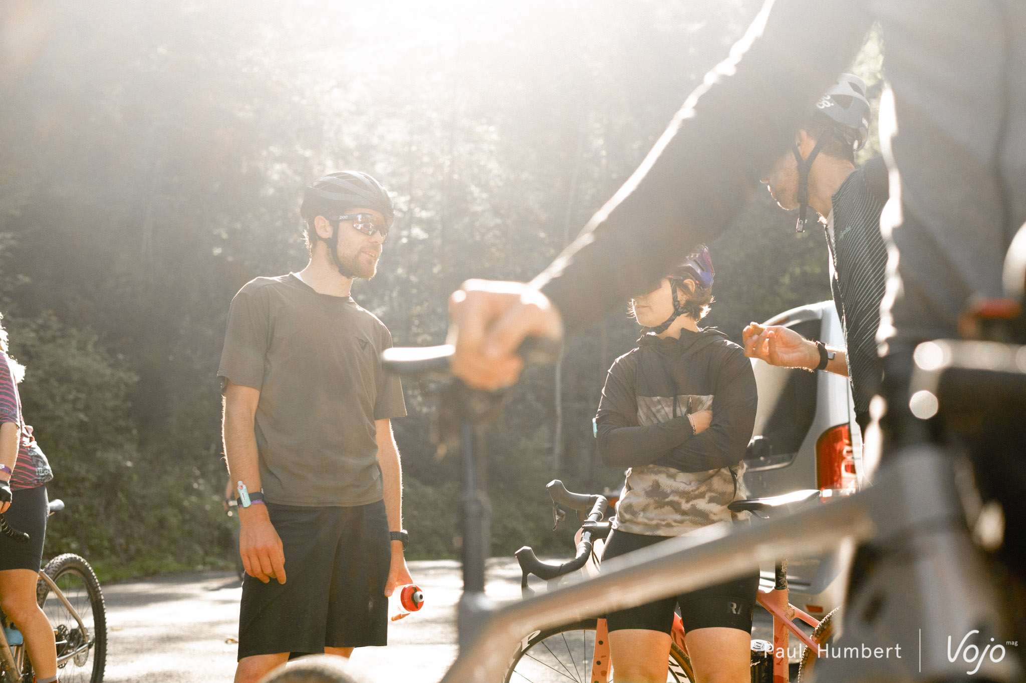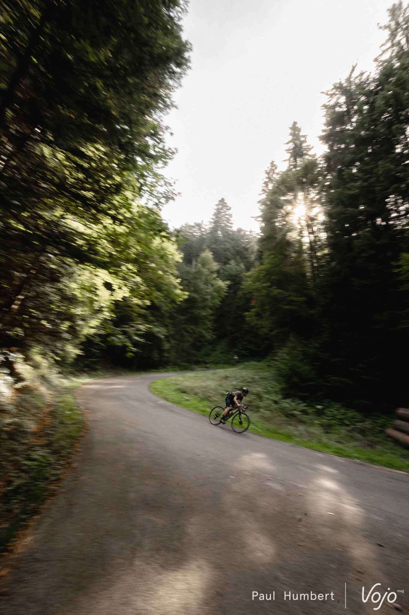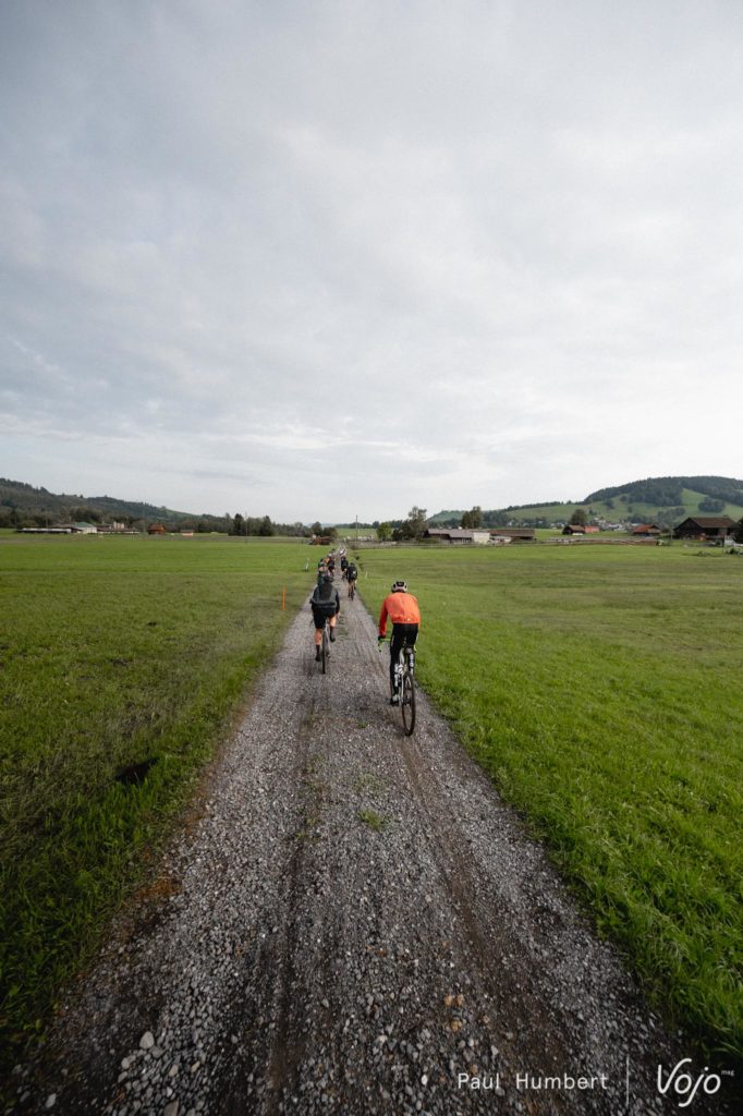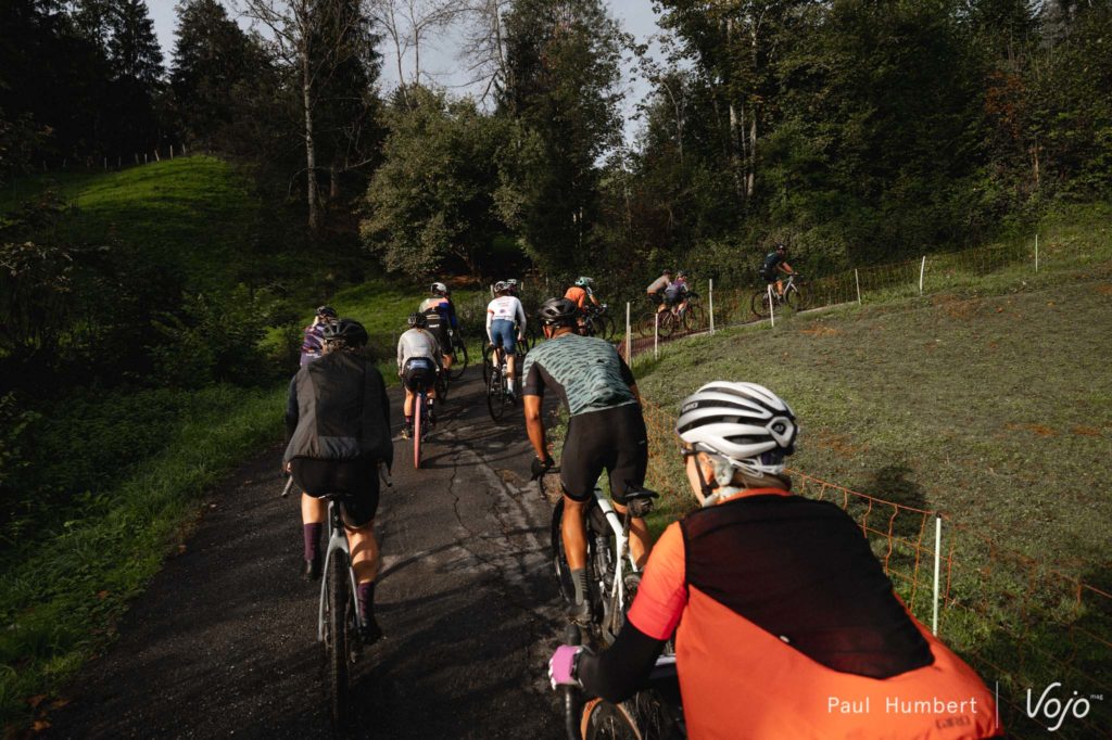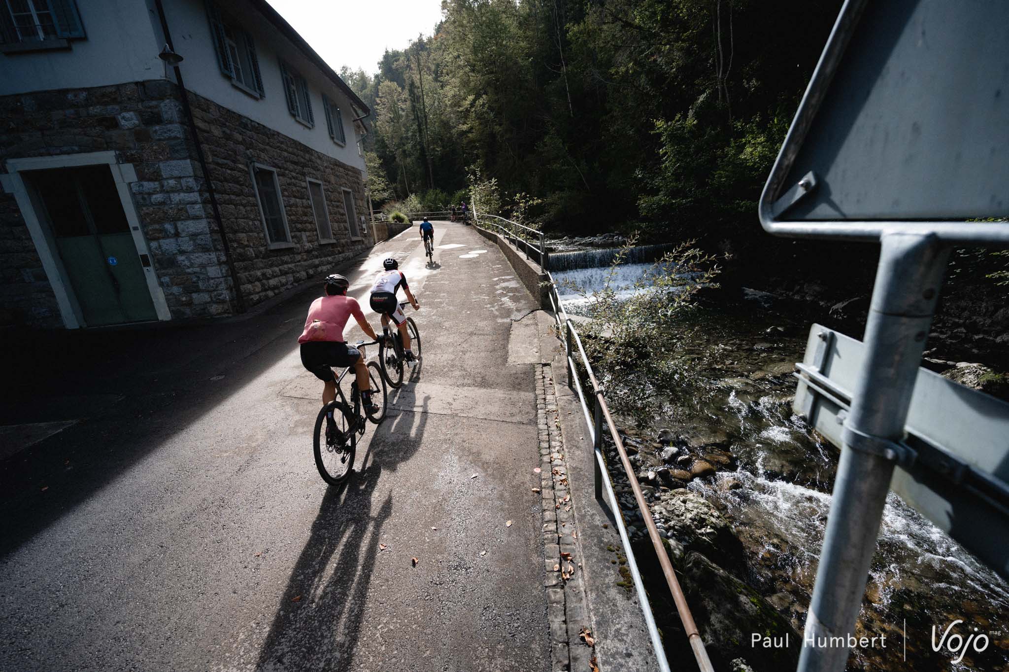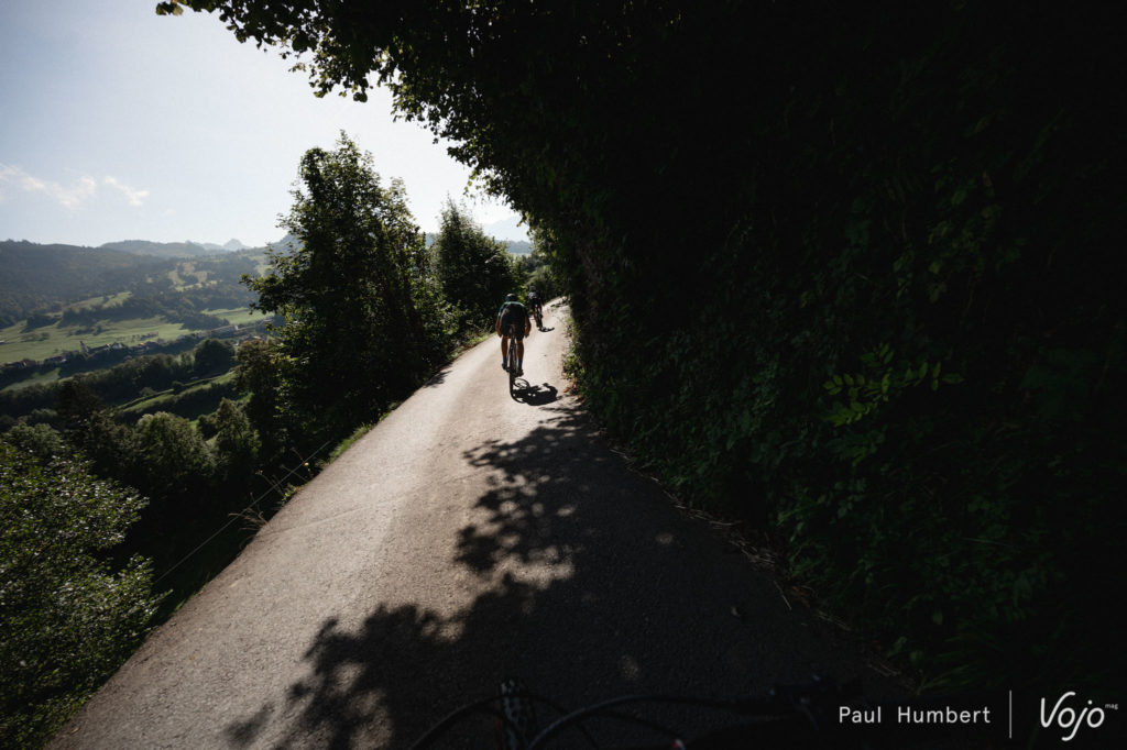 De petits pelotons se forment assez rapidement, en fonction des jambes de chacun dans les bosses du début de parcours. Rouler en groupe, c’est toujours plus sympa et ça permet aussi de s’économiser sur les parties roulantes car ce sont tout de même un peu plus de 93 km et 2600 m de dénivelé qui nous attendent aujourd’hui.