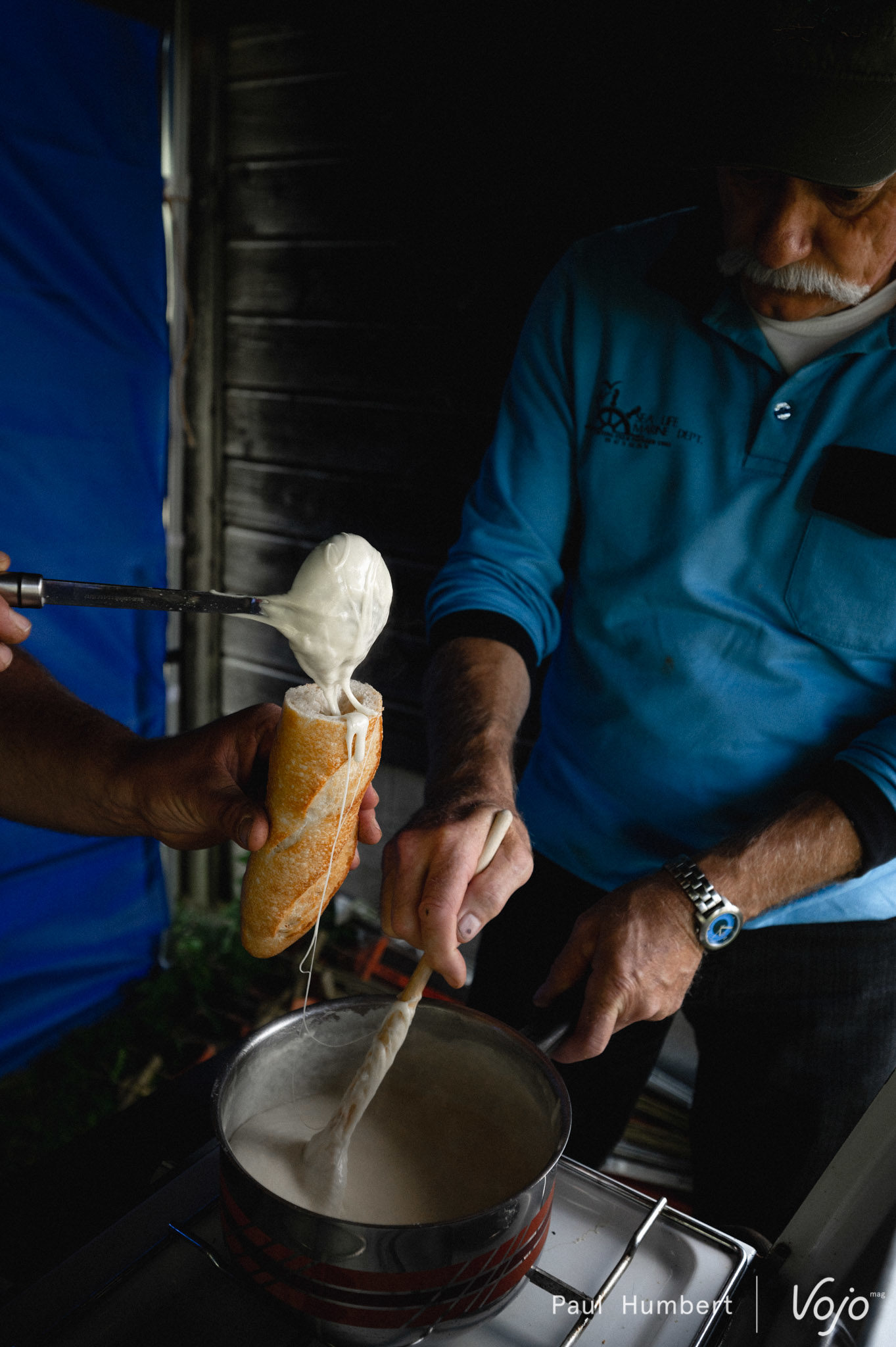 Après les efforts de la matinée, la faim commence à se faire sentir et ça tombe bien puisque l’organisation nous a préparé un « repas de midi » en deux parties sur cette longue transition. Première étape pour nous mettre en appétit, en haut de la montée la plus raide de la journée avec une section sur des plaques de béton avoisinant les 20 %, le « Fondue Stop ». Prenez une demi-baguette, faites un trou au milieu, glissez-y tout le fromage fondu que vous pouvez et voilà, vous avez un Hot Dog version Grinduro Switzerland.