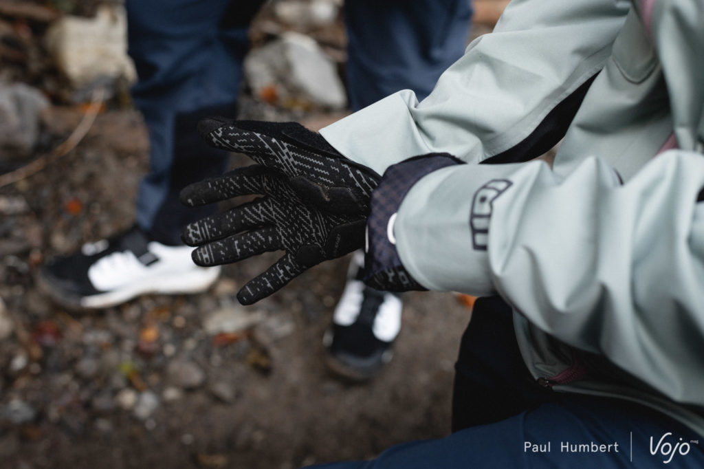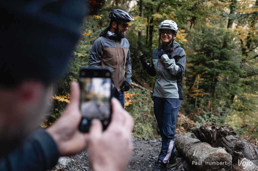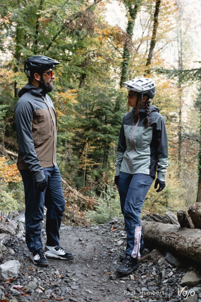 Changement de tenue : Paulin et Débi enfilent la Shelter Jacket 4W Softshell (159,99€) qui sera plus chaude mais seulement déperlante et coupe-vent, et non étanche. Pour le bas, Débi passe en short avec le Traze AMP AFT (129,99€) et Paulin enfile le pantalon Scrub AMP BAT (179,99€) qui est renforcé par endroits avec du Cordura.