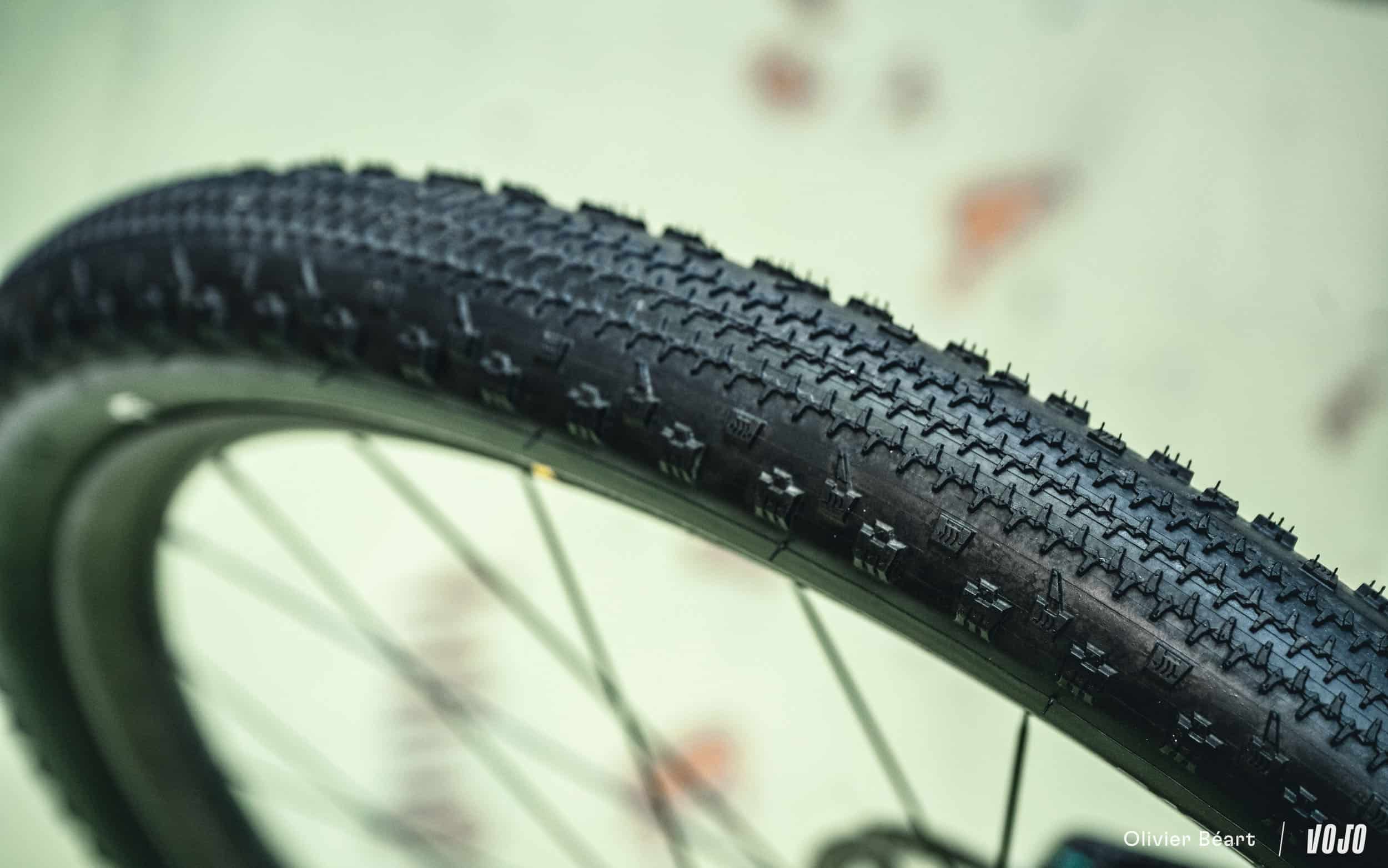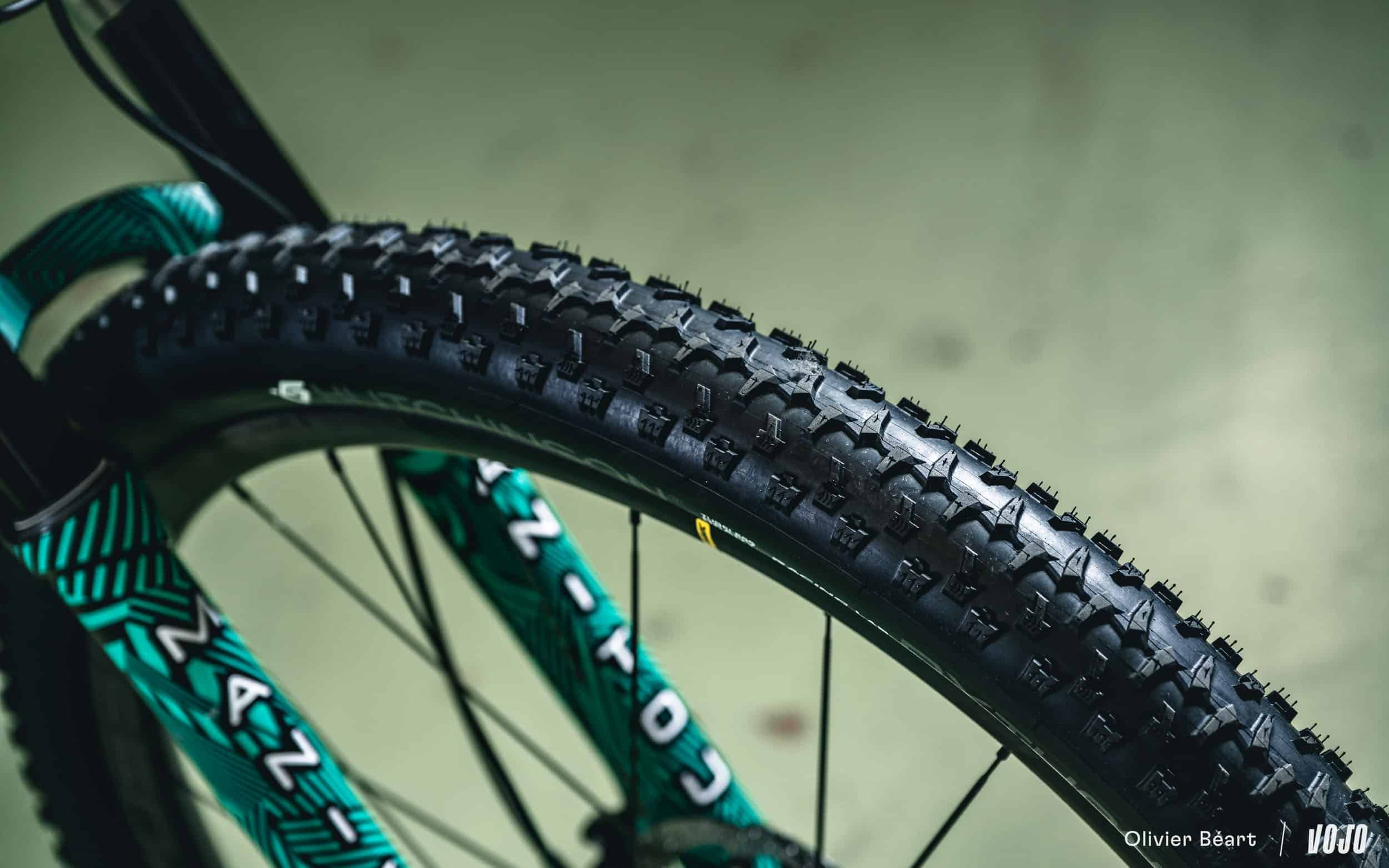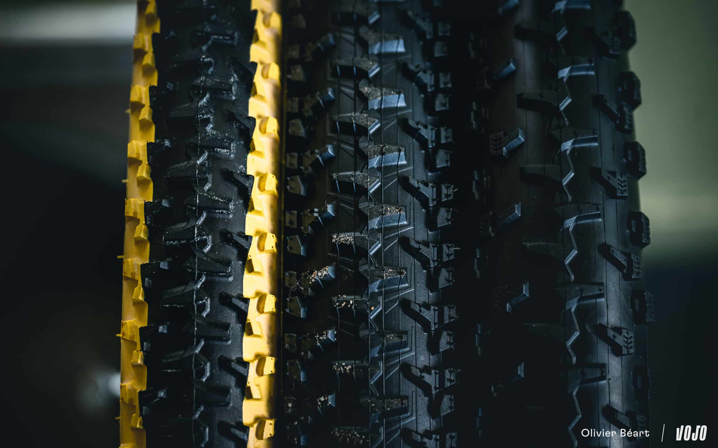 « Nous avons fait un pneu un poil plus rond que le Python originel, avec une transition plus progressive entre la bande centrale et les crampons latéraux qui sont plus bas et qui jouent beaucoup sur les basses pressions pour être efficaces et agripper les reliefs. On a aussi ajouté des lamelles pour qu’ils se déforment mieux, et surtout les meilleures gommes issues de nos dernières recherches, » poursuit Guillaume Trouvain.
