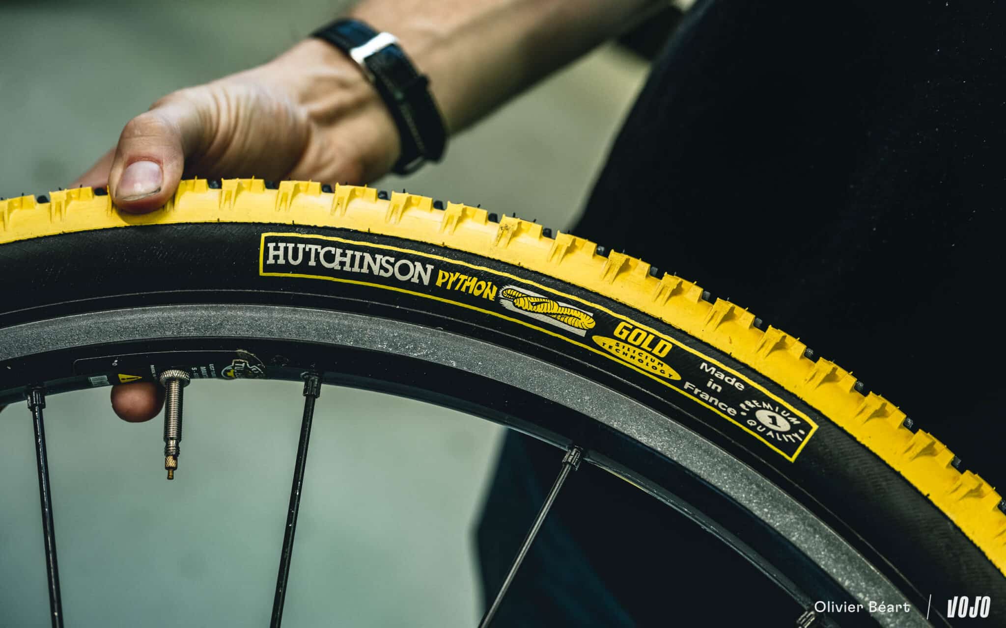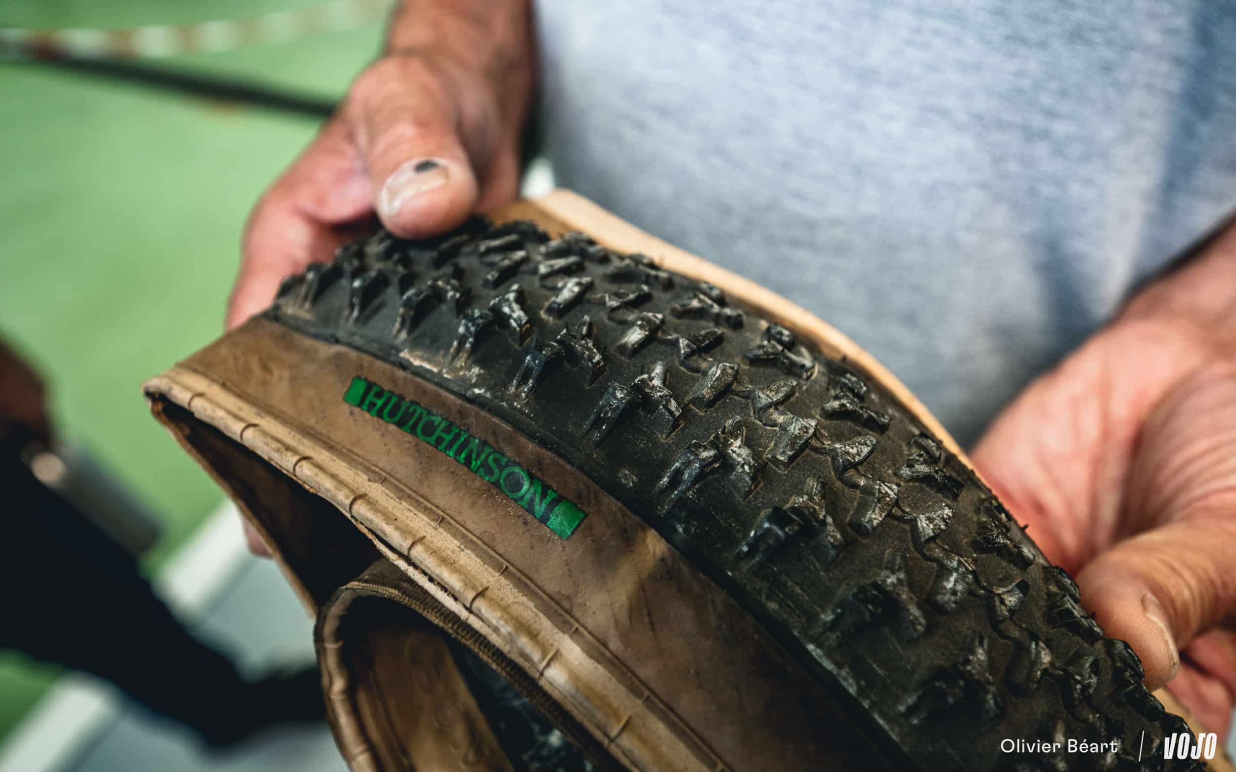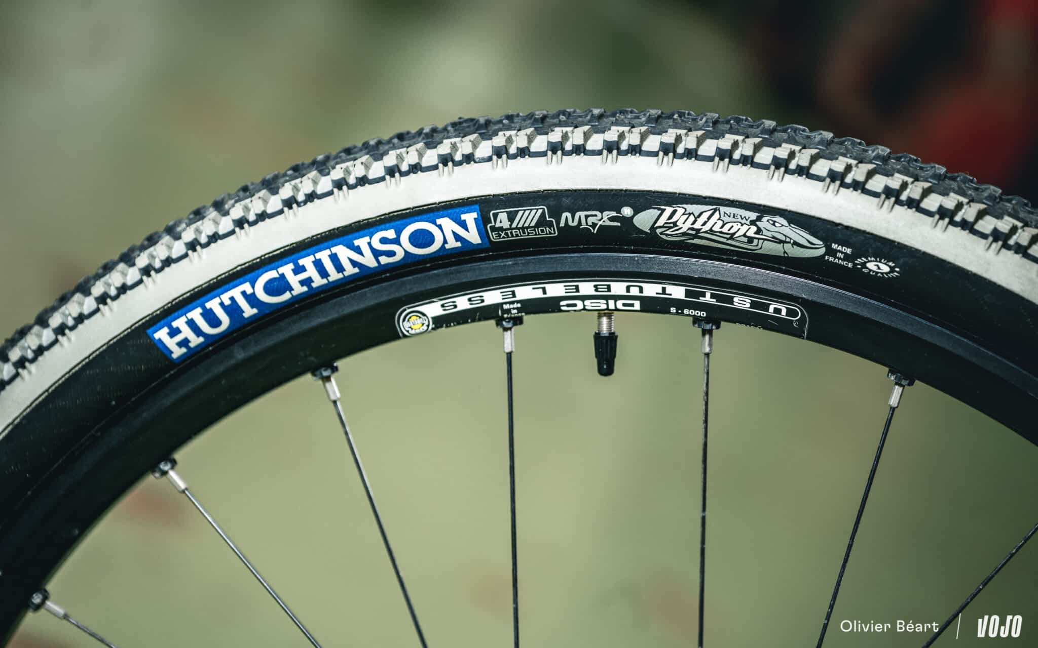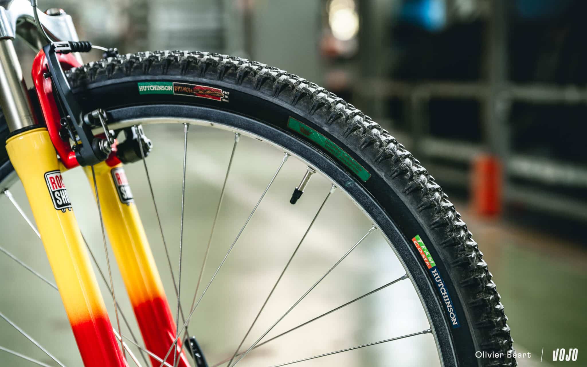 Il était monté d’origine avec des Python tubeless UST à liserés gris. « C’était une couleur très difficile à obtenir. Il fallait mettre une pâte d’aluminium dans la gomme. Au départ, les chimistes nous disaient que ce n’était pas possible… mais au final, ils ont quand même réussi. C’est un bon exemple de la force d’Hutchinson, qui appartient à un très grand groupe avec énormément de ressources en interne. Et si le design du Python a très peu évolué sur les 10/15 premières années de son existence, la gomme, elle, avait fait d’énormes progrès. »