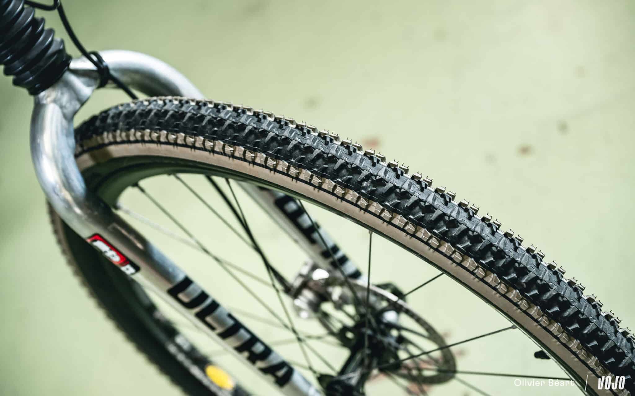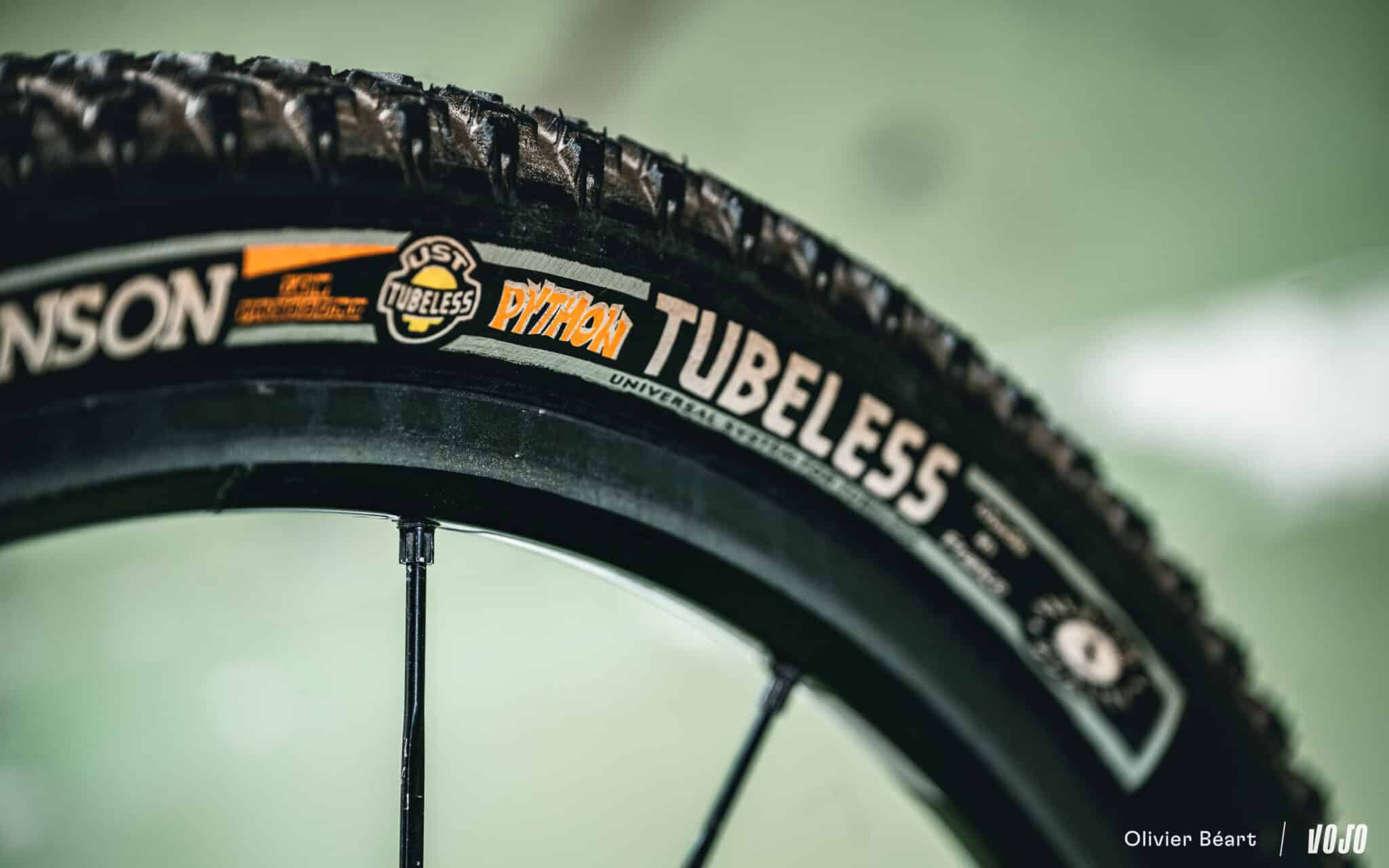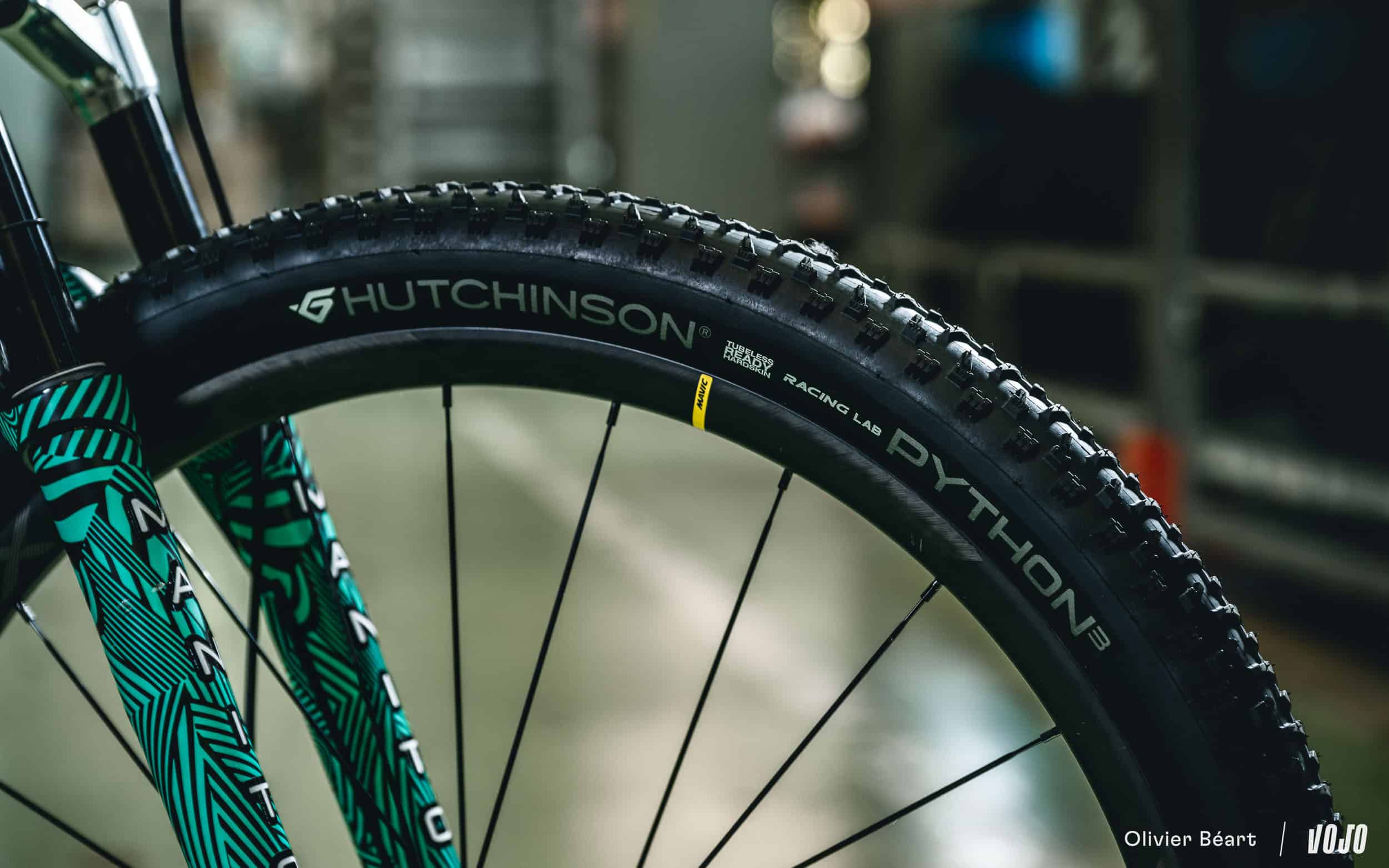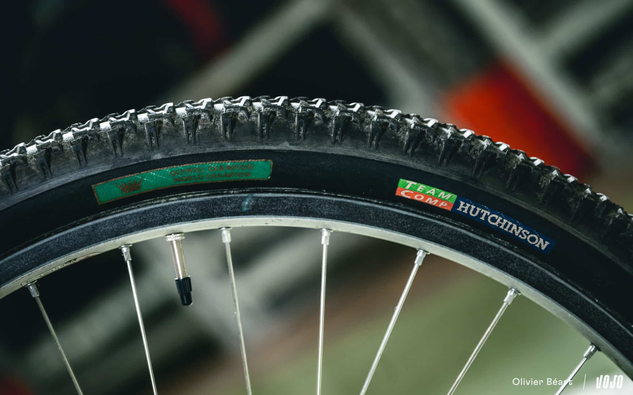 Il était monté d’origine avec des Python tubeless UST à liserés gris. « C’était une couleur très difficile à obtenir. Il fallait mettre une pâte d’aluminium dans la gomme. Au départ, les chimistes nous disaient que ce n’était pas possible… mais au final, ils ont quand même réussi. C’est un bon exemple de la force d’Hutchinson, qui appartient à un très grand groupe avec énormément de ressources en interne. Et si le design du Python a très peu évolué sur les 10/15 premières années de son existence, la gomme, elle, avait fait d’énormes progrès. »