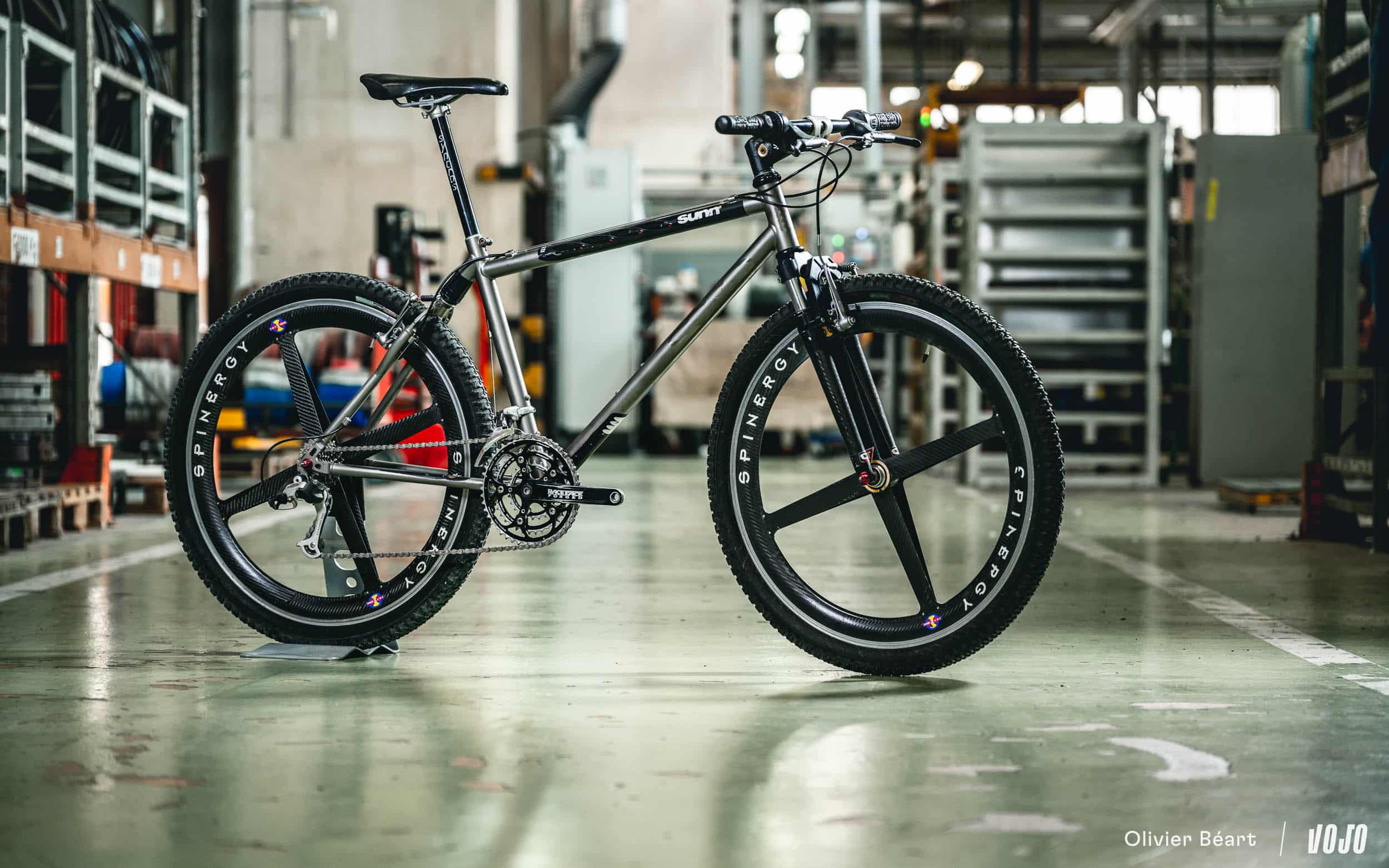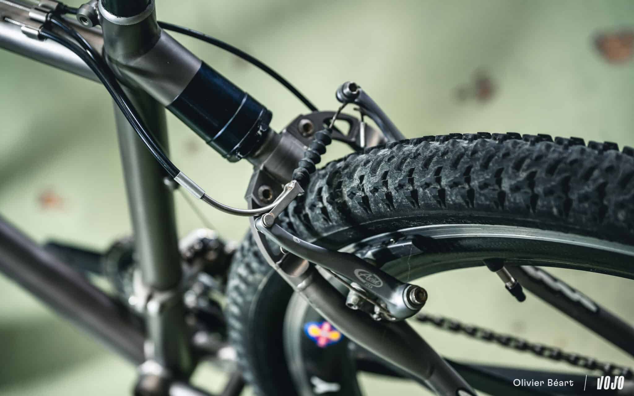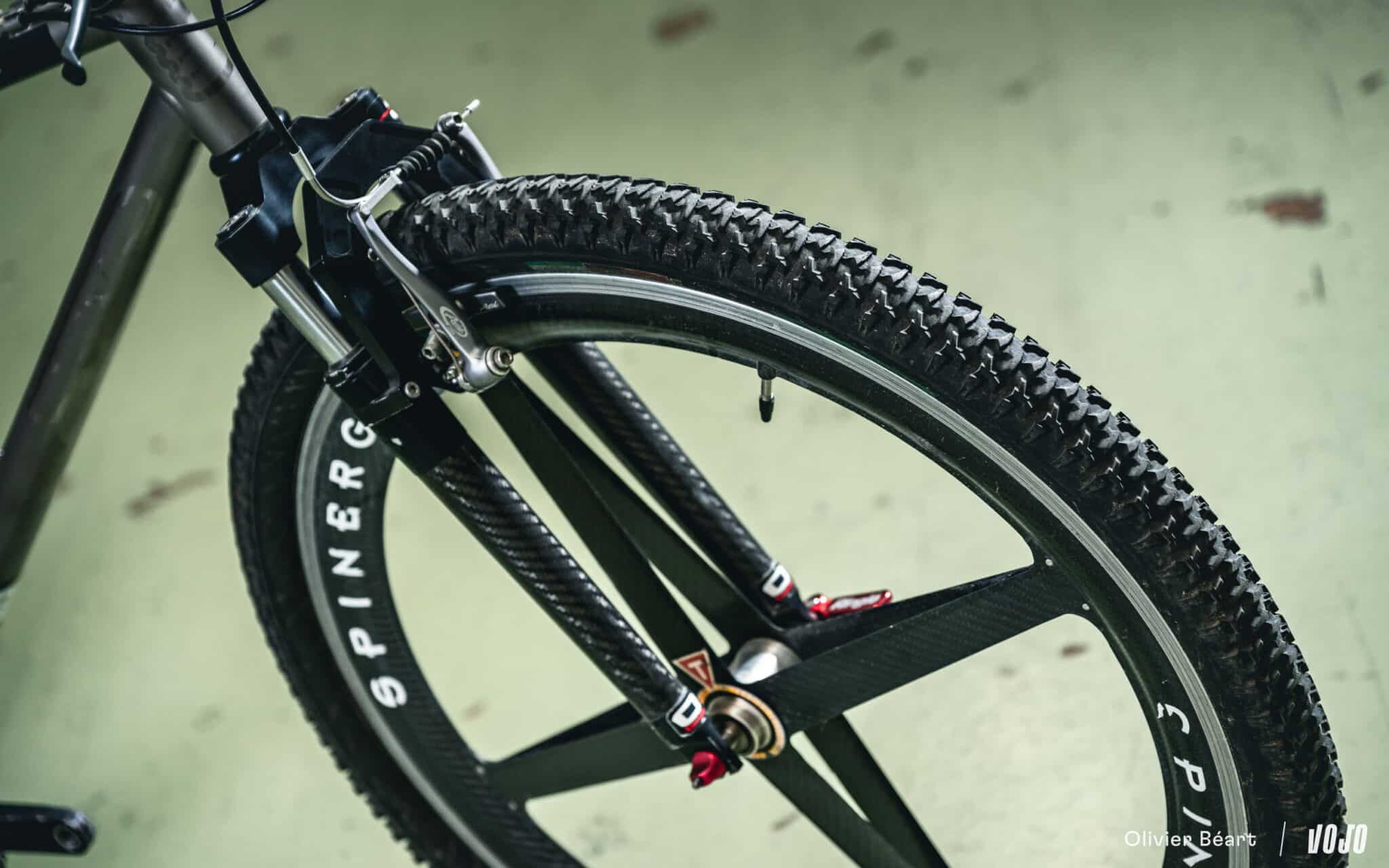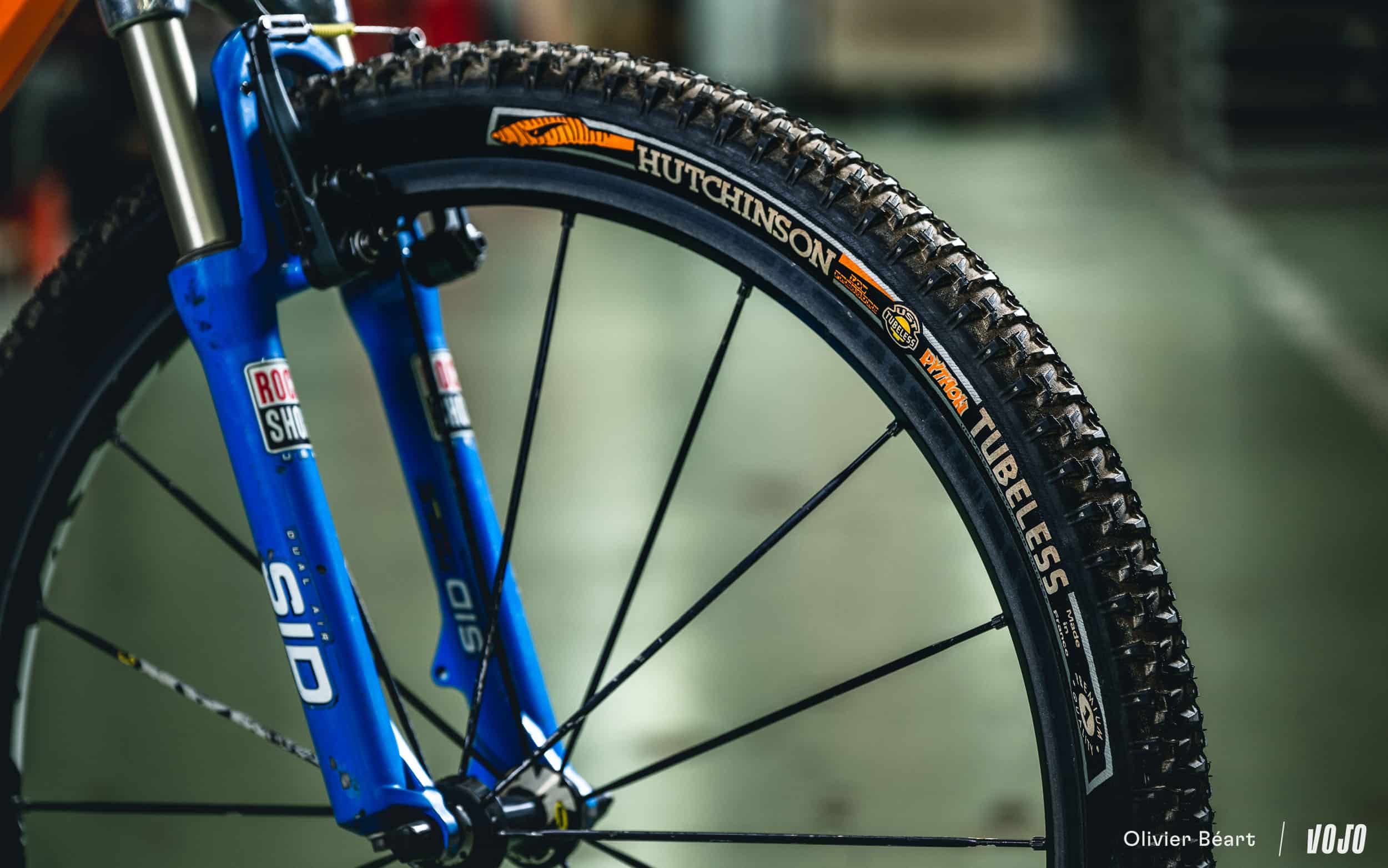 Il était monté d’origine avec des Python tubeless UST à liserés gris. « C’était une couleur très difficile à obtenir. Il fallait mettre une pâte d’aluminium dans la gomme. Au départ, les chimistes nous disaient que ce n’était pas possible… mais au final, ils ont quand même réussi. C’est un bon exemple de la force d’Hutchinson, qui appartient à un très grand groupe avec énormément de ressources en interne. Et si le design du Python a très peu évolué sur les 10/15 premières années de son existence, la gomme, elle, avait fait d’énormes progrès. »