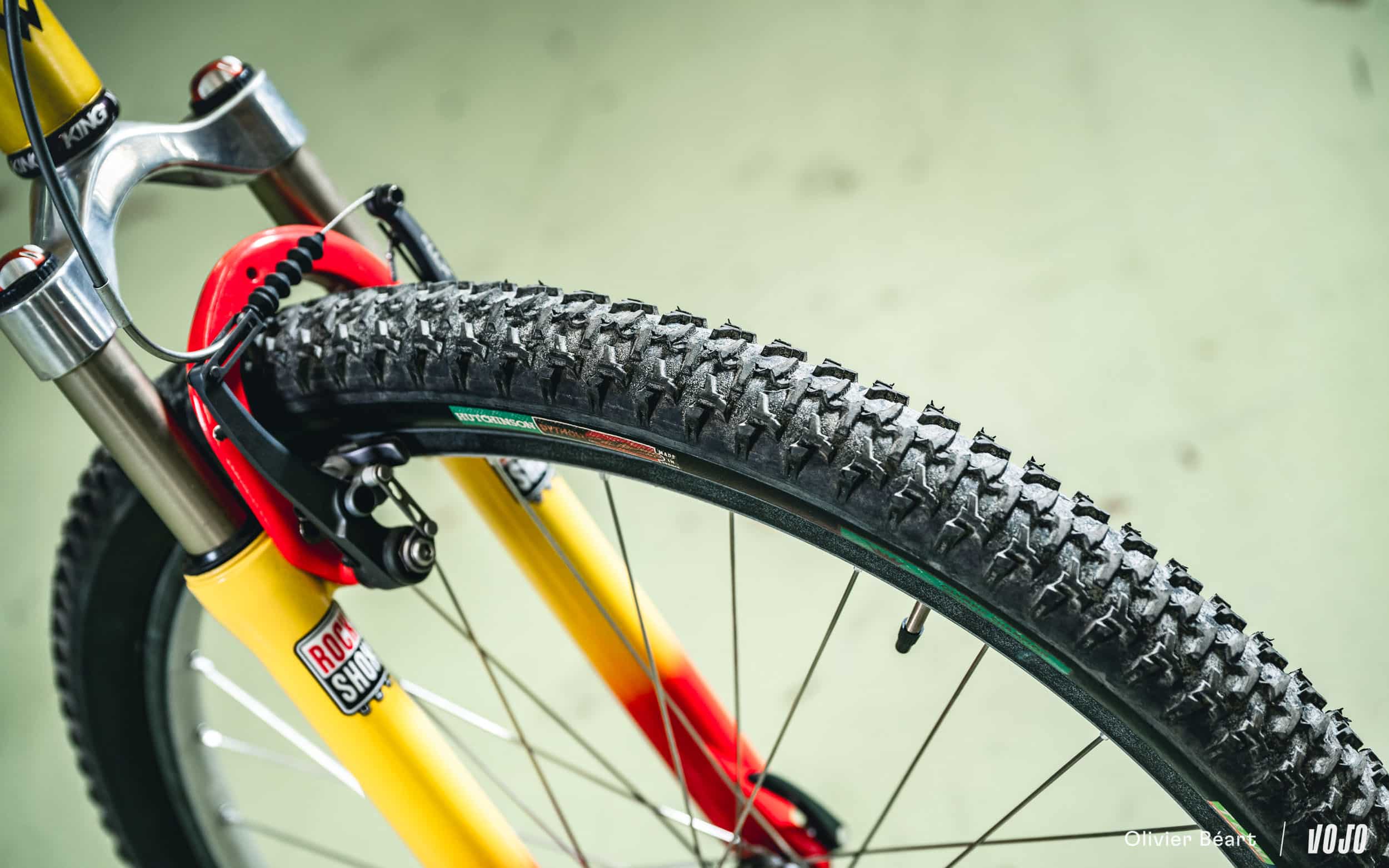 Il est équipé du fameux Python Gold à flancs jaunes, dont Norbert nous explique la genèse : « Nous avions déjà fait des pneus colorés pour le BMX et des vélos de grande distribution. Mais dans le haut de gamme, c’était un beau challenge de marier des gommes différentes sur une même carcasse. Personne ne l’avait jamais fait dans le VTT haut de gamme et c’est parti d’un défi de techniciens. Puis, quand on en a parlé au marketing, ils ont adoré et nous avons eu le feu vert de la direction pour récupérer une machine servant à la base pour des pneus de moto. C’était juste une histoire d’esthétique, mais ça a marqué les esprits et encore plus assis la réputation du Python. »